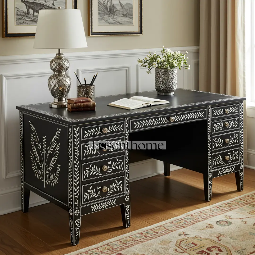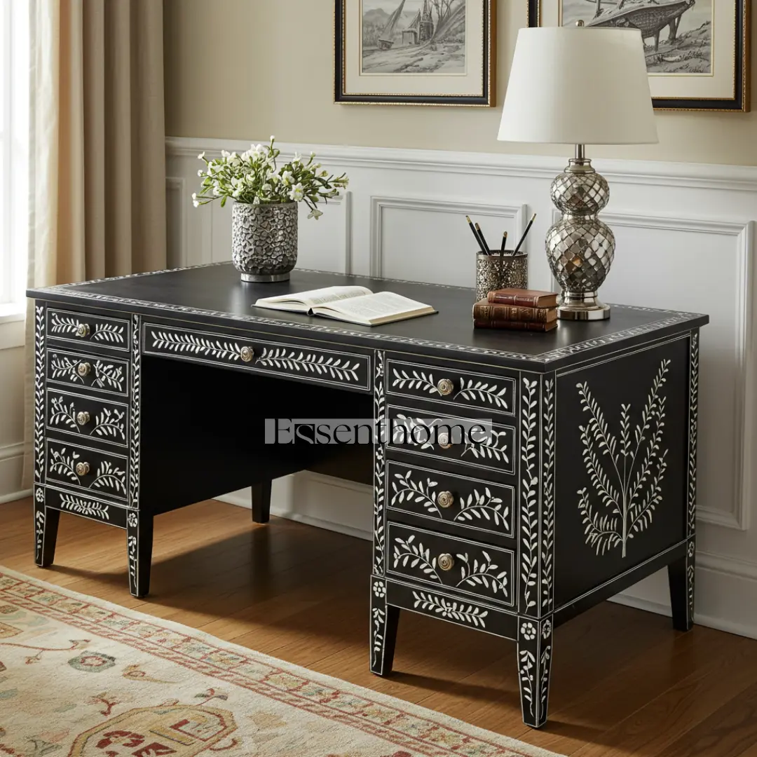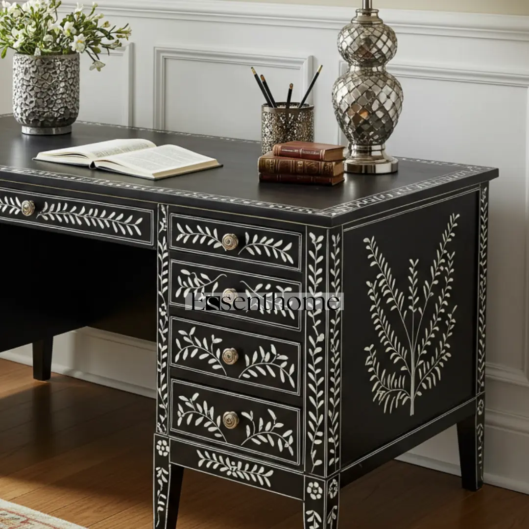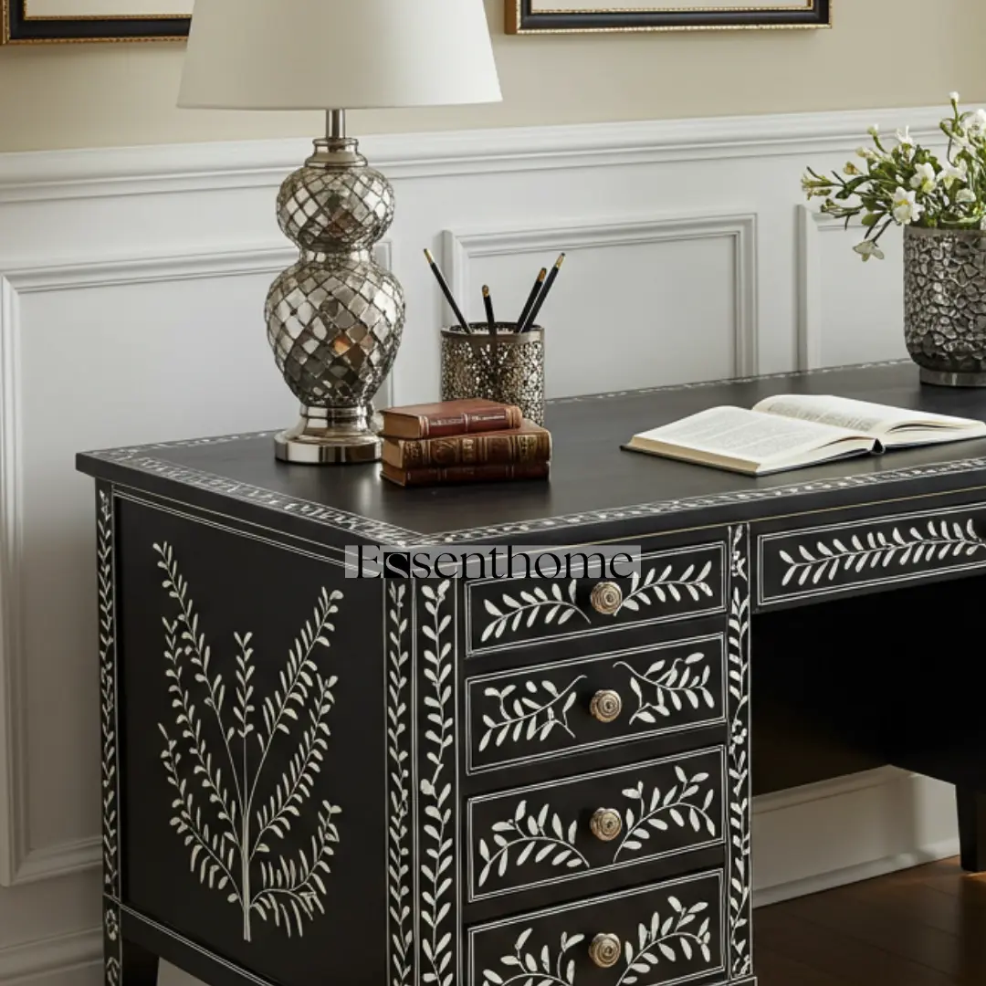 Bring sophistication, style, and function to your home office with this Black Bone Inlay Writing Desk, a statement piece that combines utility with timeless aesthetic appeal.