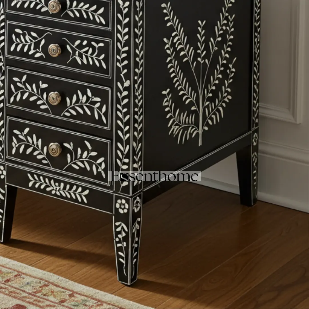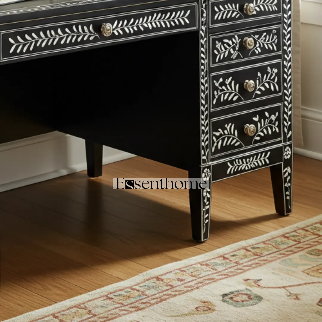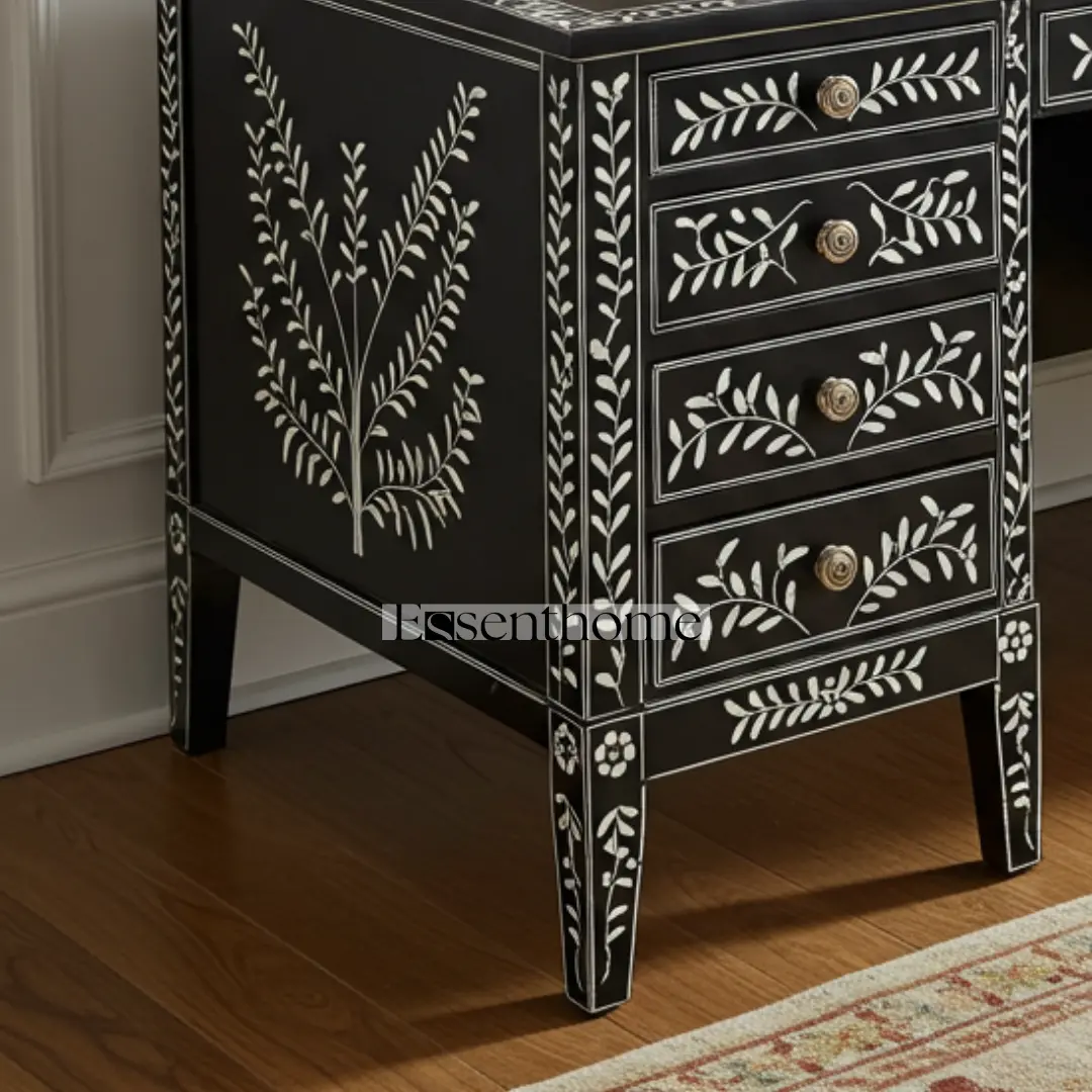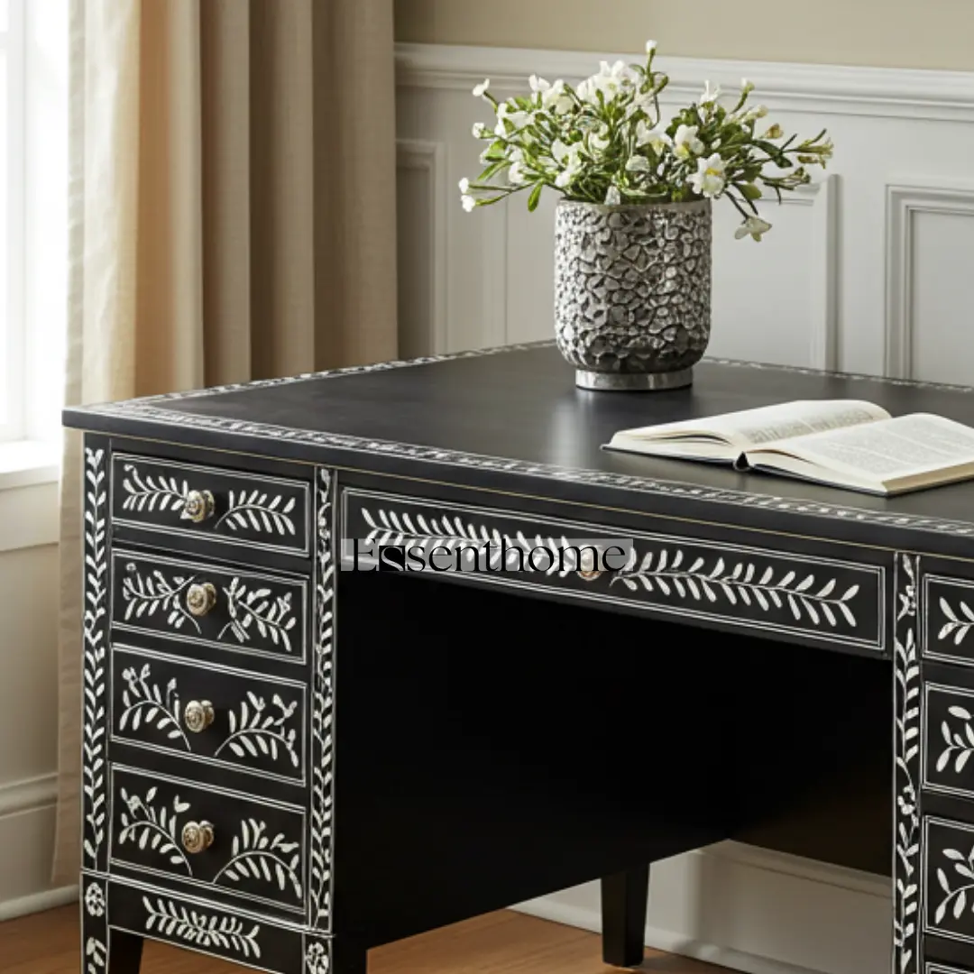 Elevate your workspace with the Black Bone Inlay Writing Desk, a stunning combination of craftsmanship and functionality. Handcrafted by skilled artisans, this desk features a bold black resin surface adorned with intricate white bone inlay in a delicate floral vine pattern. Each piece of bone is ethically sourced, carefully cut, and inlaid by hand to create a refined, eye-catching design.