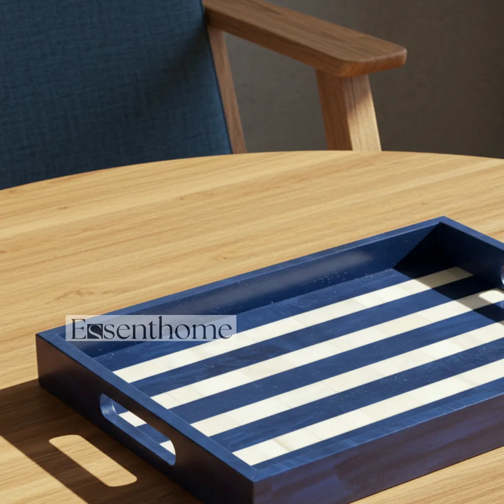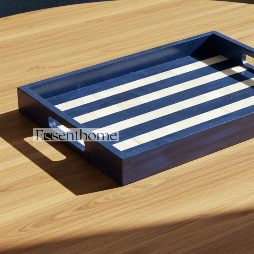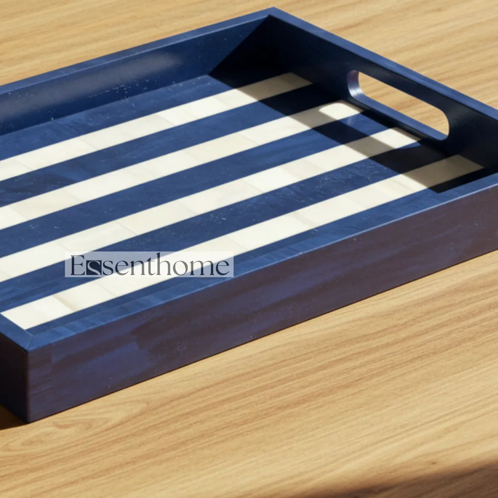 Add a touch of artisanal elegance to your home with this handcrafted Bone Inlay Serving Tray. Featuring a striking blue and white striped design, this wooden tray is meticulously handcrafted by skilled artisans, making each piece unique. The sturdy handles provide easy carrying, making it perfect for serving drinks, snacks, or displaying decor. Its lightweight yet durable construction ensures functionality without compromising on style. Ideal for kitchens, dining tables, or as a decorative centerpiece, this tray blends traditional craftsmanship with contemporary charm furniture.