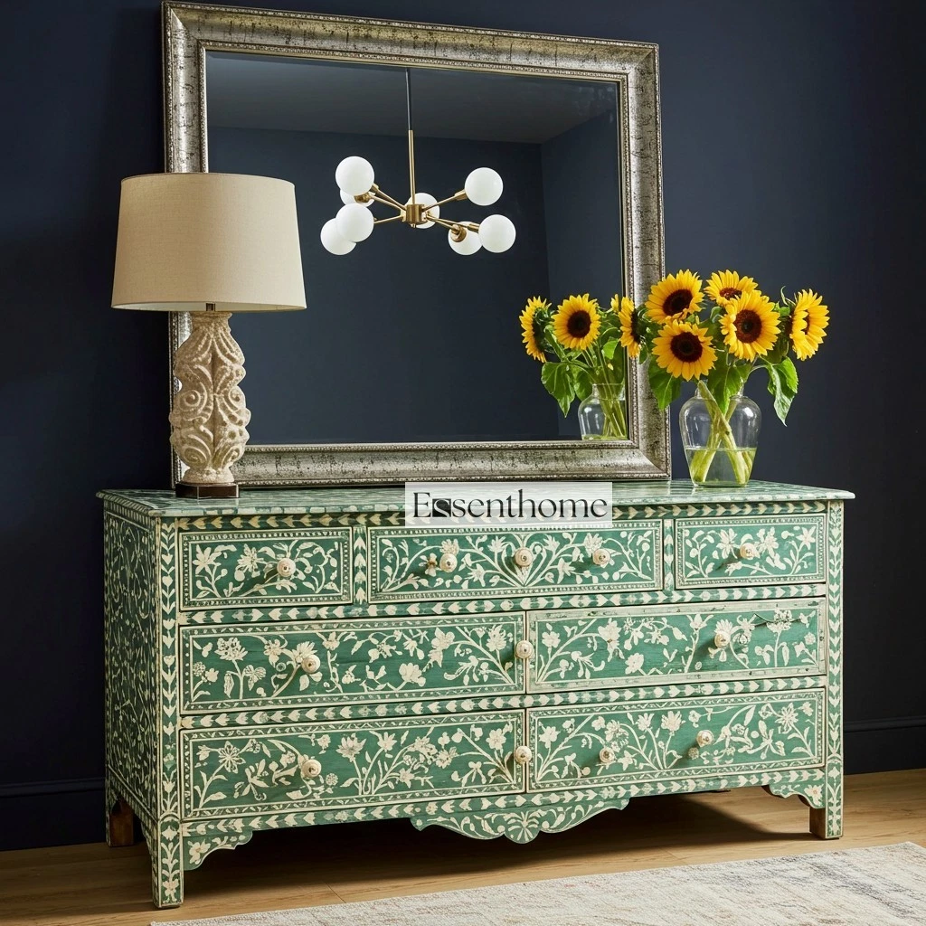 The dresser’s rich green finish adds a refreshing pop of color that suits a variety of decor styles. Whether your space leans boho, classic, or modern, this piece blends in beautifully. The floral inlay enhances vintage-inspired interiors and offers elegant contrast in minimalist spaces.