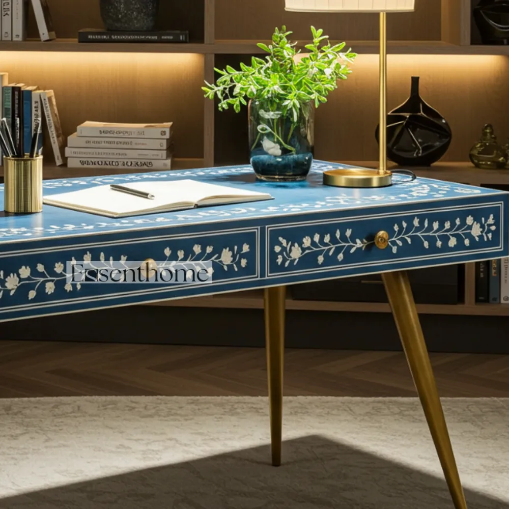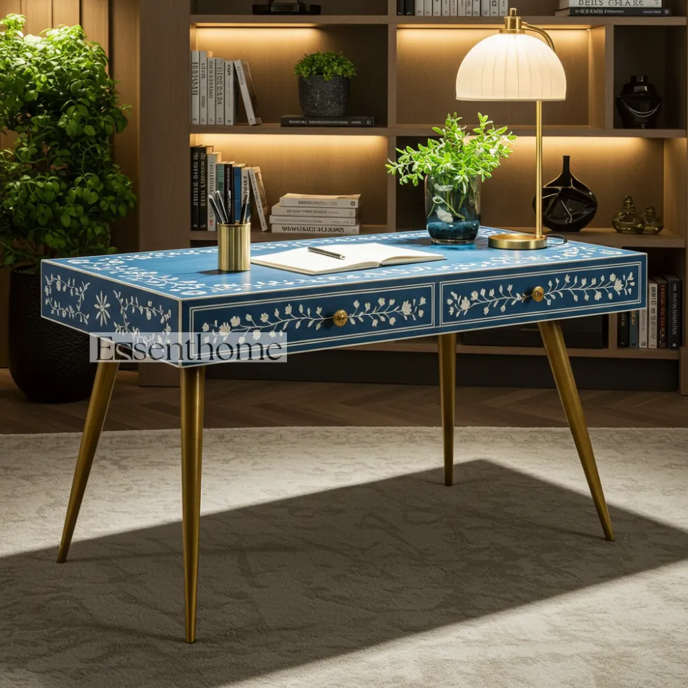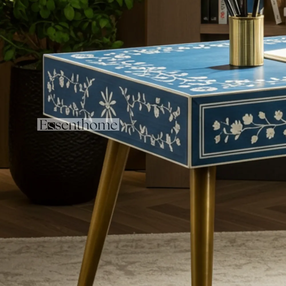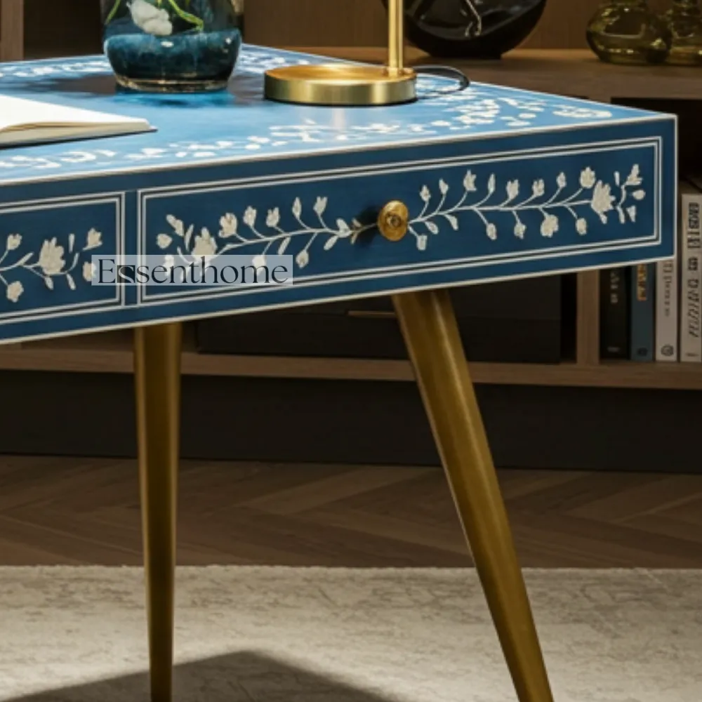 Bring a touch of elegance and global style to your home with this stunning Bone Inlay Writing Desk. Each desk is a unique piece of art, meticulously handcrafted with ethically sourced bone and resin. The intricate floral patterns, set against a rich blue background, create a striking and beautiful surface that will make a statement in any room.