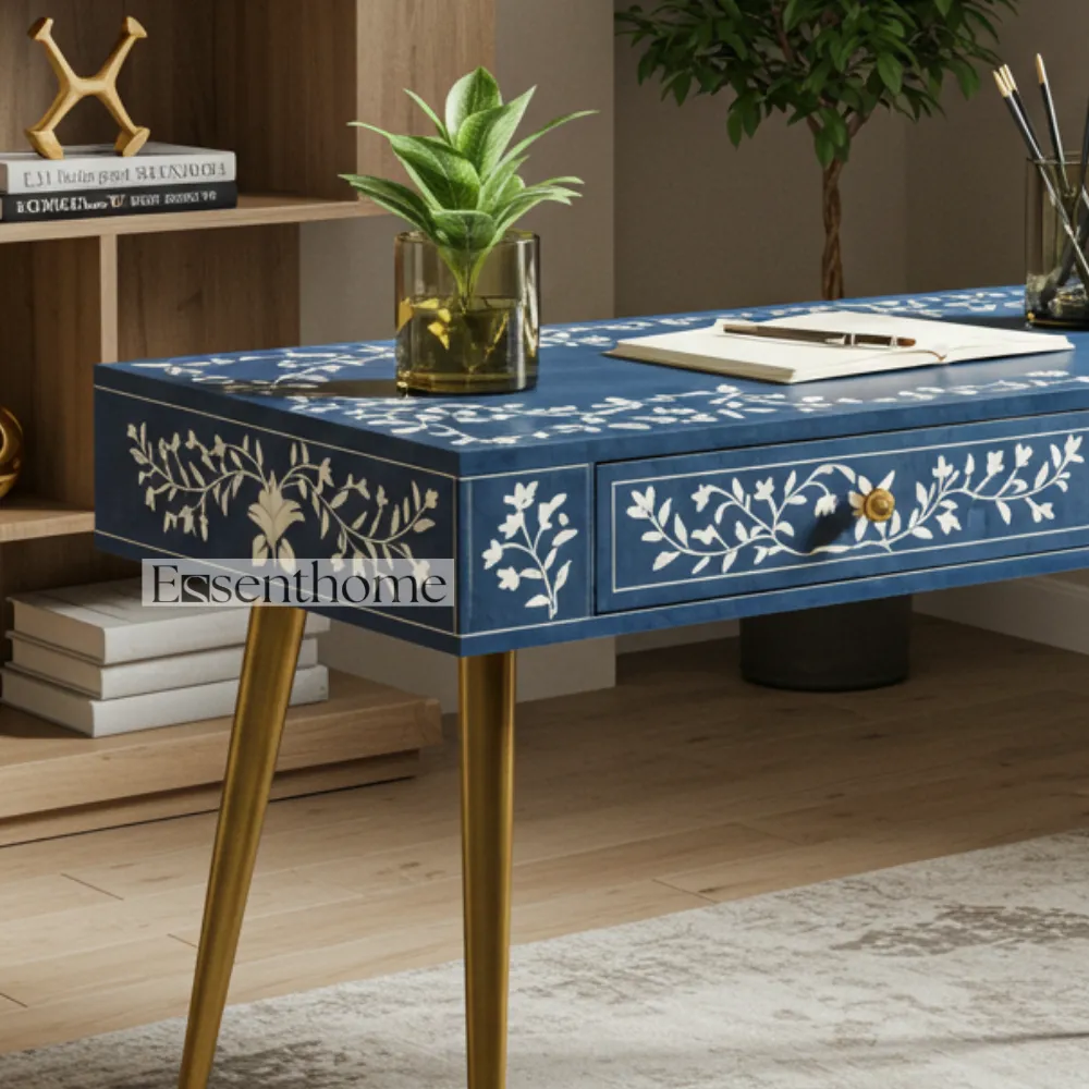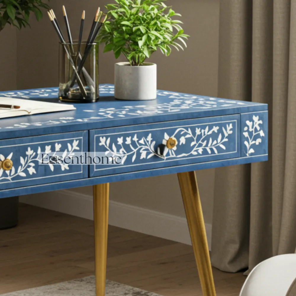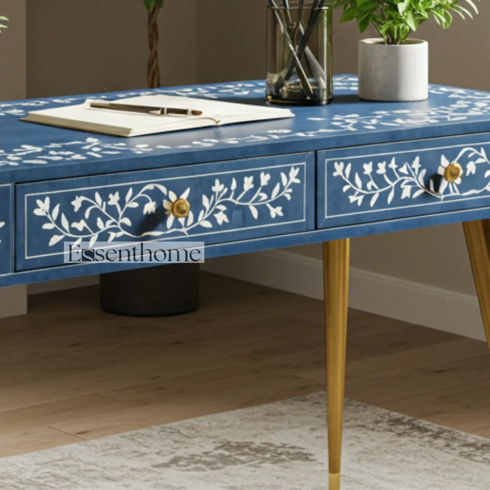 Bring a touch of elegance and global style to your home with this stunning bone inlay study desk. Each desk is a unique piece of art, meticulously handcrafted with ethically sourced bone and resin. The intricate floral patterns, set against a rich blue background, create a striking and beautiful surface that will make a statement in any room.