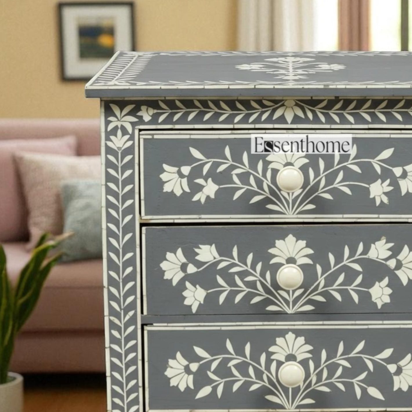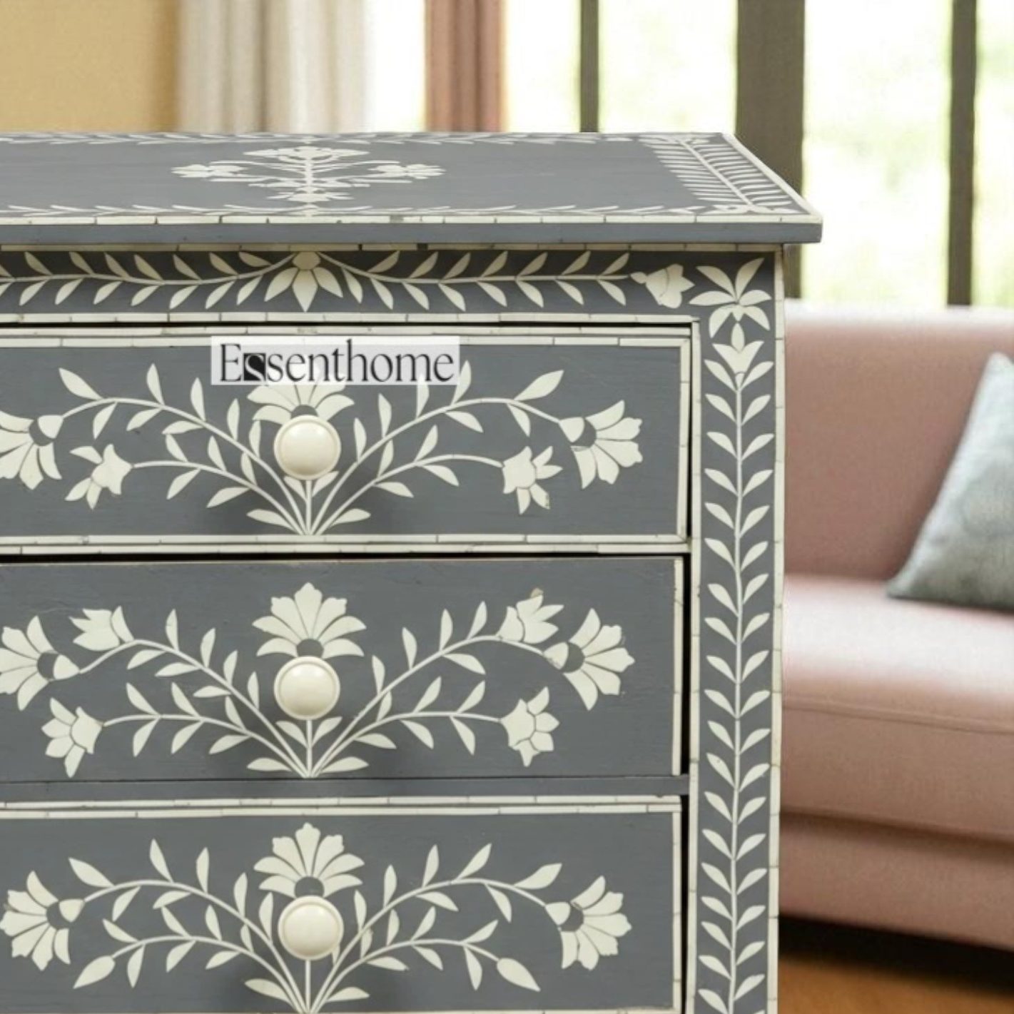 Whether styled in a serene bedroom or used as an accent piece in a sophisticated lounge, this Gray flolar bone inlay nightstand is a perfect blend of artistic detail, practical storage, and global design heritage. It’s more than just furniture—it’s a celebration of artisan skill and thoughtful living.