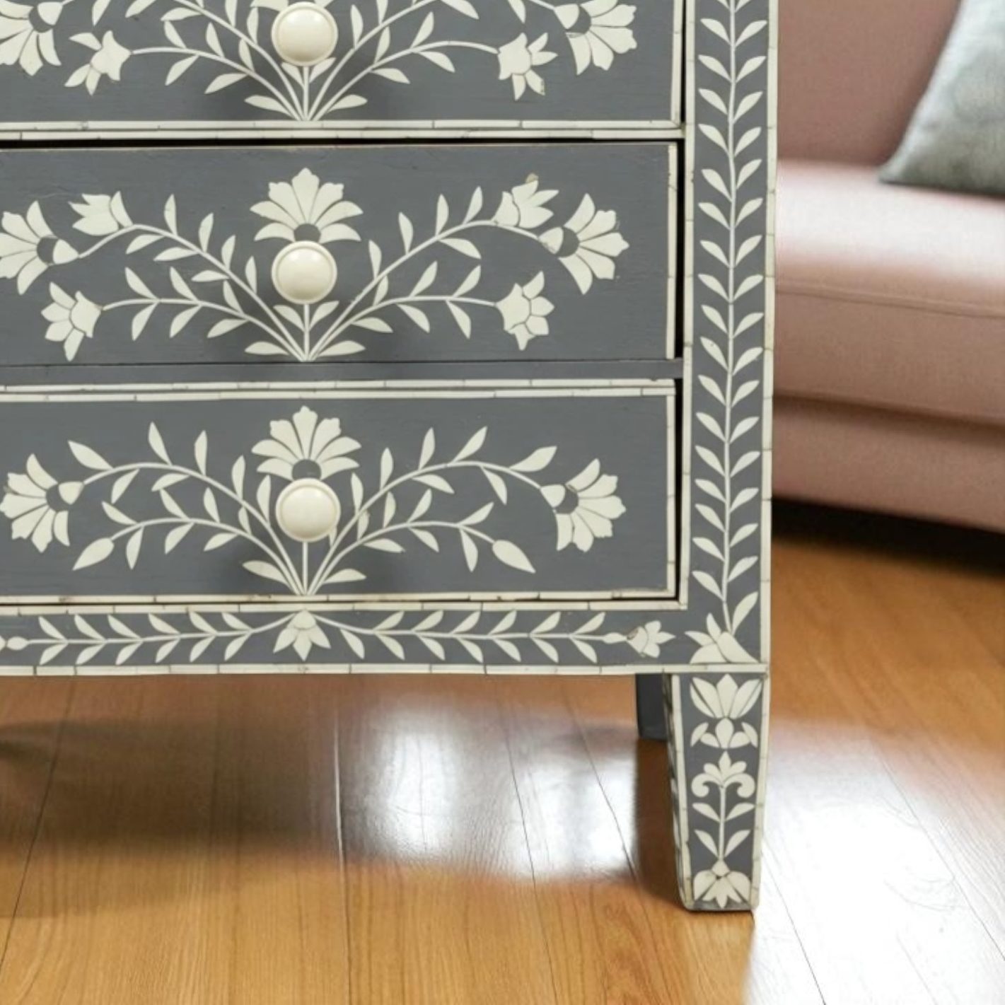 Crafted on a solid wooden frame for durability and stability, each piece is handcrafted using time-honored techniques passed down through generations. The handmade nature of this Gray Bone Inlay nightstand means that each piece may vary slightly in pattern, tone, or texture—enhancing its authenticity and uniqueness.