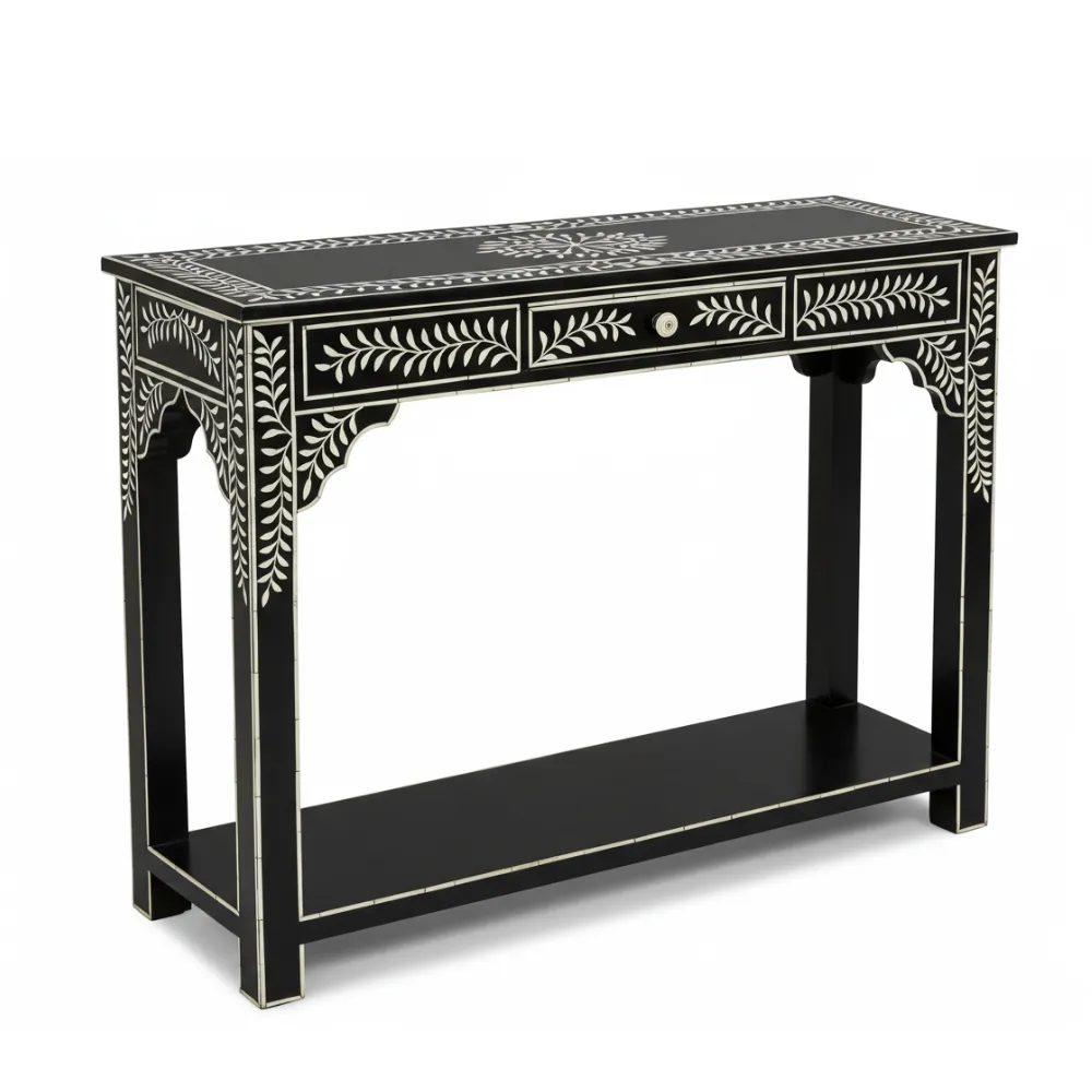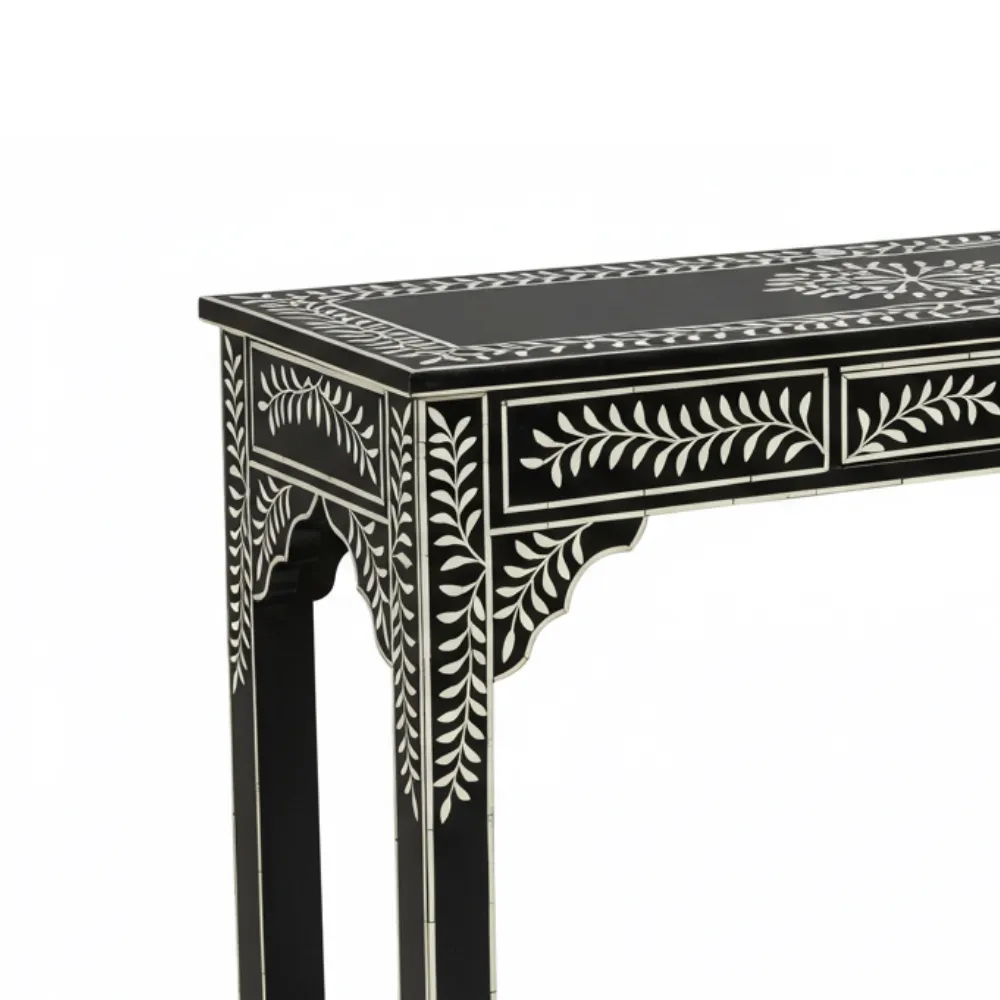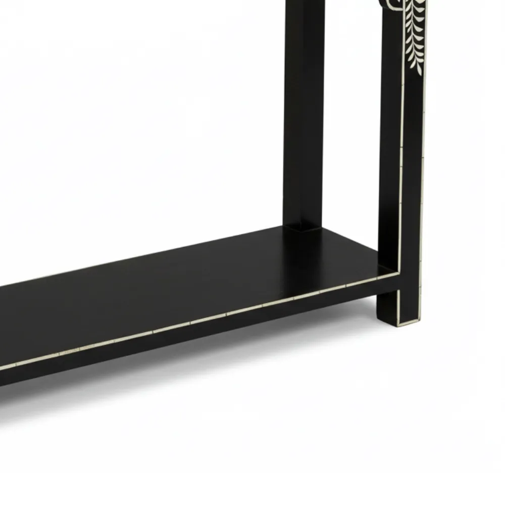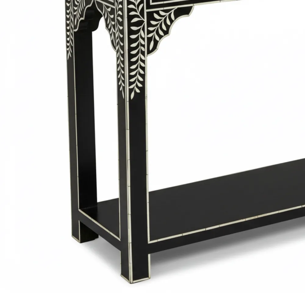 Elevate your interiors with the Essenthome Artisan Bone Inlay Console, a stunning handcrafted piece that blends traditional artistry with modern elegance. Featuring a bold black base with intricate white floral patterns, this console table is a timeless accent for hallways, entryways, or living rooms.