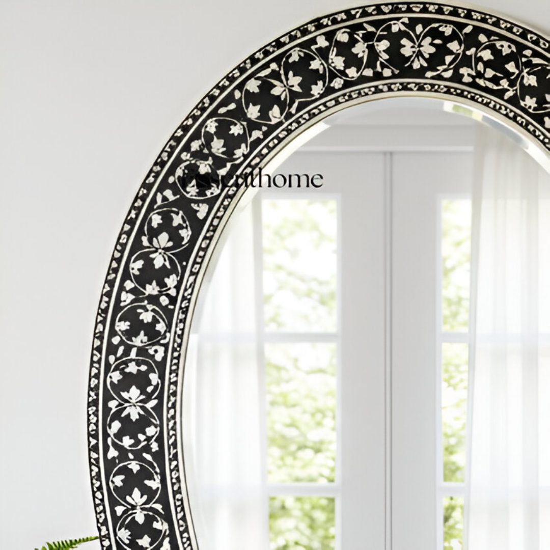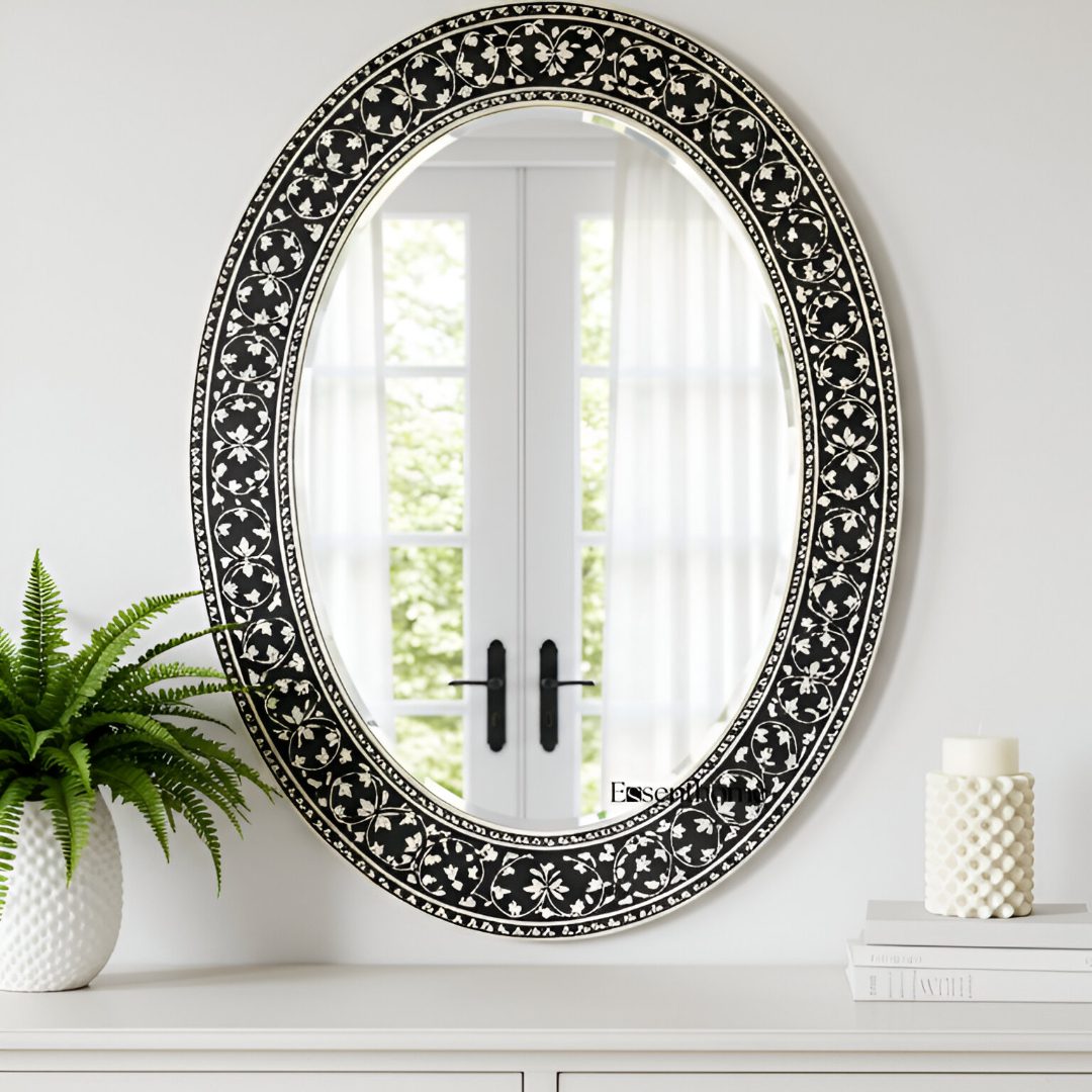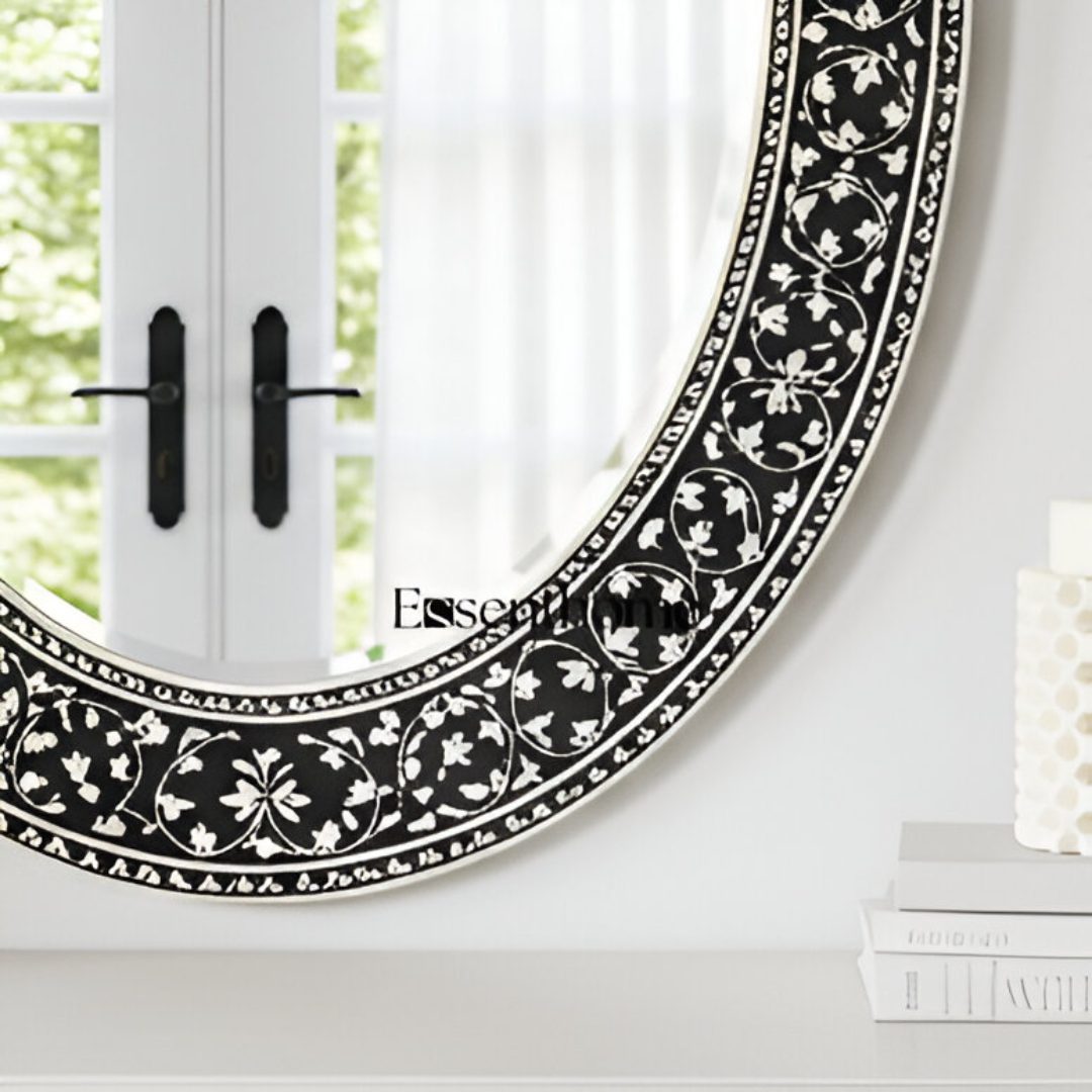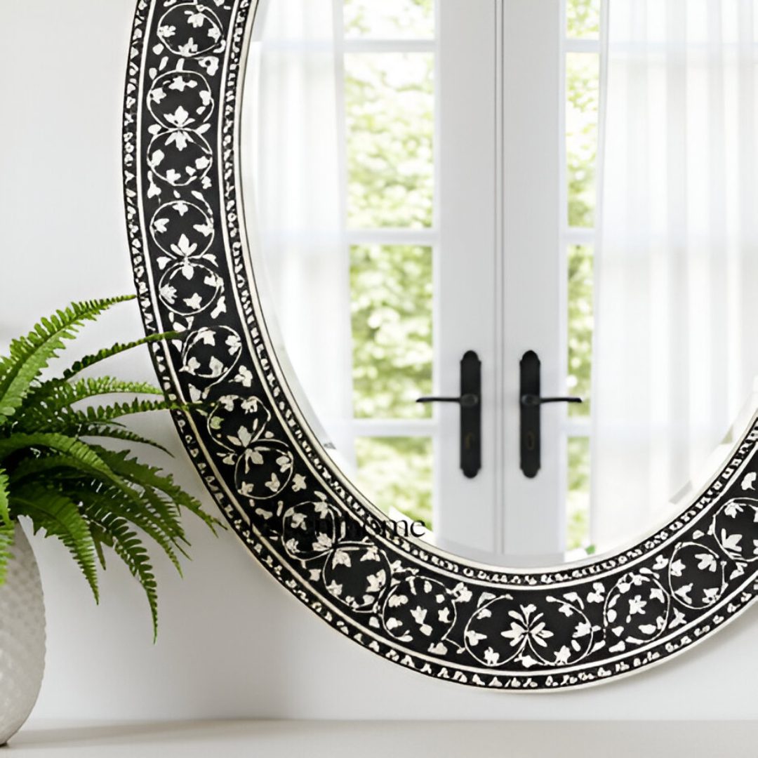 Bring timeless charm and artistic craftsmanship to your interiors with this Handmade Bone Inlay Mirror featuring a graceful floral print design. Carefully crafted by skilled artisans, each mirror showcases delicate flower motifs inlaid by hand using ethically sourced bone, set into a smooth resin base.