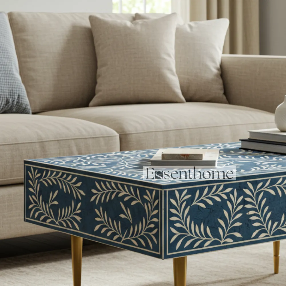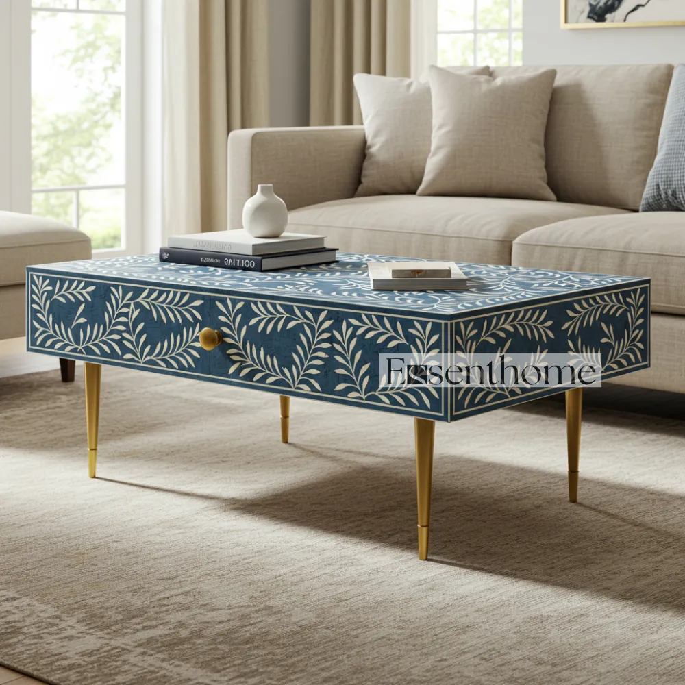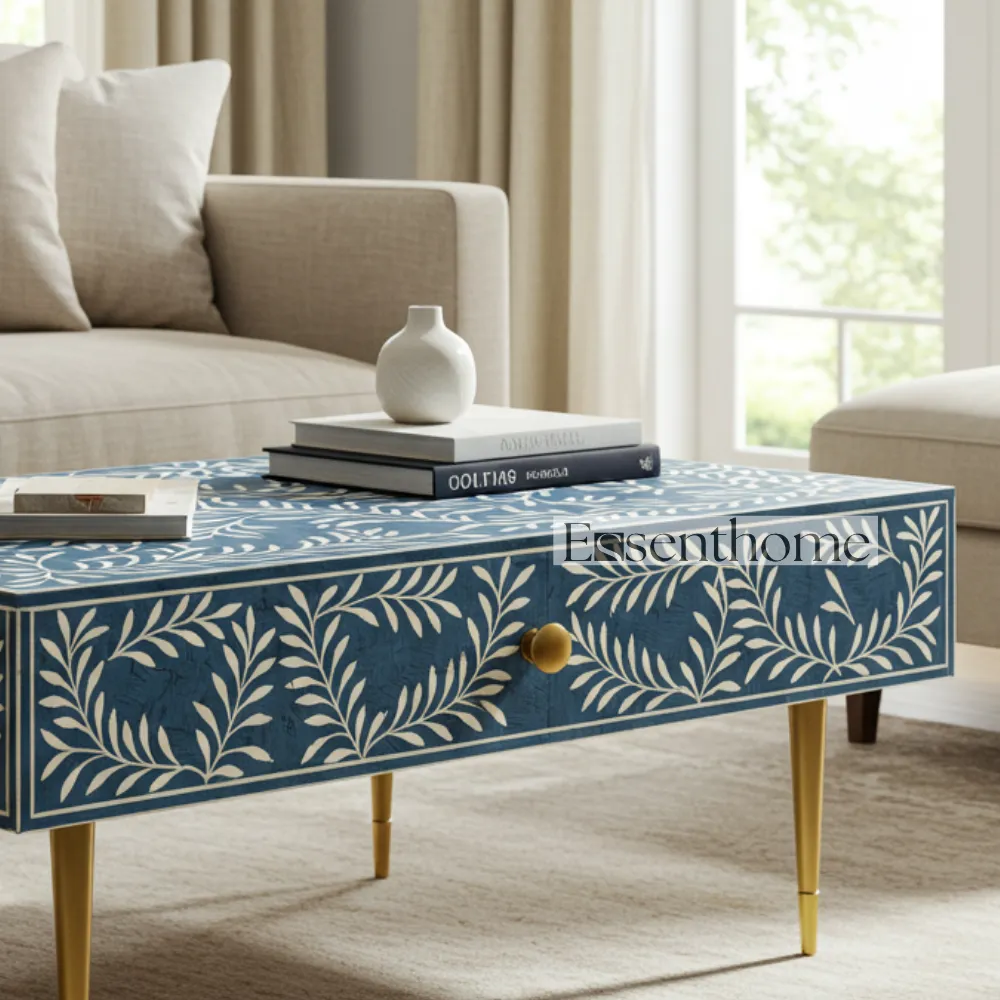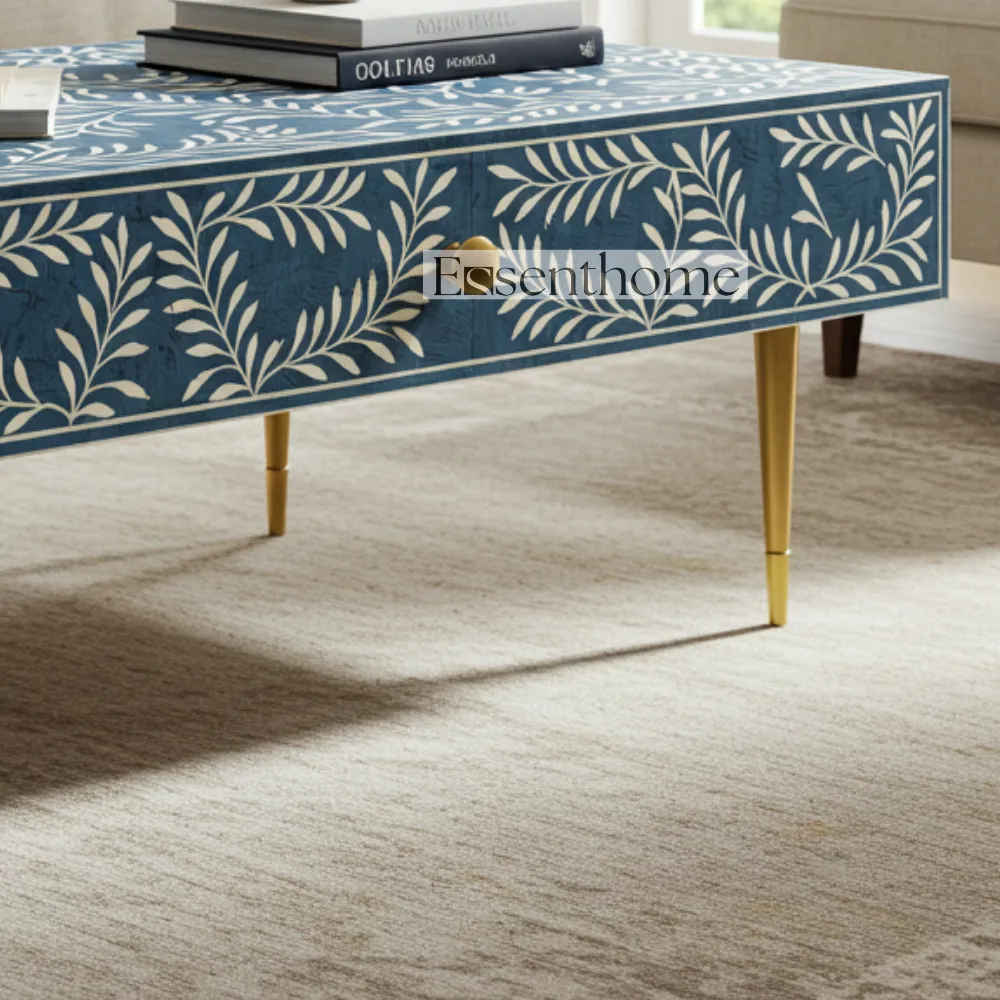 Enhance your living space with the Blue Bone Inlay Coffee Table from Essenthome. Each table is meticulously handcrafted from premium quality wood, ensuring durability, stability, and a polished, long-lasting finish. The vibrant blue bone inlay adds a luxurious, artistic touch, transforming this coffee table into a sophisticated centerpiece. Every table is unique, showcasing the skill and craftsmanship of experienced artisans.