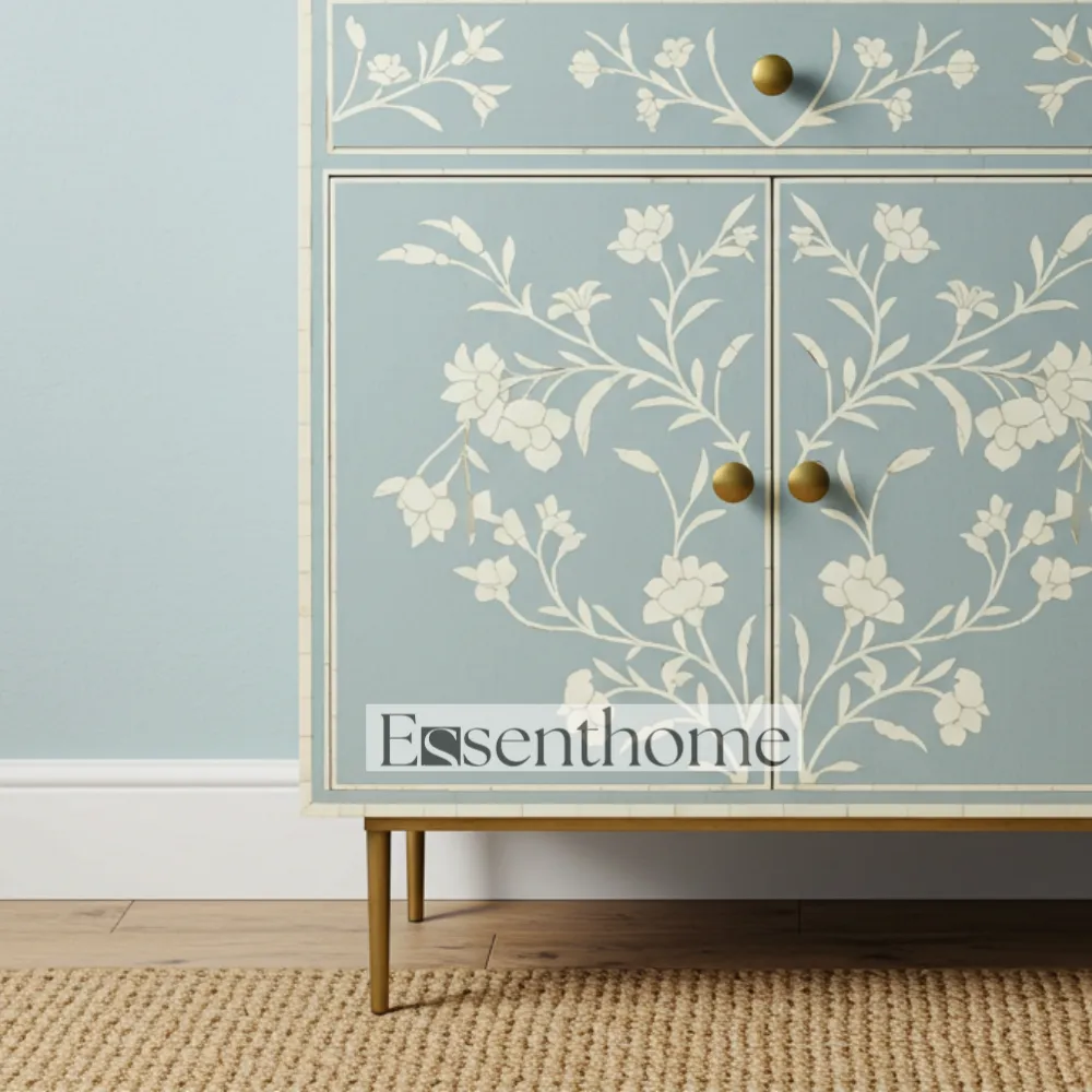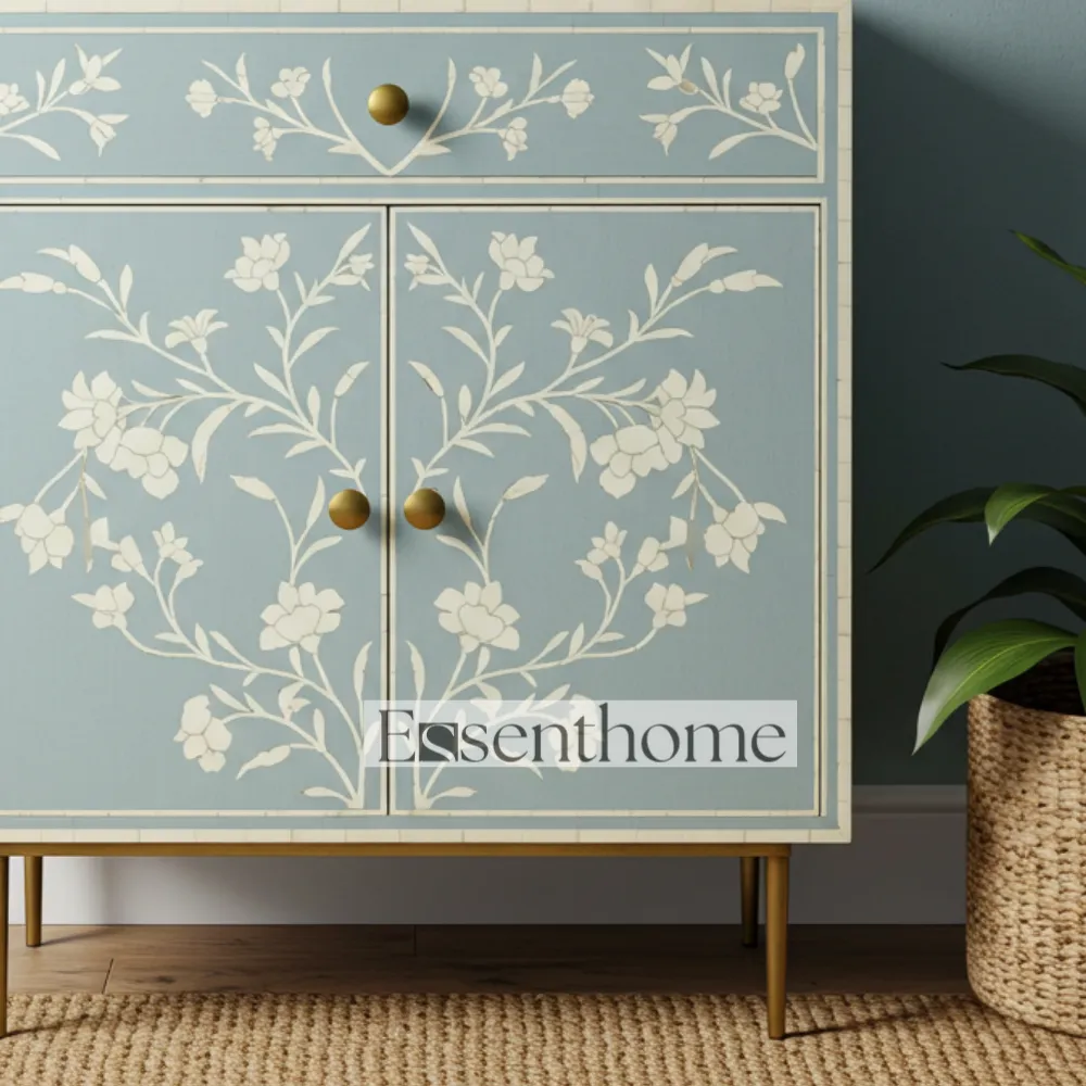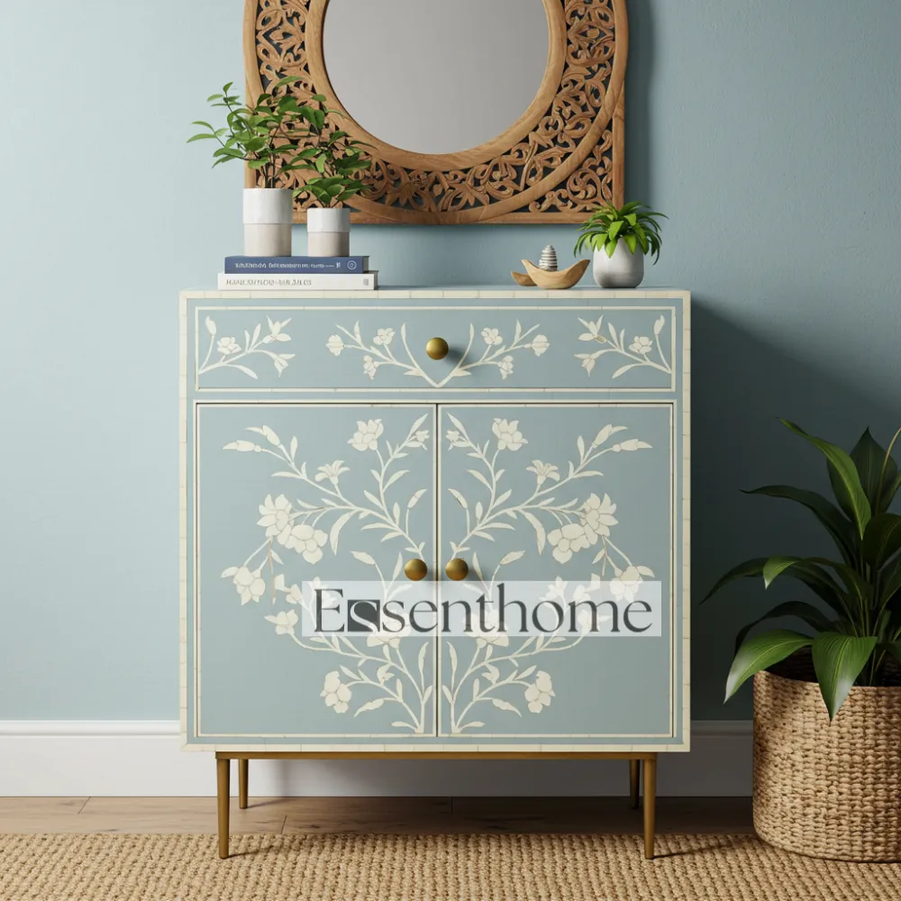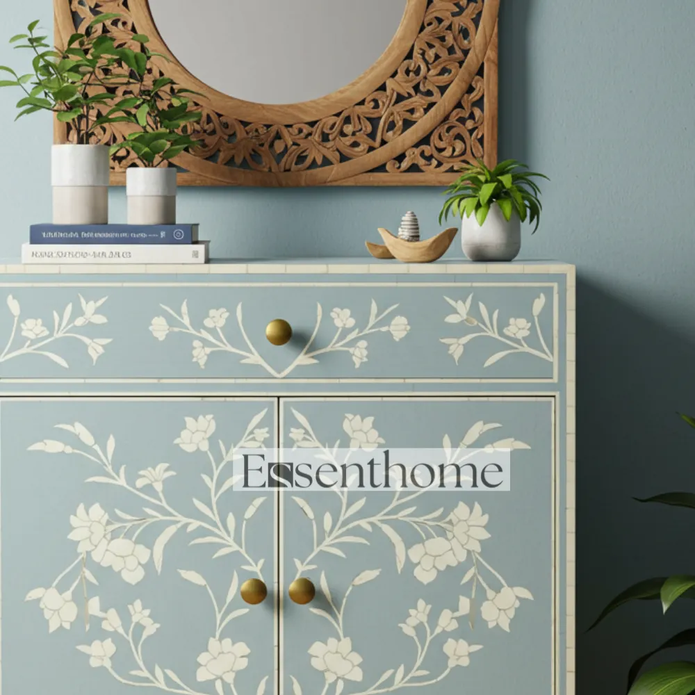 Add a touch of artisanal elegance to your home with this Bone Inlay Cabinet for Bedroom Cabinet. Handcrafted with meticulous care, this striking cabinet features a vibrant blue base adorned with intricate white floral bone inlay patterns, making it a beautiful statement piece of furniture. Designed with one spacious drawer and a single door, it offers practical storage solutions for organizing essentials while keeping your living space stylish and clutter-free.