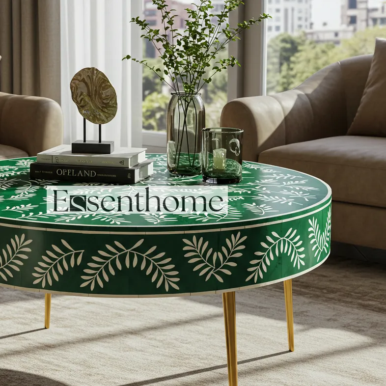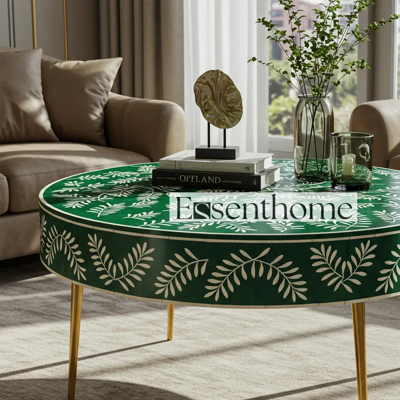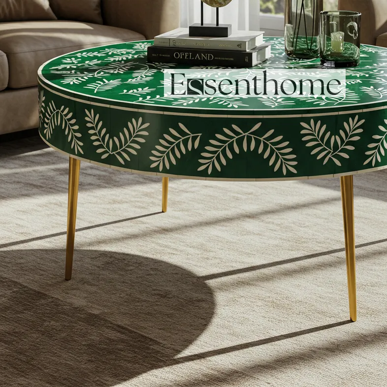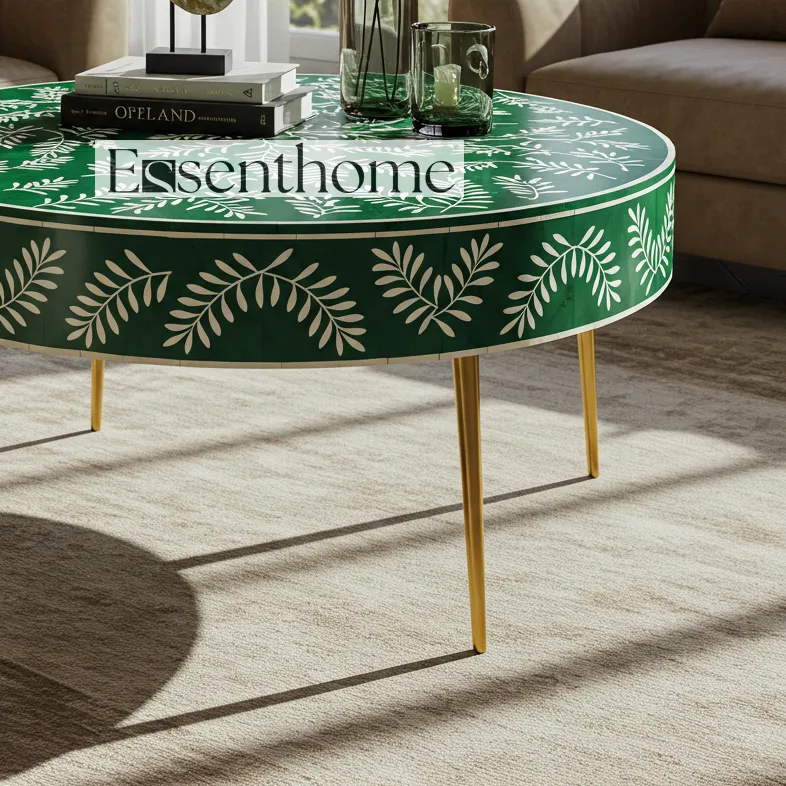 Bring artisanal charm and modern elegance to your home with the Essenthome green Bone Inlay Round Coffee Table. Handcrafted by skilled artisans, this stunning table features a white floral vine bone inlay set against a bold green resin backdrop. The round table top rests on sleek gold-finished metal legs, blending traditional craftsmanship with contemporary style.