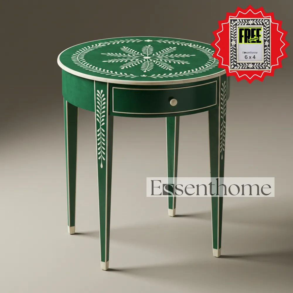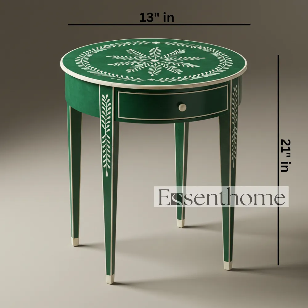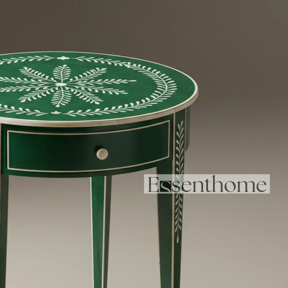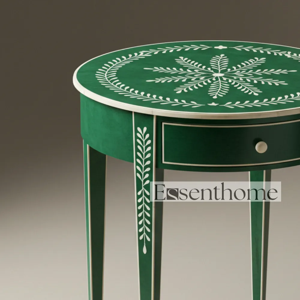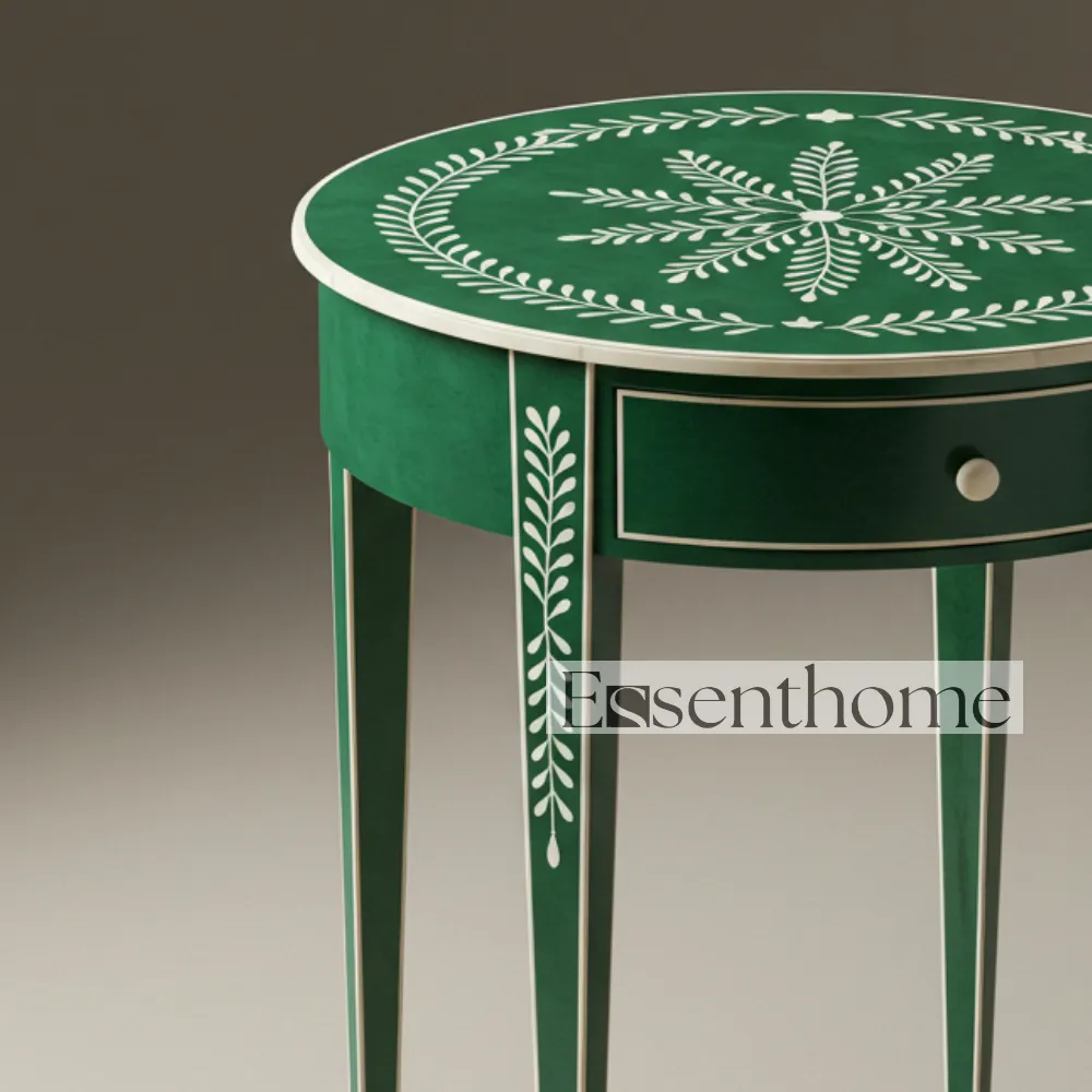 Elevate your home décor with the Essenthome Green Bone Inlay Round Stool with Storage Drawer. This handcrafted stool combines traditional artistry with modern functionality. The intricate green bone inlay and delicate floral patterns make it a standout accent piece, adding elegance and charm to any room.