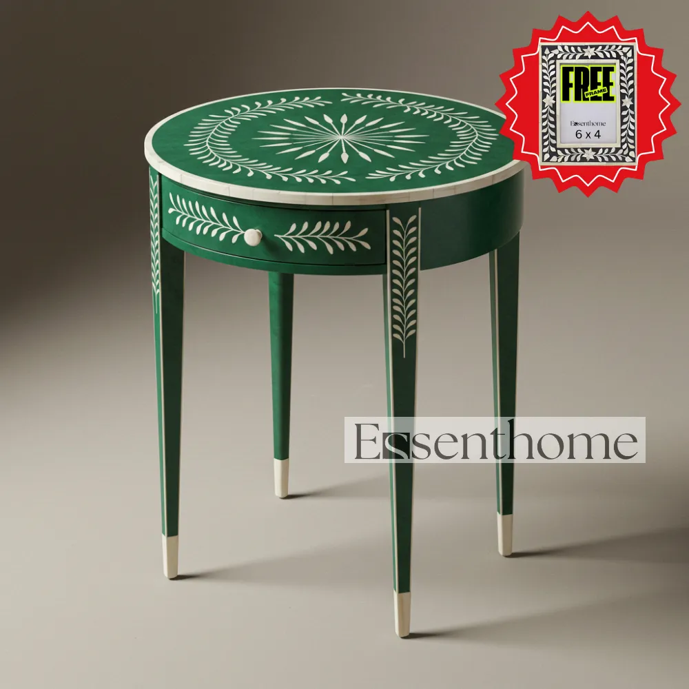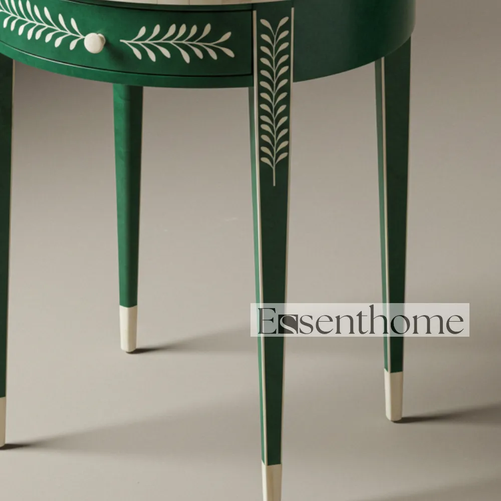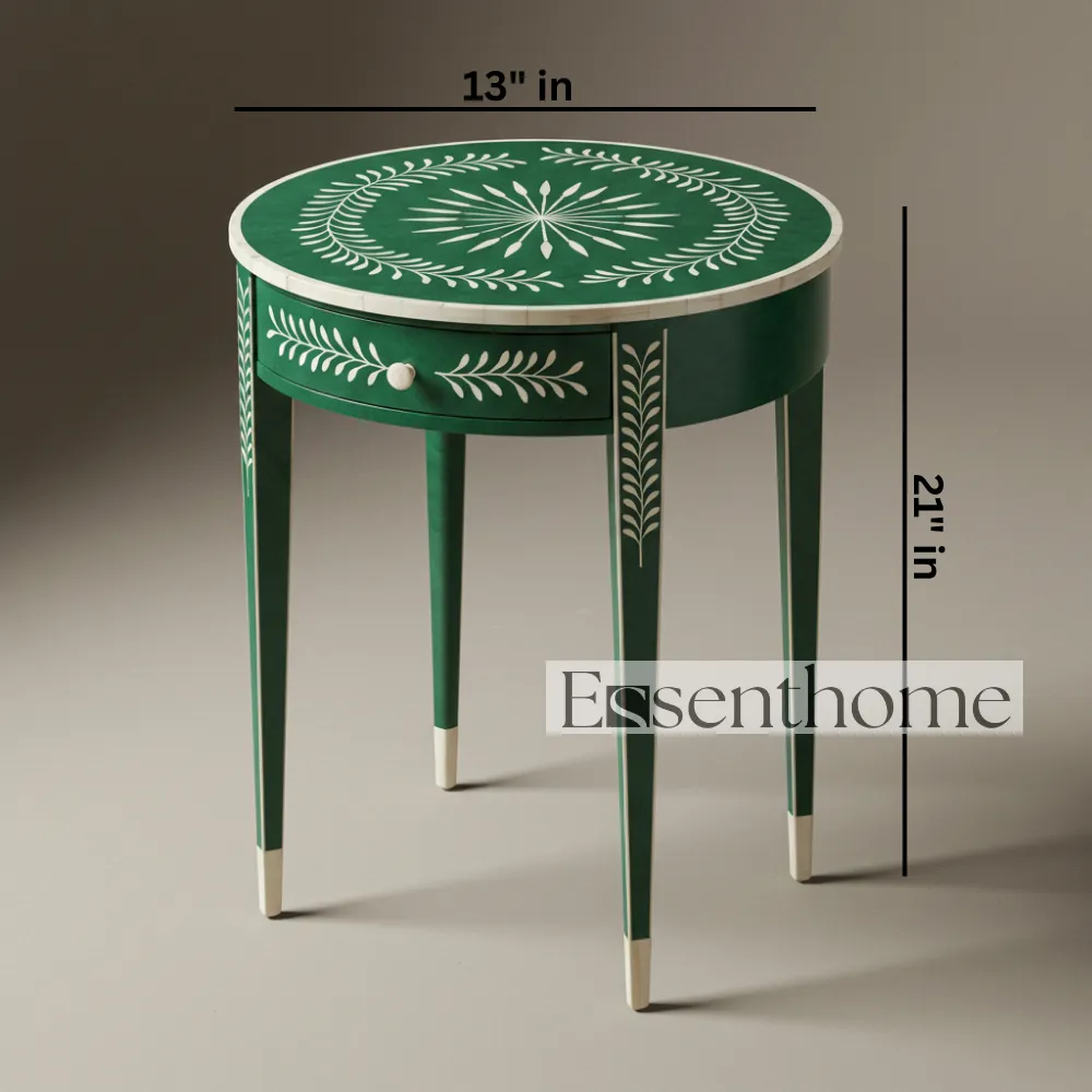 Bring timeless elegance and functional charm to your home with the Essenthome Handcrafted Green Bone Inlay Round Stool with Floral Design. Expertly crafted by skilled artisans, each stool features intricate bone inlay patterns in a vibrant green finish, highlighted with delicate floral motifs that add sophistication to any space.