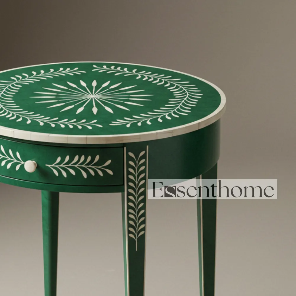 Essenthome Handcrafted Green Bone Inlay Round Stool with Floral Design