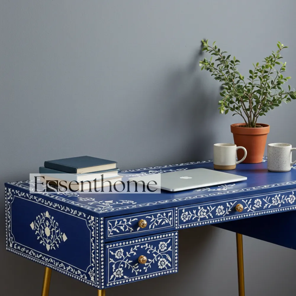 Handmade blue bone inlay desk by Essenthome with floral pattern.