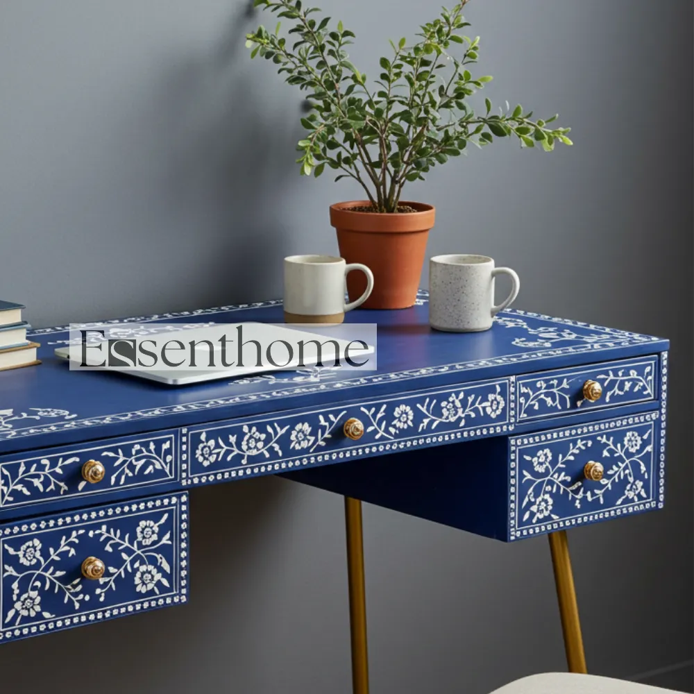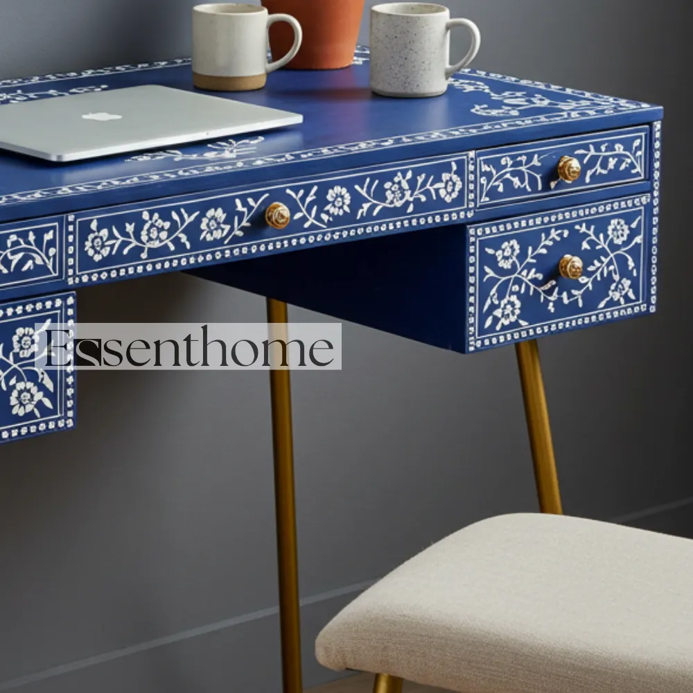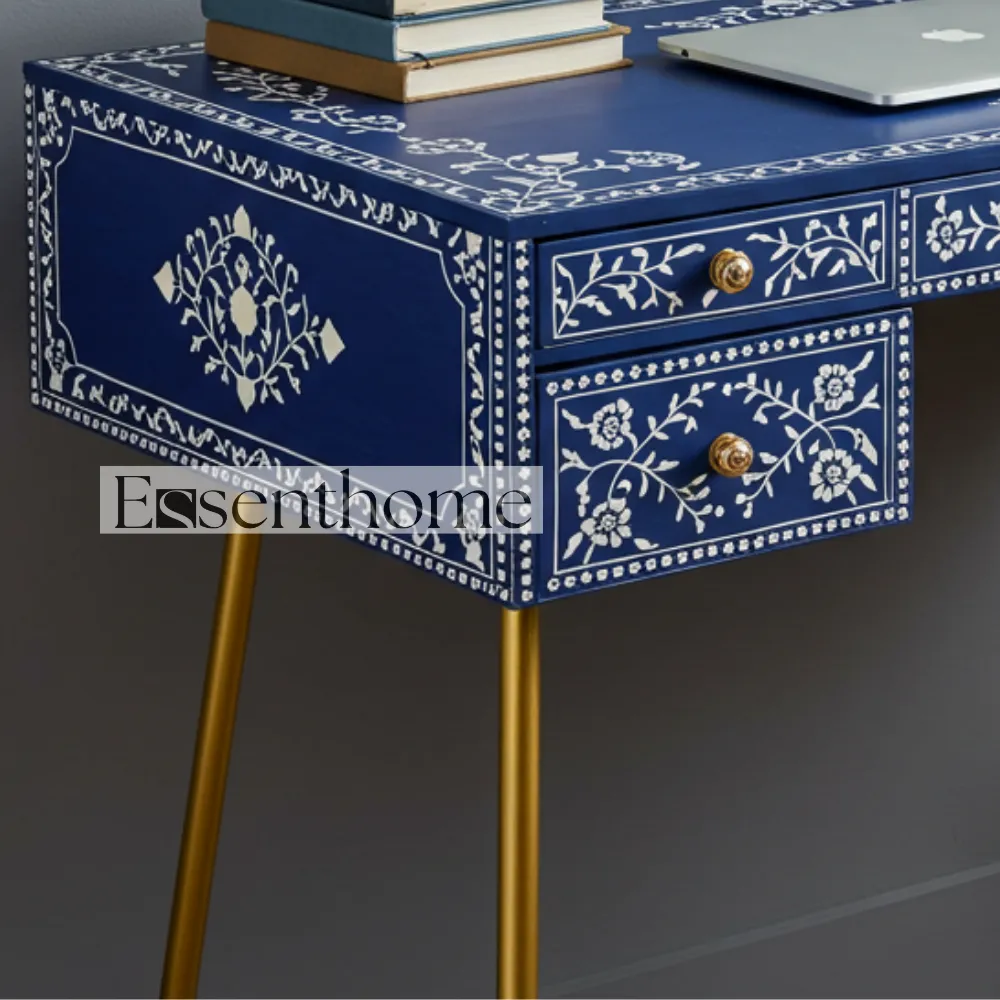 Meticulously handcrafted by skilled artisans, this desk showcases the traditional bone inlay technique, where each delicate floral motif is individually carved and inlaid into a solid wooden frame. The bold blue finish combined with the elegant white floral details creates a striking contrast, while the golden metal legs add a modern, luxurious touch.