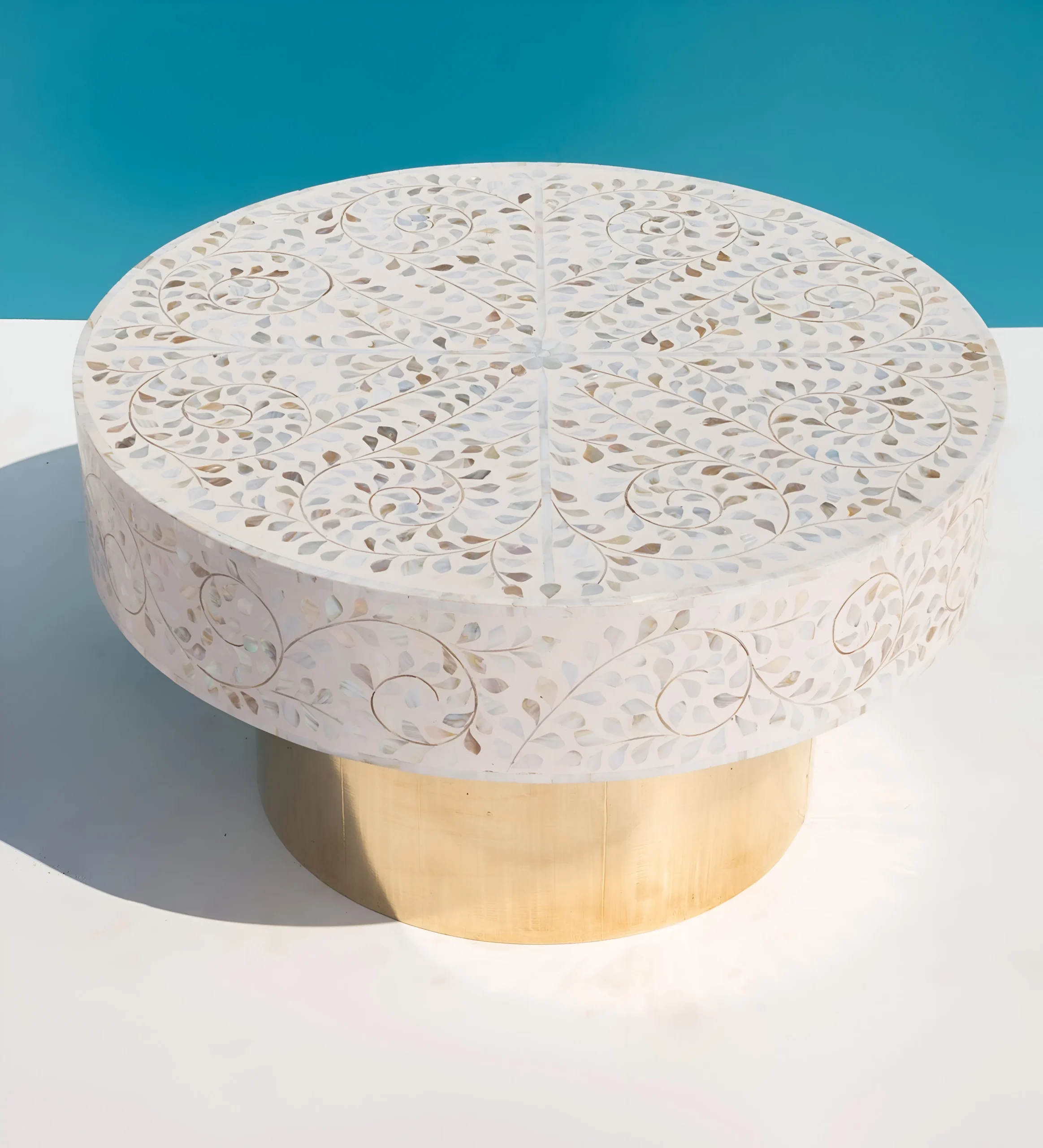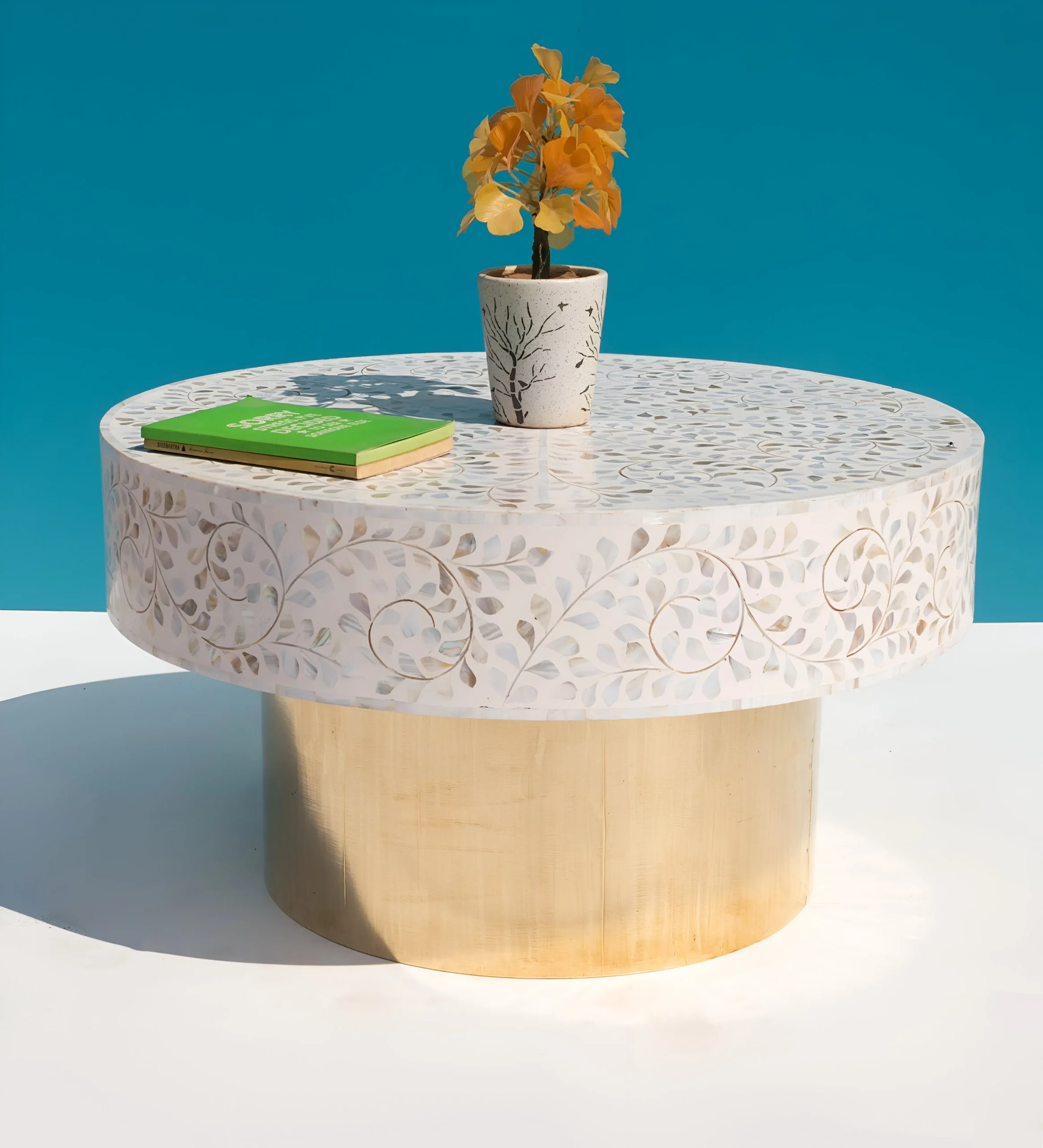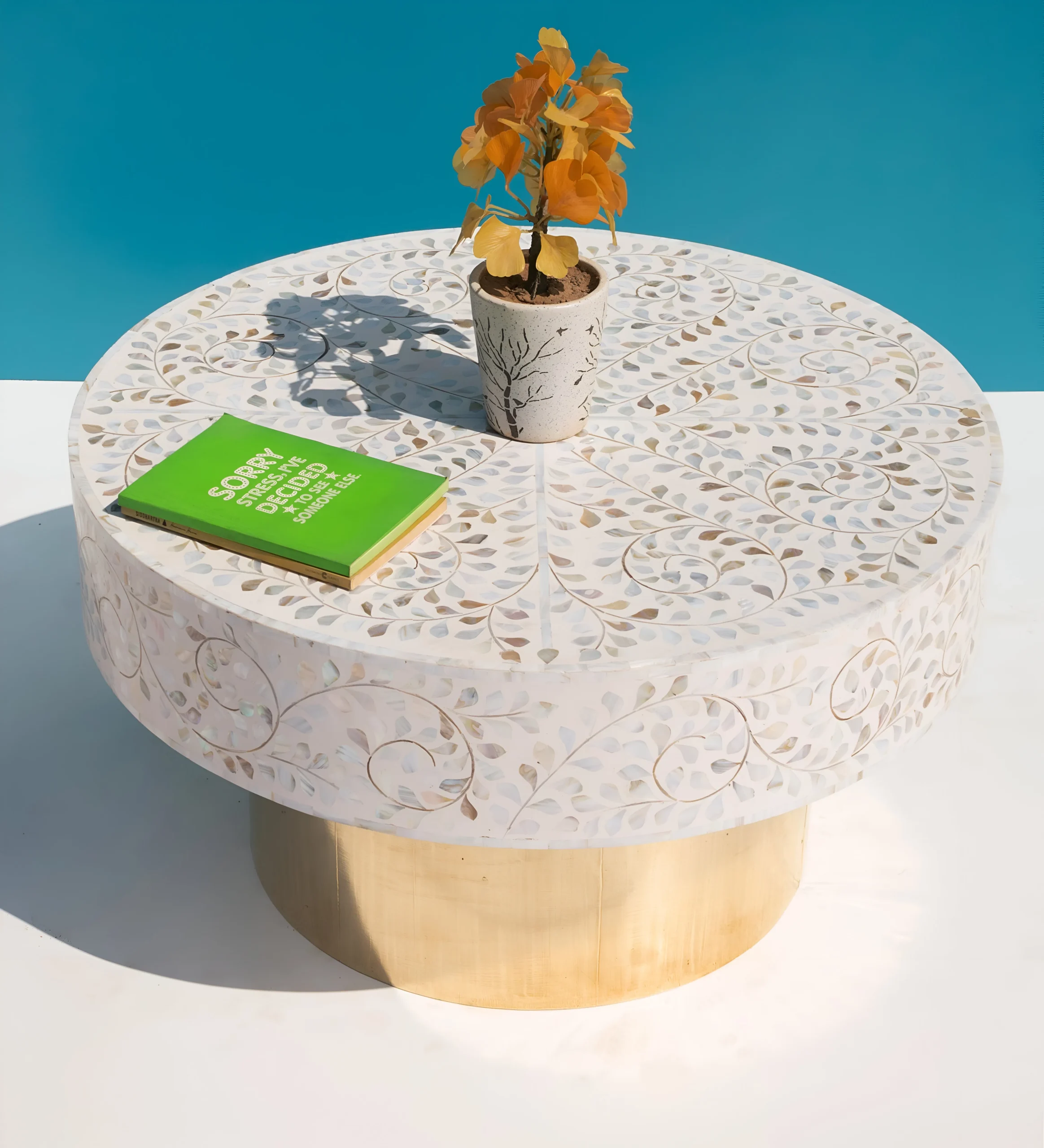 Enhance your living room with the Essenthome Handmade Bone Inlay Round Coffee Table. Crafted from high-quality solid wood, this round center table features a delicate white bone inlay with intricate floral patterns. The luxurious golden base adds a touch of sophistication and elegance, making it a striking centerpiece for any living space. Its artisanal design blends traditional craftsmanship with modern style, creating a timeless piece of furniture.