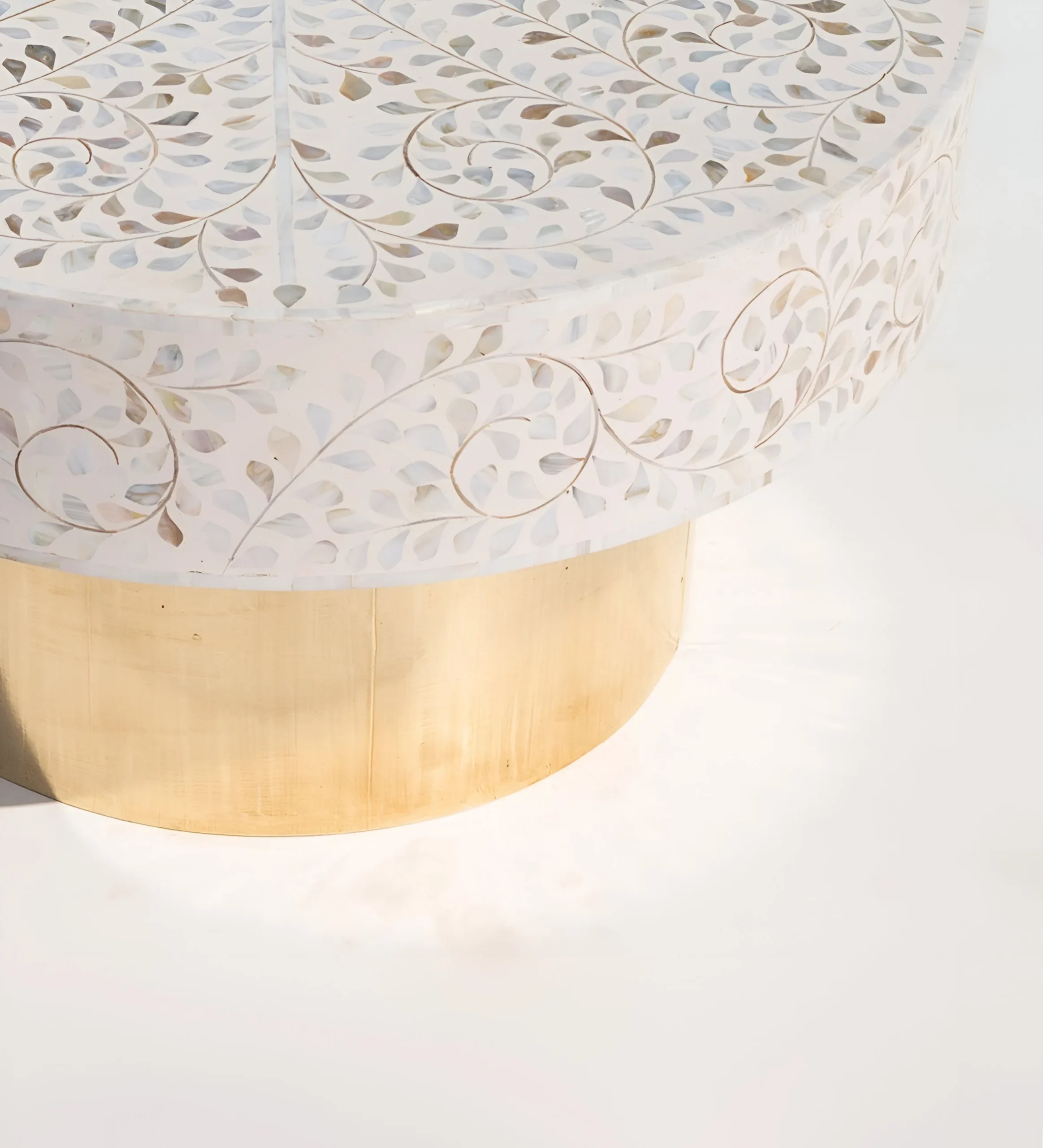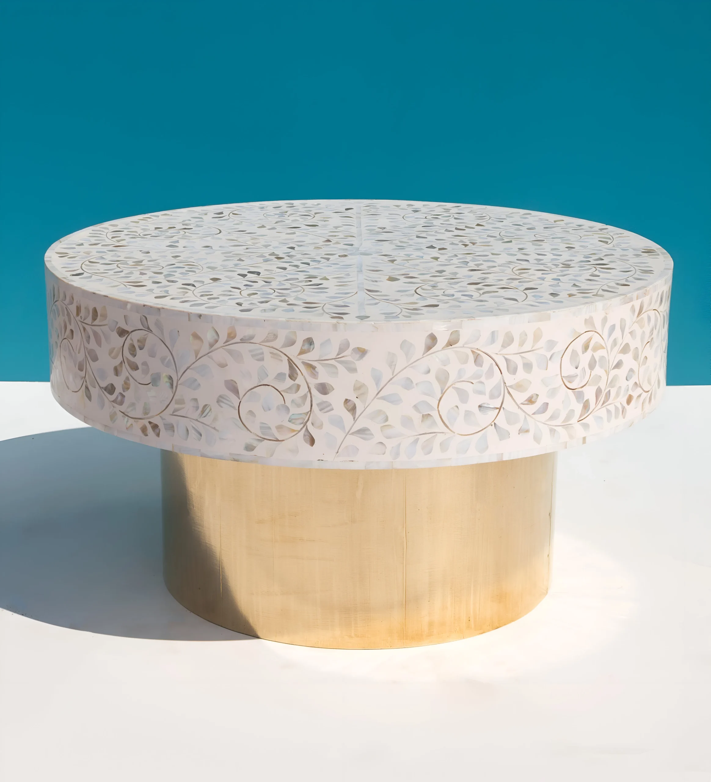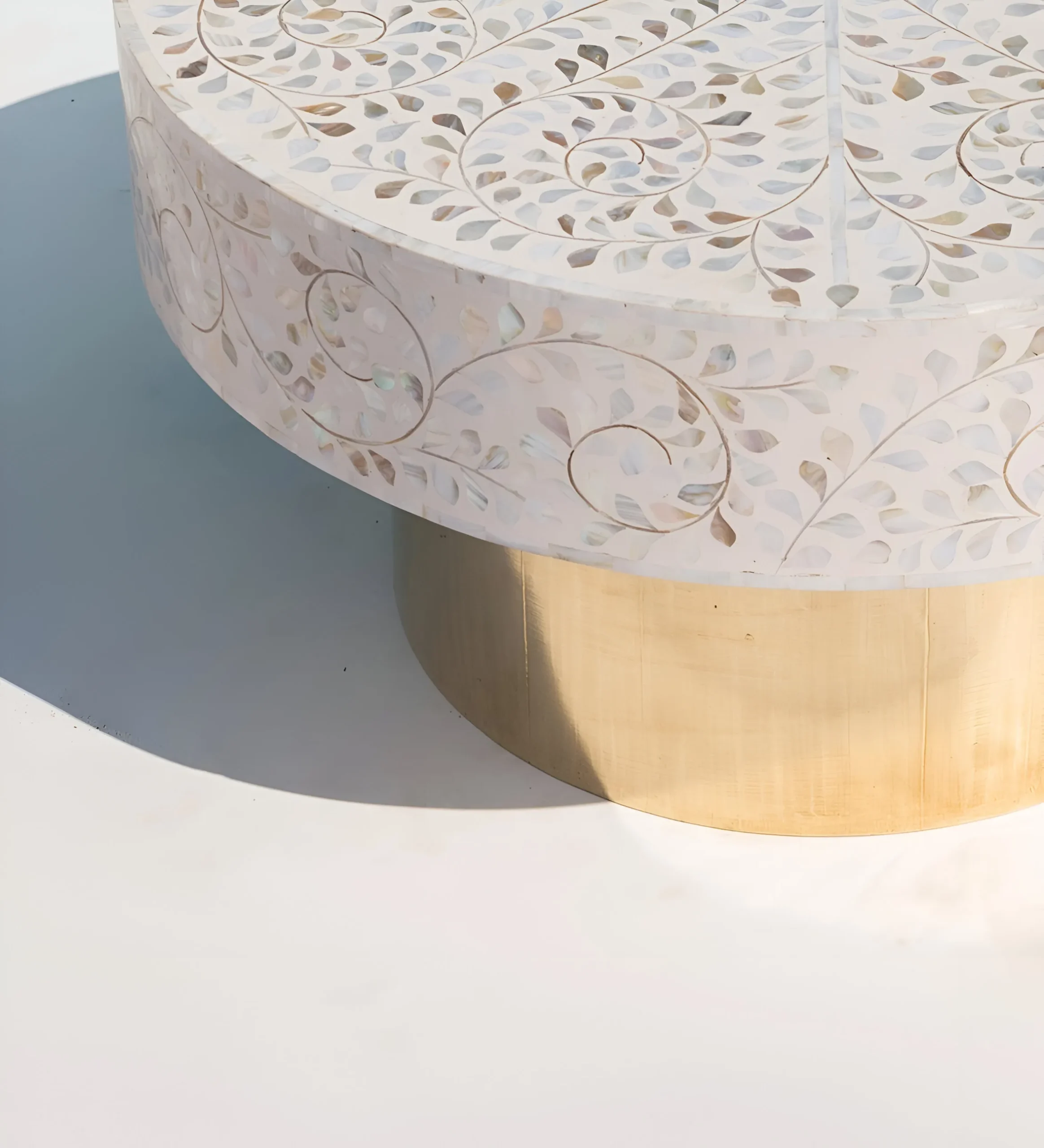 Enhance your living room with the Essenthome Handmade Bone Inlay Round Coffee Table. Crafted from high-quality solid wood, this round center table features a delicate white bone inlay with intricate floral patterns. The luxurious golden base adds a touch of sophistication and elegance, making it a striking centerpiece for any living space. Its artisanal design blends traditional craftsmanship with modern style, creating a timeless piece of furniture.
