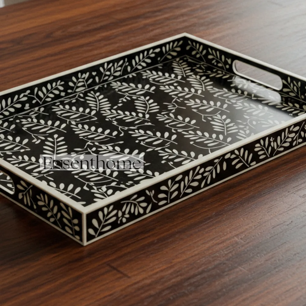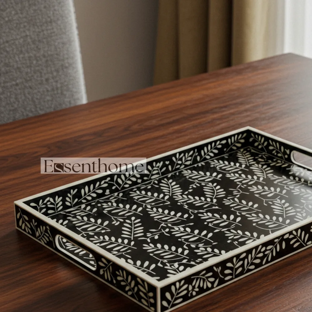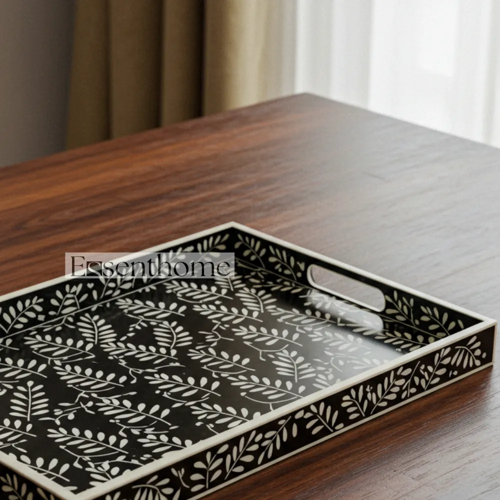 Perfect for coffee tables, dining tables, sideboards, or console furniture, this bone inlay gift tray adds a luxurious and artisanal touch to any living room, dining area, or kitchen. The smooth resin finish enhances durability while highlighting the delicate patterns, ensuring your tray remains both functional and beautiful for years. Whether used as a functional serving tray, a decorative centerpiece, or a thoughtful gift, this handcrafted tray combines elegance, utility, and artisan craftsmanship in one exquisite home accessory.