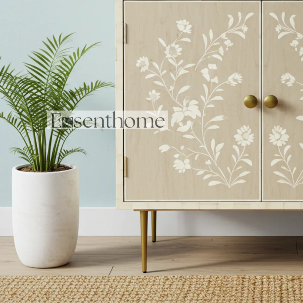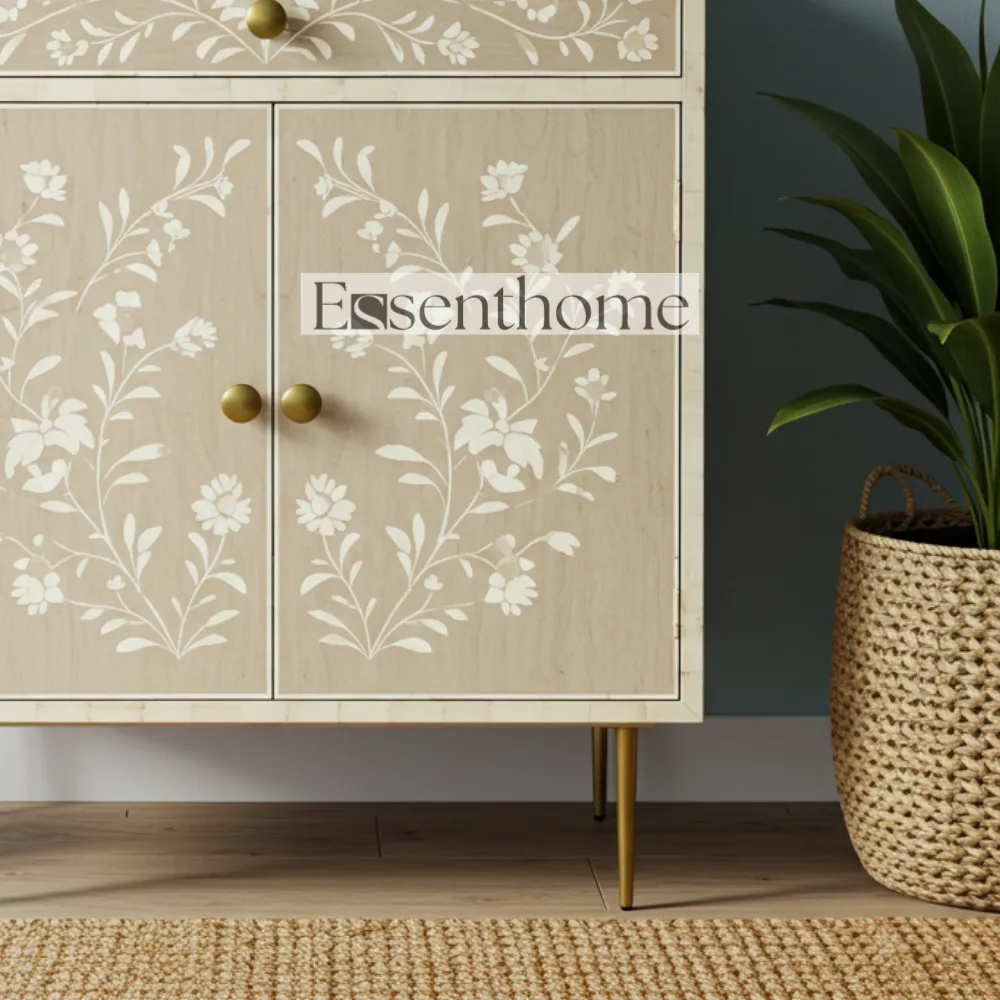 Enhance your home décor with the Essenthome Light Brown Bone Inlay Cabinet, a luxurious and handcrafted storage solution. Made from high-quality solid wood, this console sideboard features a delicate bone inlay design with intricate floral patterns. Its light brown finish adds warmth and elegance, making it a standout piece in any living room, hallway, or dining area.