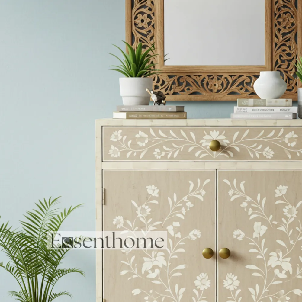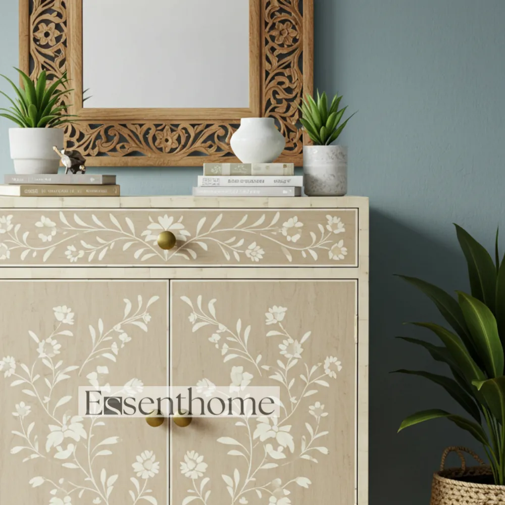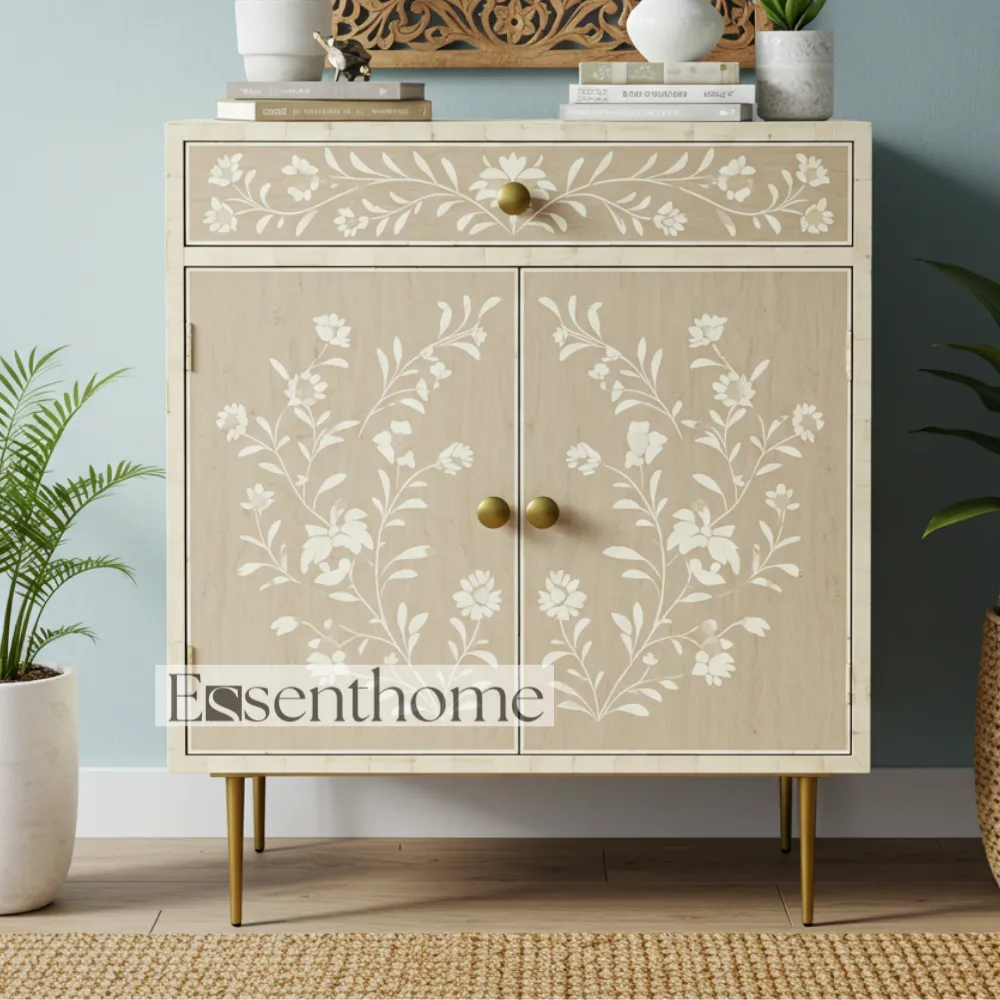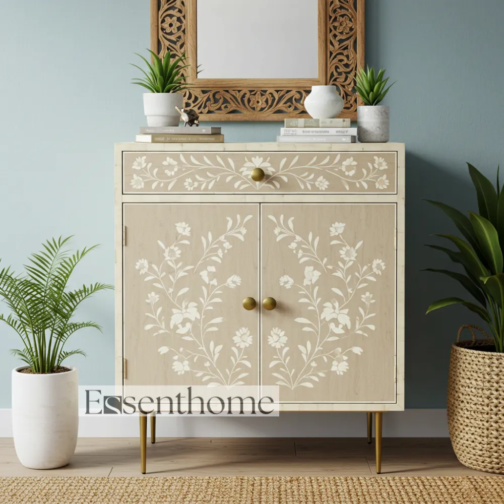 Equipped with one spacious drawer and two doors, this cabinet provides ample storage for your essentials. Store books, décor items, utensils, or personal belongings while keeping your space organized and stylish. The Essenthome Light Brown Bone Inlay Cabinet combines functionality with artisanal beauty, making it both practical and decorative furniture.