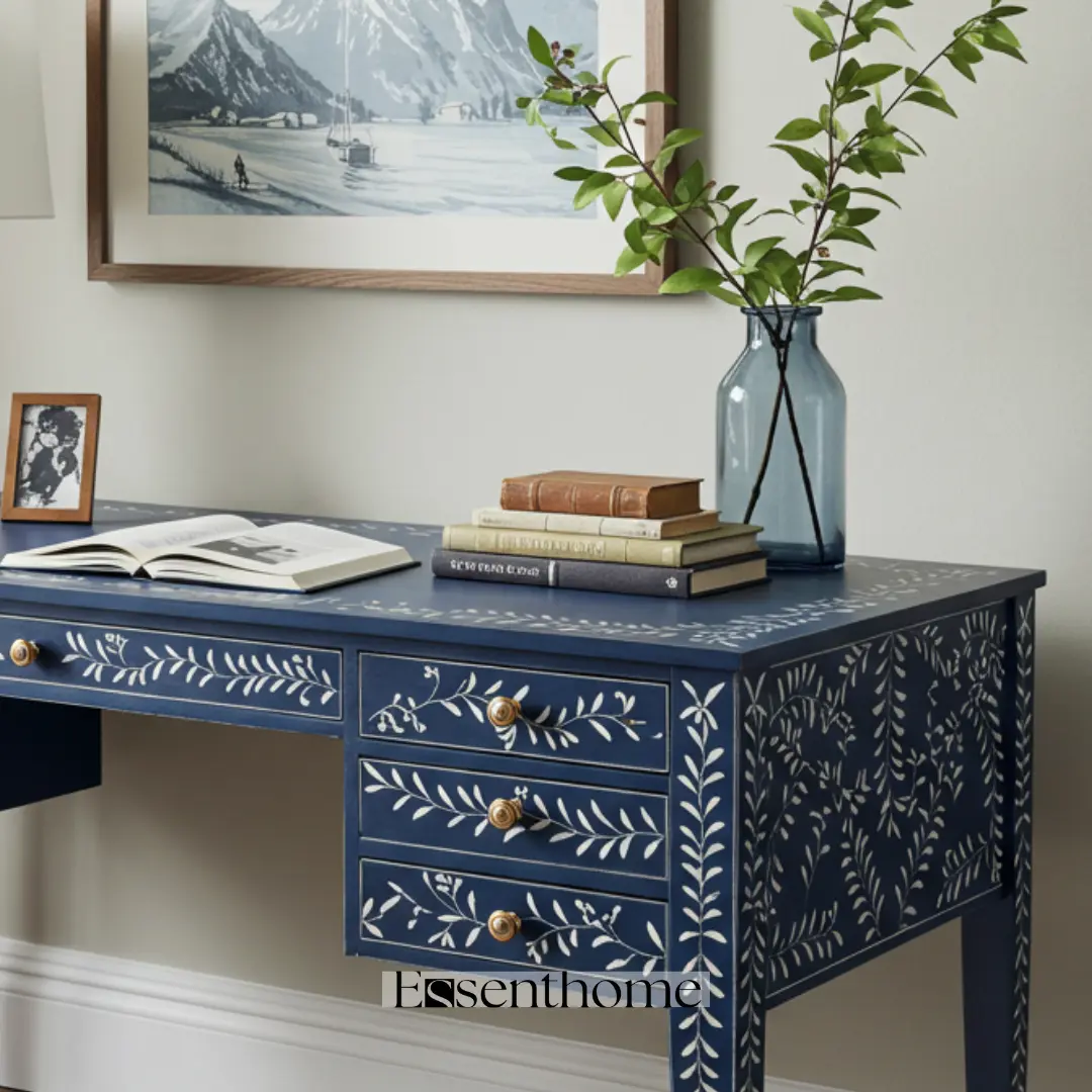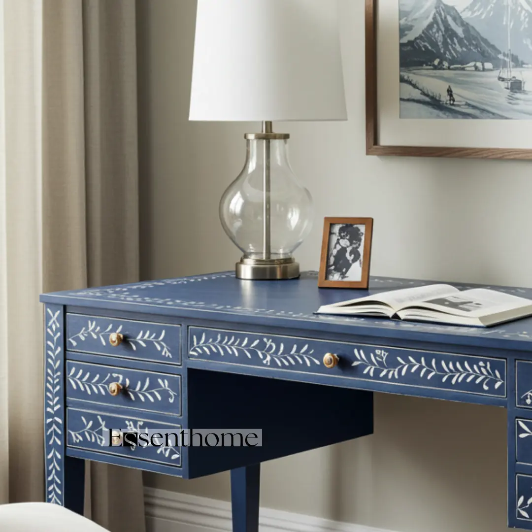 Whether you’re working, writing, or styling your workspace, the Essenthome Navy Blue Bone Inlay Writing Desk adds a touch of timeless elegance and handcrafted charm to your home furniture.