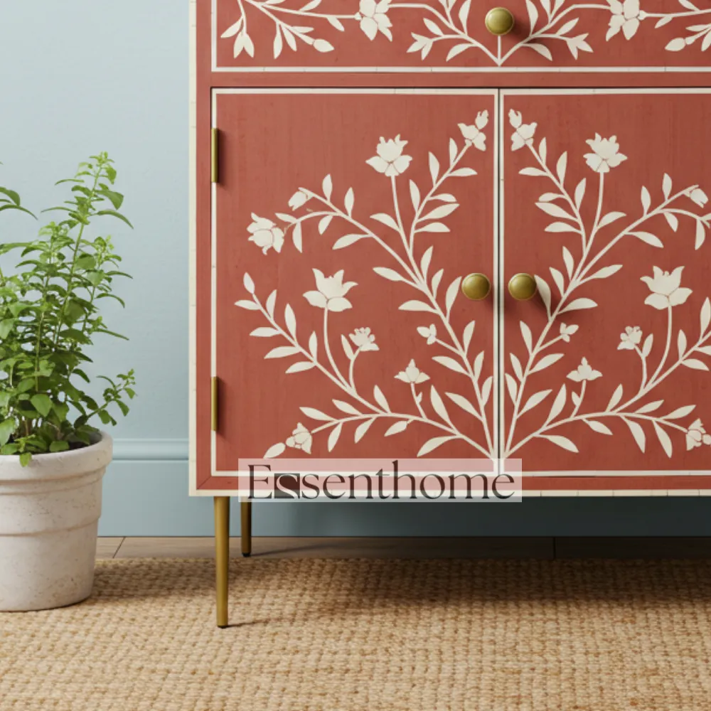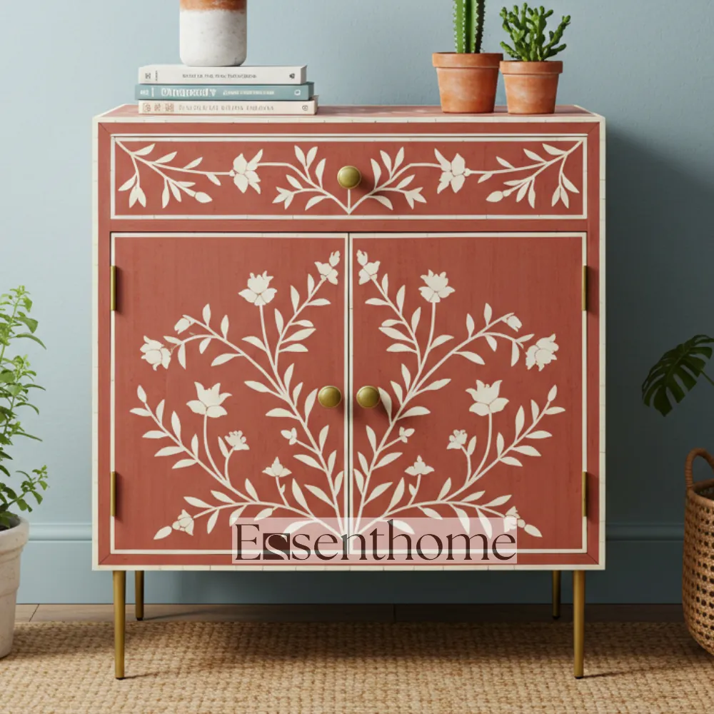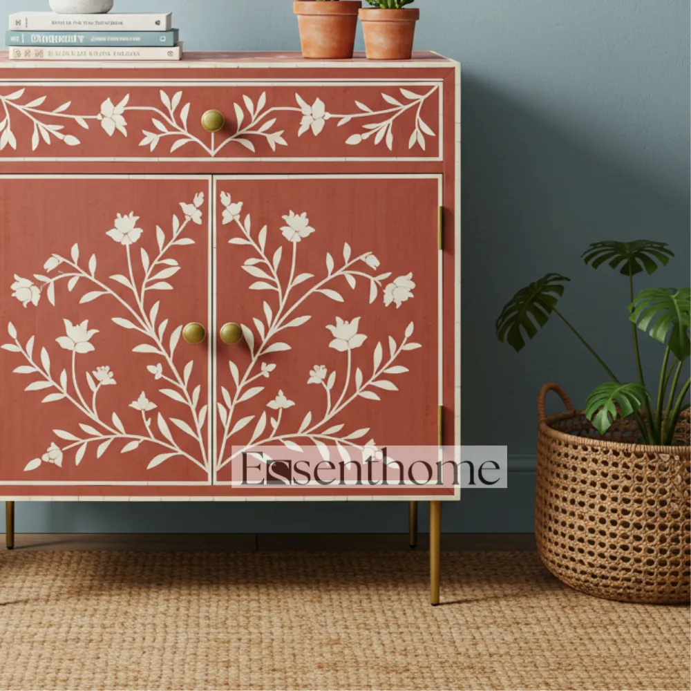 Bring a vibrant touch of artistry to your home with this Bone Inlay Cabinet for Living Room. Handcrafted with precision, this stunning cabinet features a bold orange base adorned with intricate white floral bone inlay patterns, making it a striking statement piece of furniture. Designed with functionality in mind, it offers ample storage space to keep your living area organized while adding elegance and style.