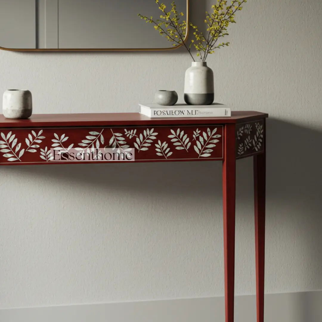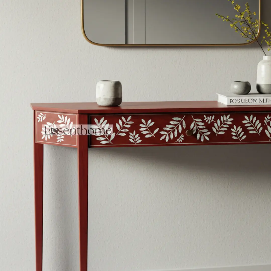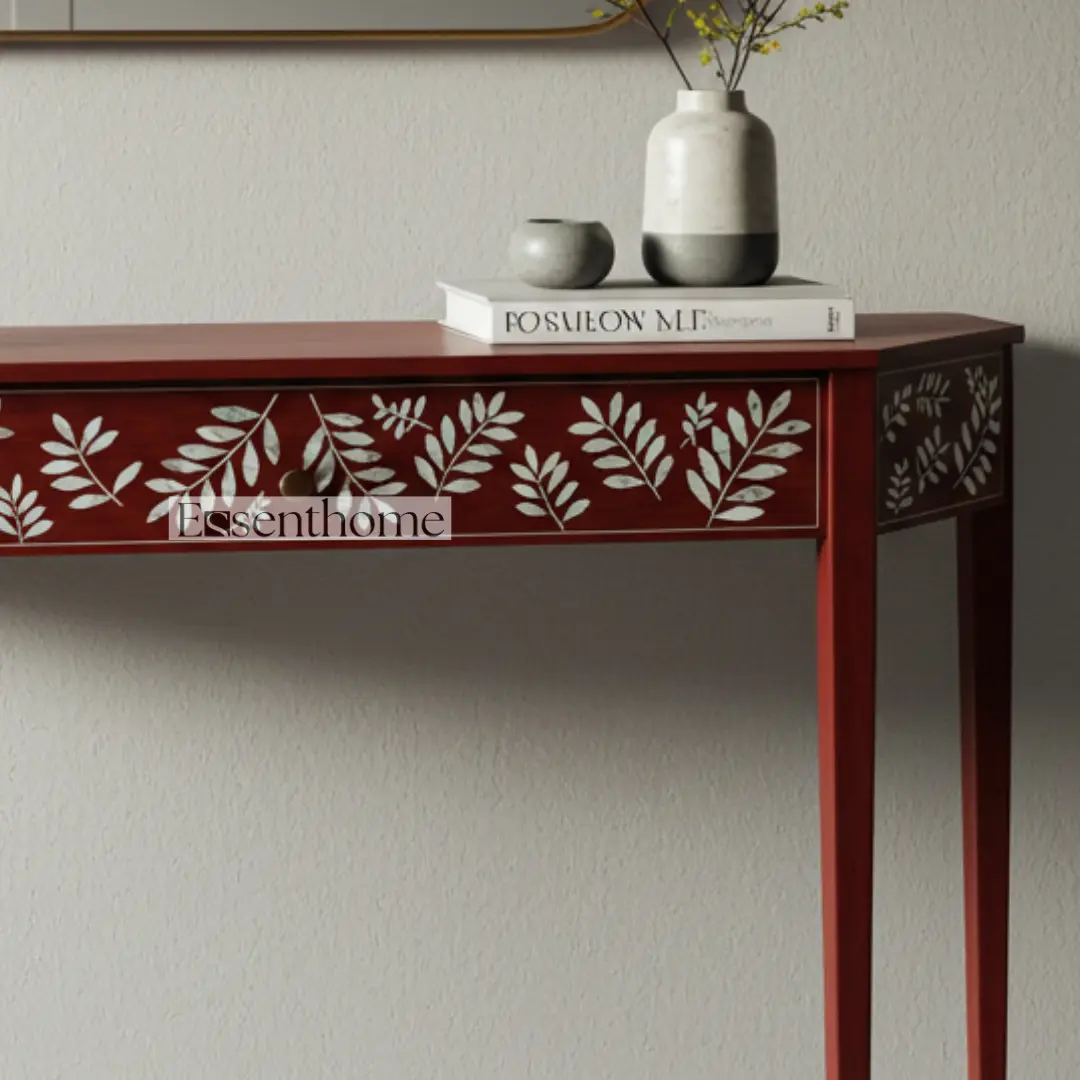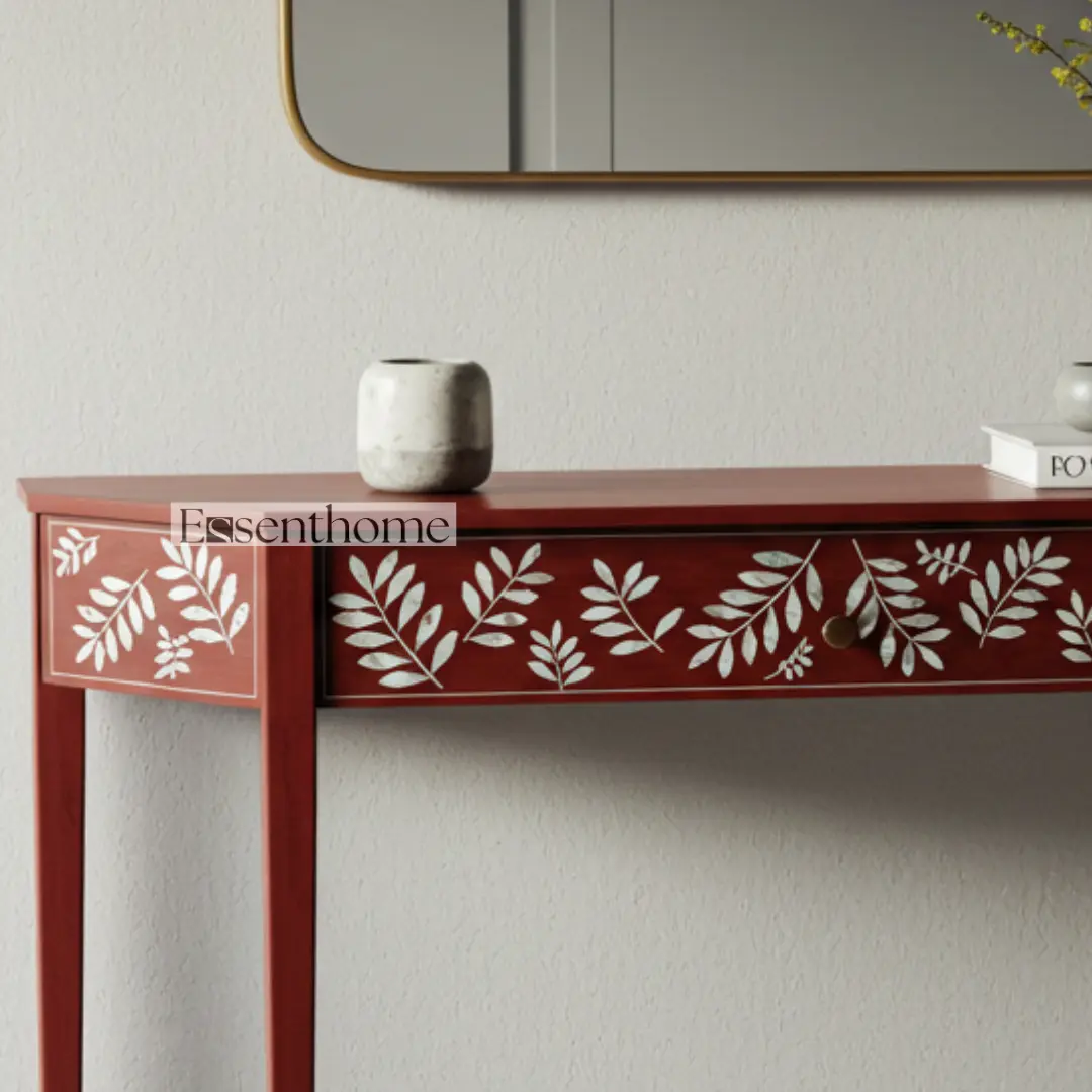 The Essenthome Red Mother of Pearl Inlay Console Table – Handmade Floral Pattern is more than just a functional piece of furniture—it is a statement of artistry, elegance, and craftsmanship. Its bold red color, intricate floral Mother of Pearl inlay, and practical design make it a versatile addition to any home. Whether you want a luxurious console for your entryway, a stylish accent for your living room, or a unique vanity table in your bedroom, this handcrafted console table blends beauty, functionality, and timeless design, making it an investment in both style and quality