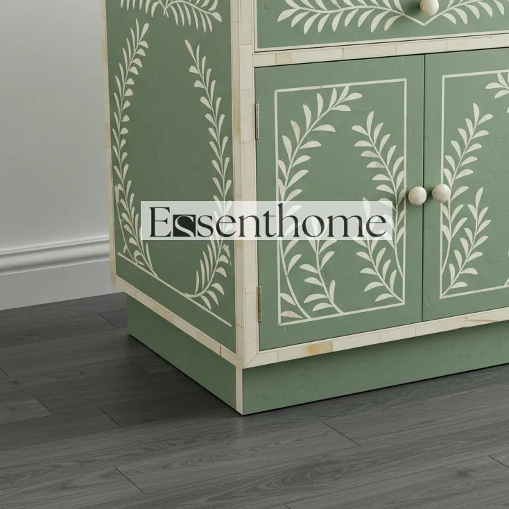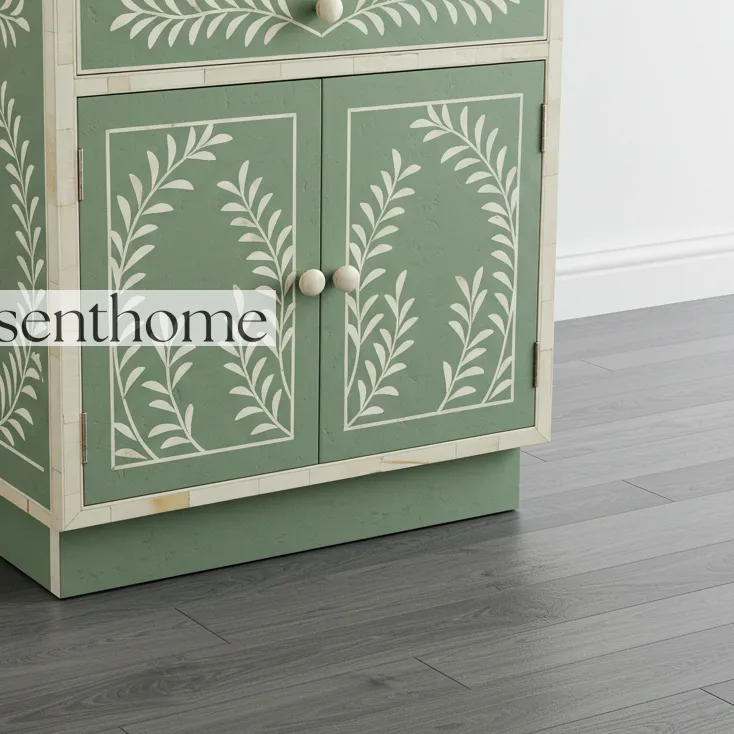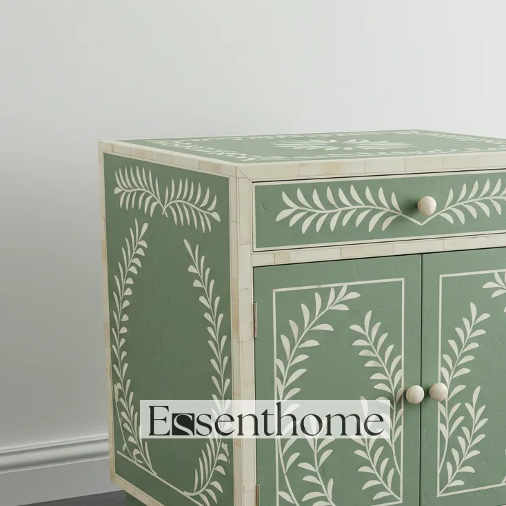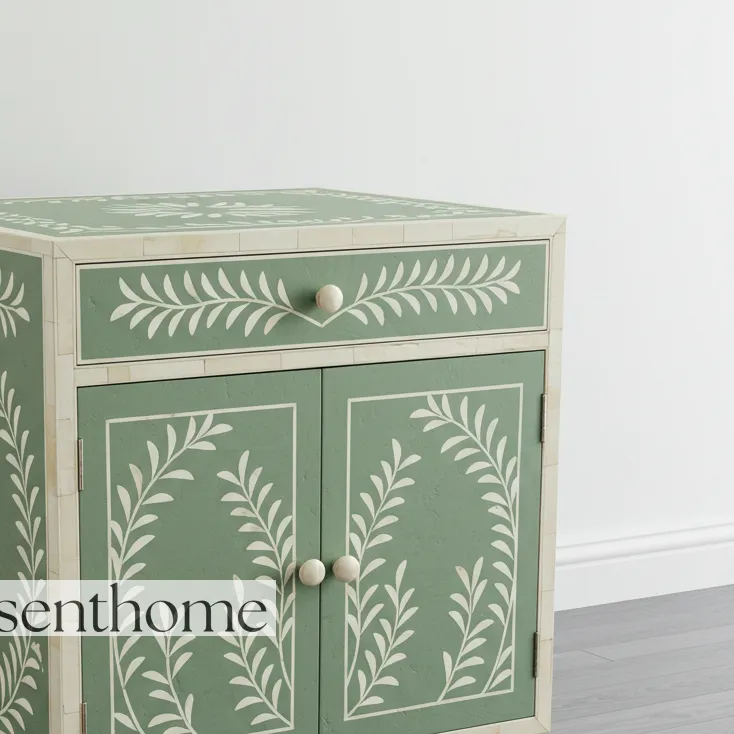 Bring a fresh and elegant touch to your bedroom with the Light Green & White Bone Inlay Nightstand. This handcrafted artisan bedside table features delicate floral bone inlay patterns, carefully created by skilled artisans, making each piece unique. The soothing light green paired with crisp white inlay adds a subtle yet stylish charm, enhancing any bedroom décor.
