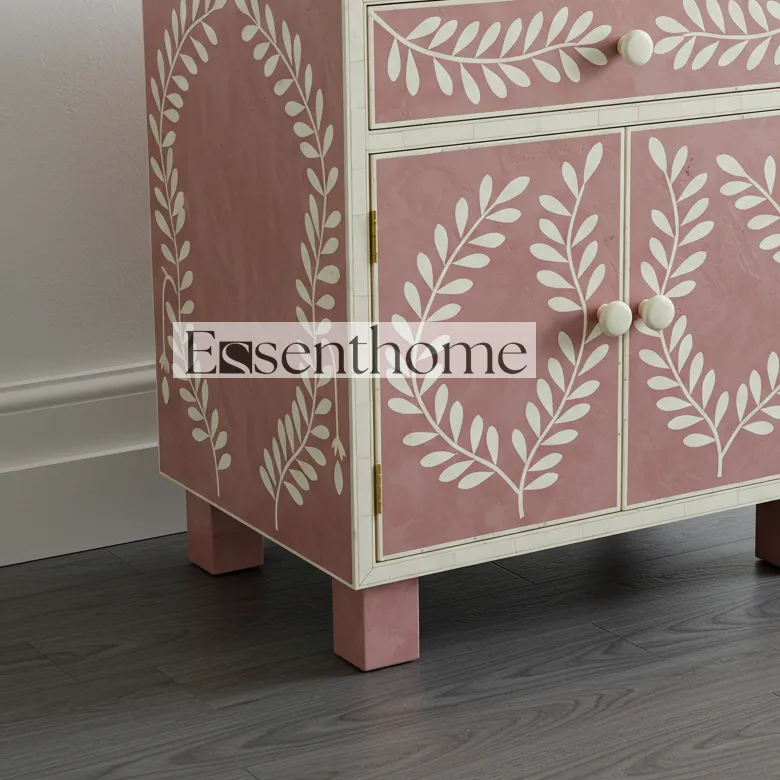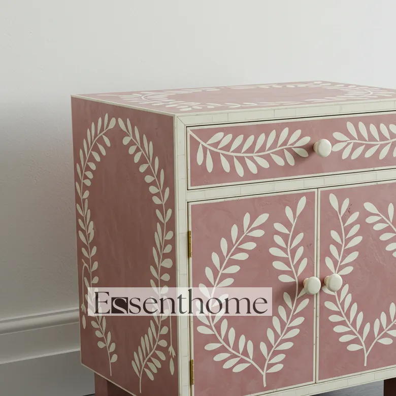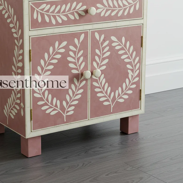 Bring timeless elegance and artisan craftsmanship into your home with this Handcrafted Bone Inlay Bedside Table in a soft pink and white floral design. Skilled artisans individually craft each piece, carefully placing every fragment of bone to create intricate floral patterns that celebrate both tradition and artistry. The subtle pink tones paired with crisp white inlay work add a graceful charm, making this bedside table an eye-catching accent in any bedroom.