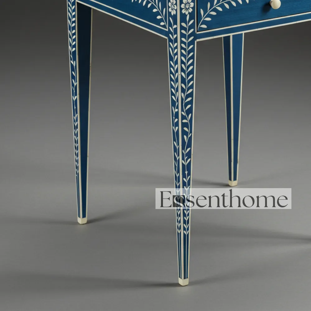Enhance your home décor with the Bone Inlay Stool with Drawer by Essenthome, a perfect blend of artistry and functionality. Handcrafted by skilled artisans, this elegant stool features a striking blue and white floral bone inlay design set on a sturdy solid wood frame. The delicate floral patterns reflect traditional craftsmanship, making this furniture piece both a practical utility and a decorative accent.