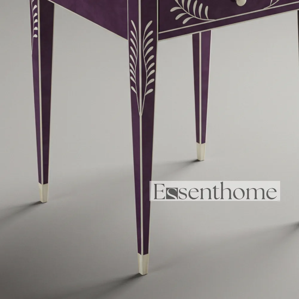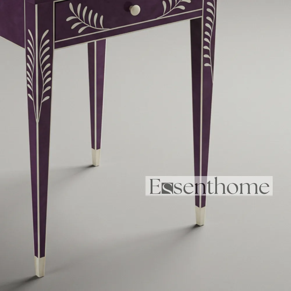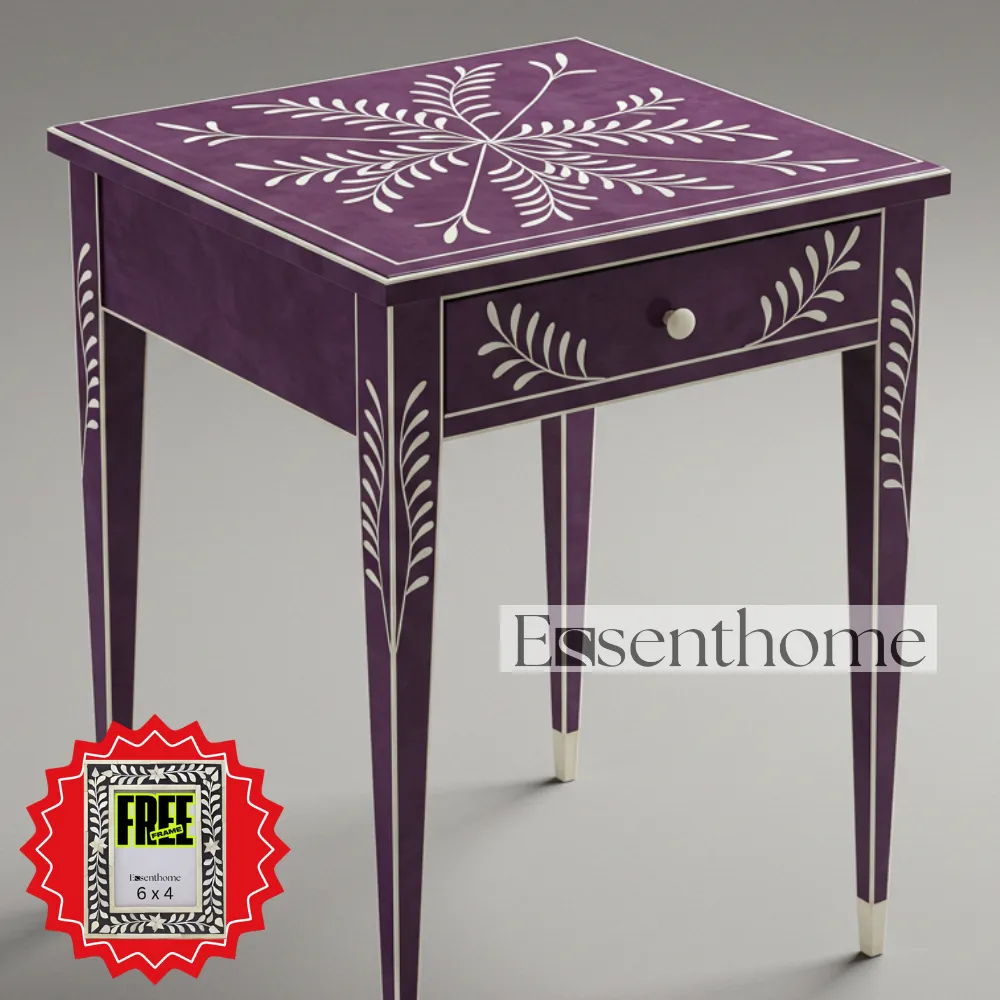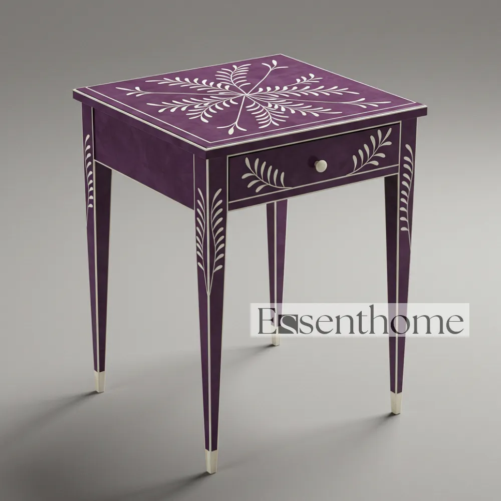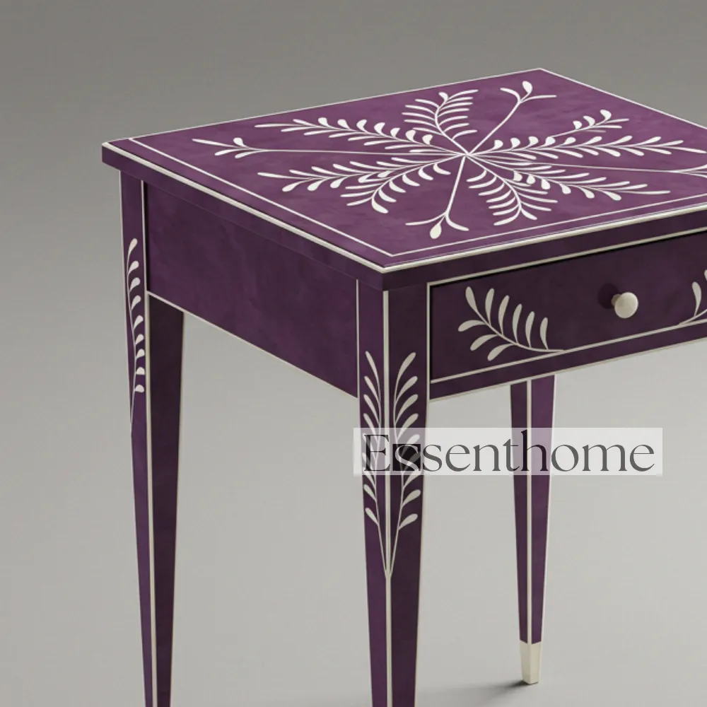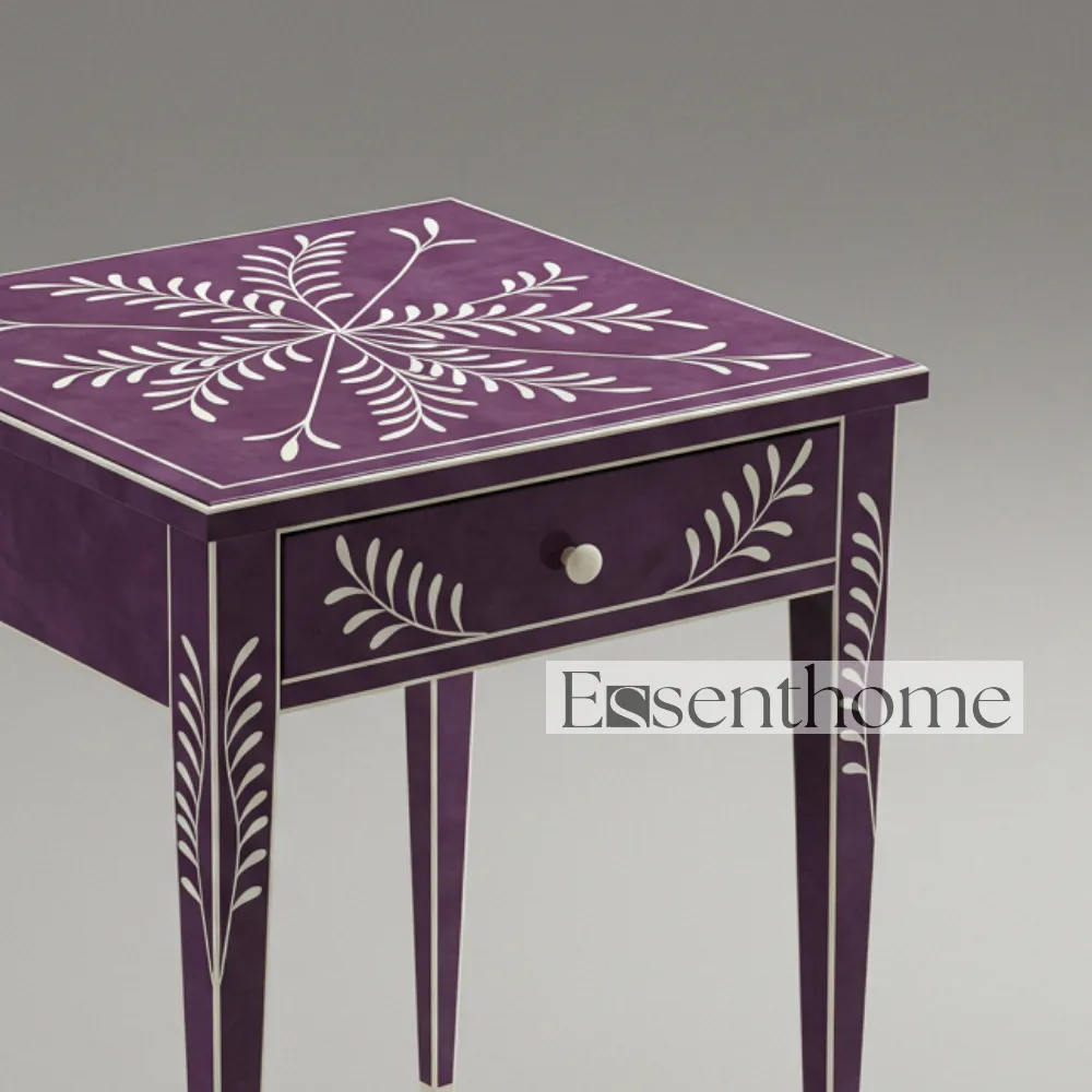 Enhance your home décor with the Purple & White Bone Inlay Side Table with Drawer – Handcrafted by Essenthome. This exquisite piece features a vibrant purple tabletop adorned with delicate white floral bone inlay patterns. Each table is meticulously handcrafted by skilled artisans, making every piece unique. Combining traditional bone inlay craftsmanship with modern design, it serves as both a functional furniture piece and a decorative work of art.