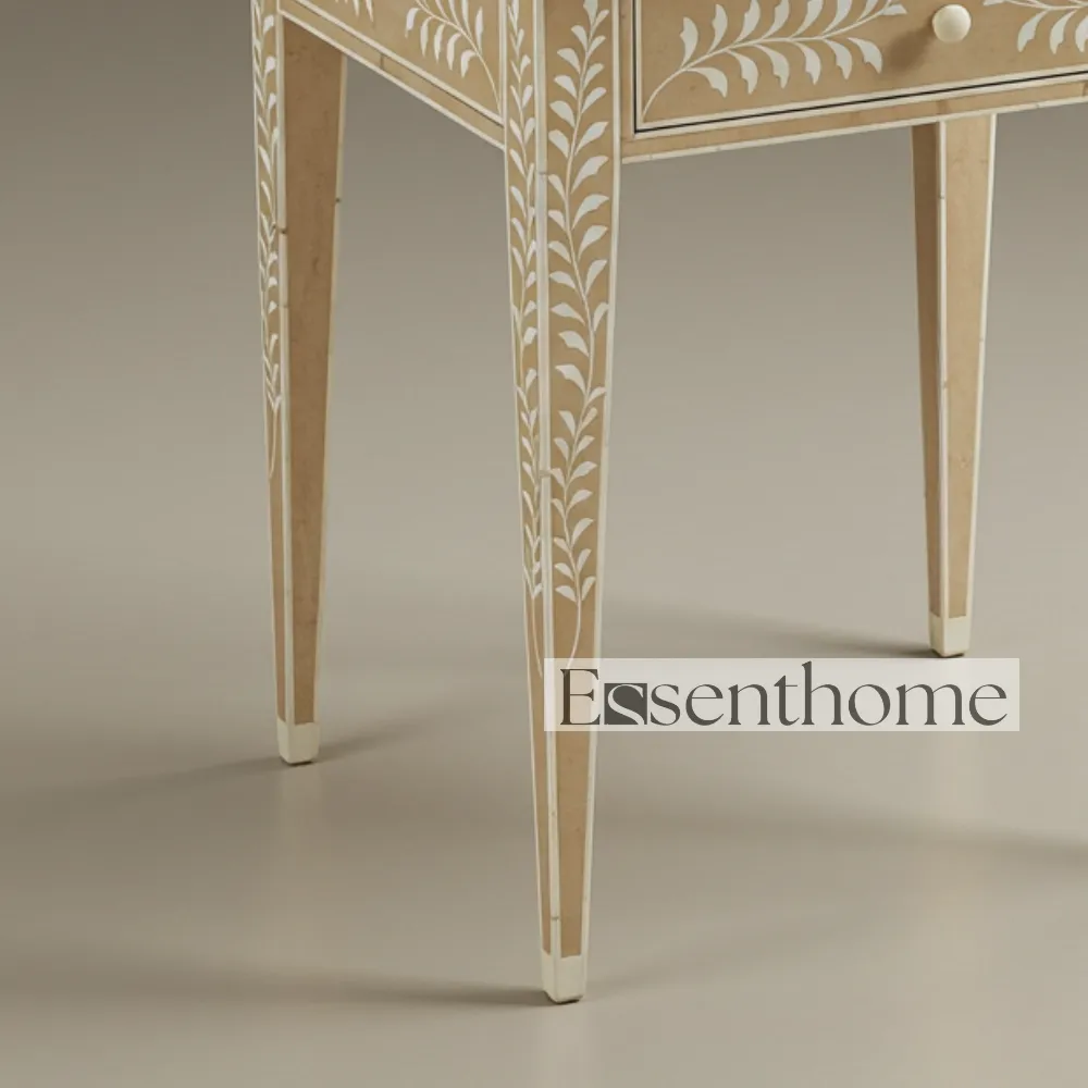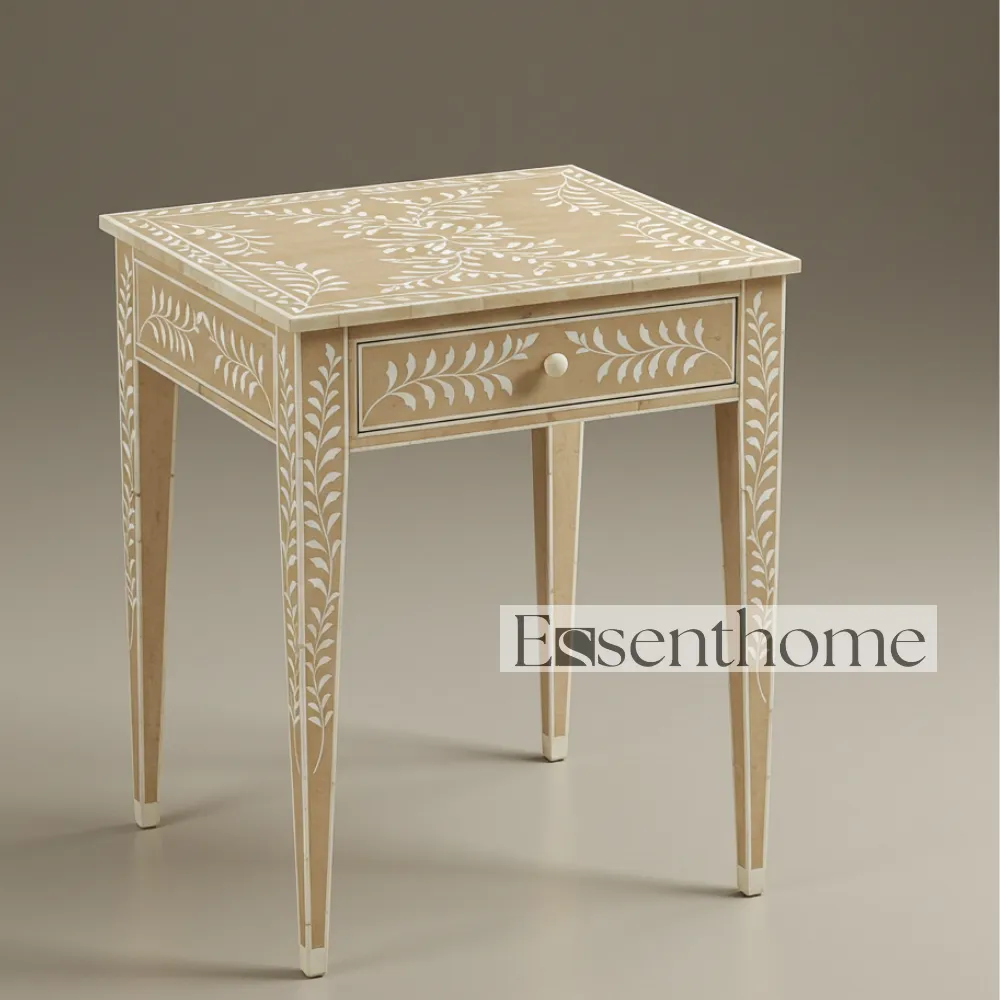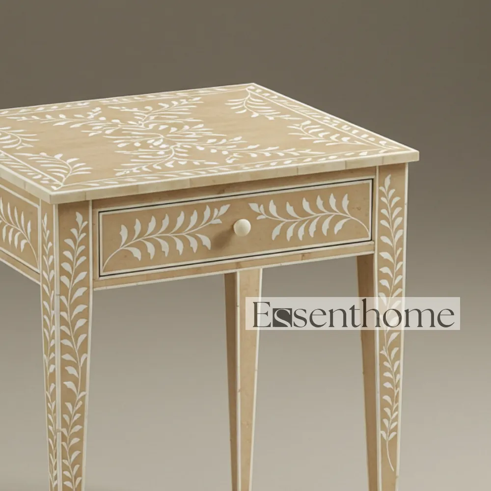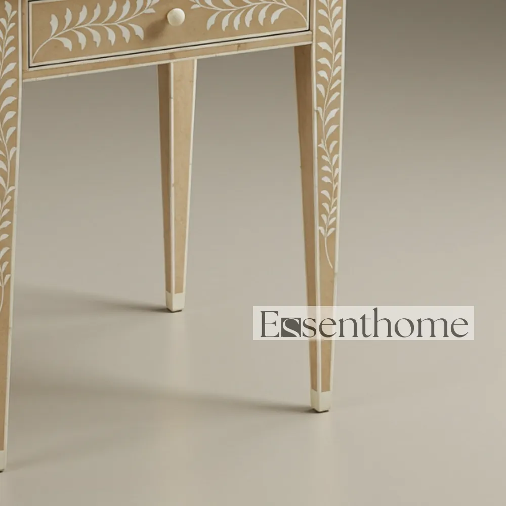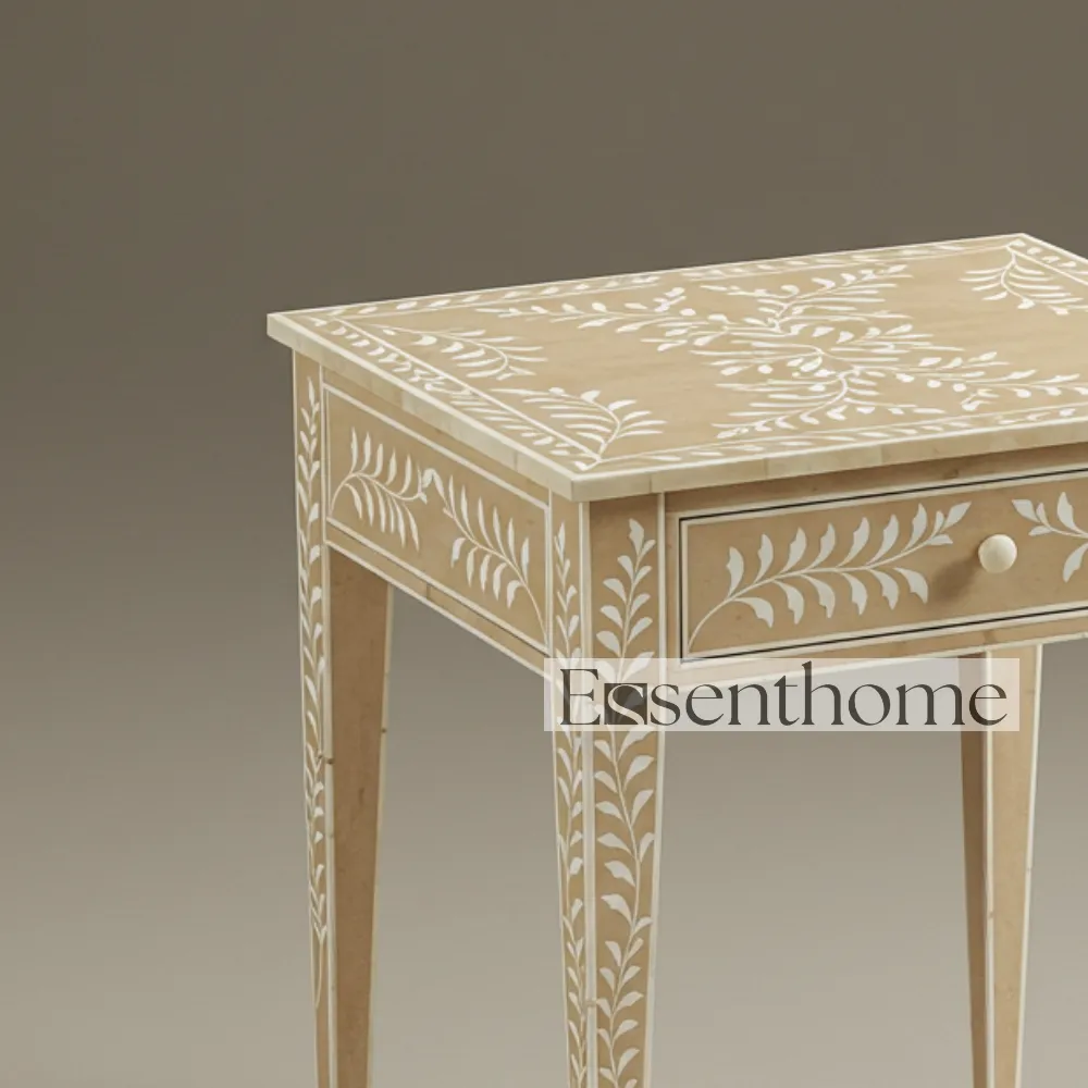 Add timeless charm and functionality to your home with the Bone Inlay Square Stool by Essenthome. Handcrafted by skilled artisans, this elegant furniture piece features a sophisticated tan and white floral bone inlay design on a sturdy solid wood frame. The intricate detailing highlights traditional bone inlay craftsmanship, making it both a practical stool and a decorative accent for your interiors.