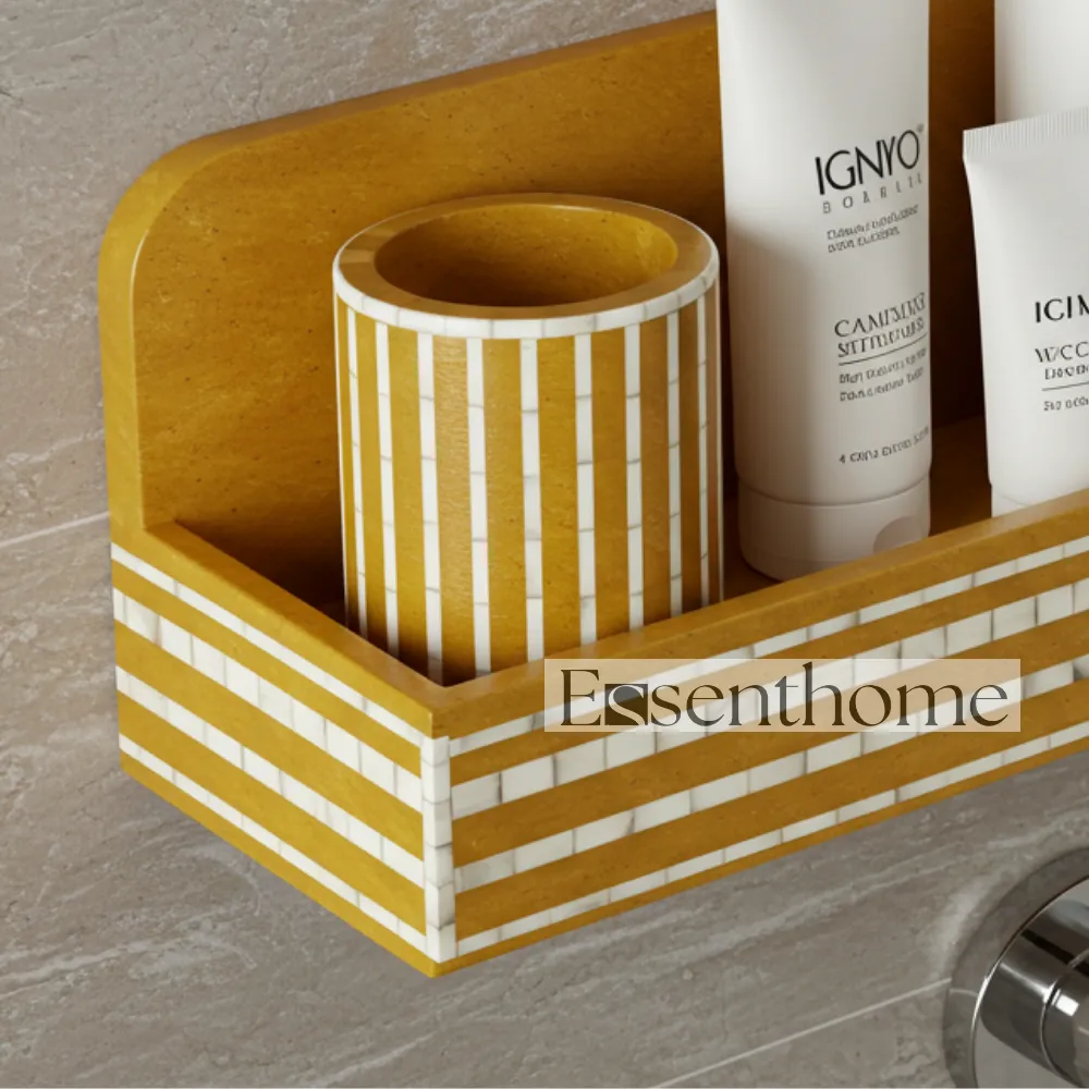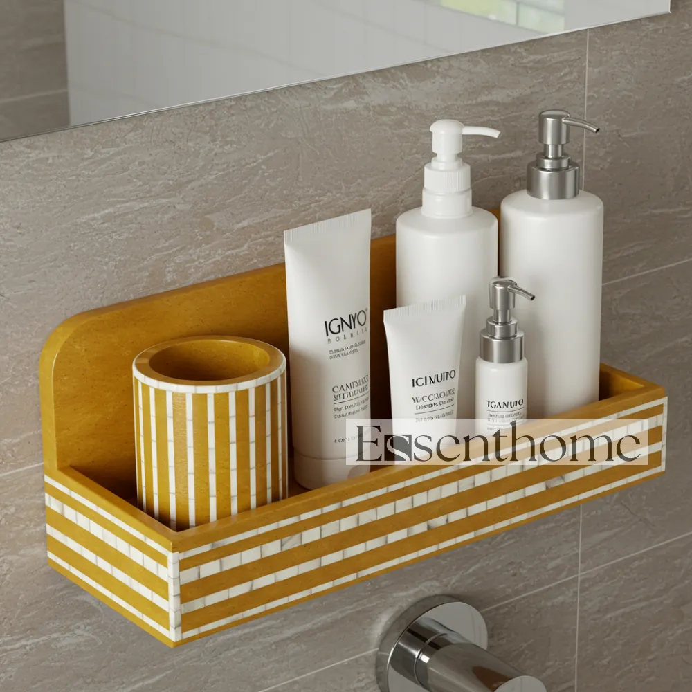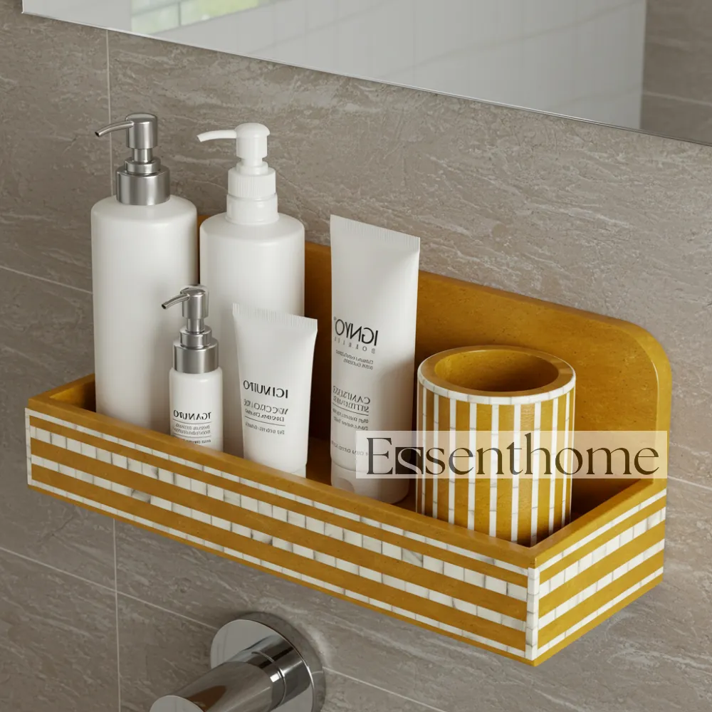 Bring elegance and organization to your bathroom with this Handcrafted Yellow Bone Inlay Wall Shelf, a stylish and functional Yellow Bone Inlay Bathroom Organizer. Made from durable solid wood and adorned with ethically sourced bone inlay in a cheerful yellow floral pattern, this wall-mounted organizer adds a touch of artisanal charm to any bathroom décor.