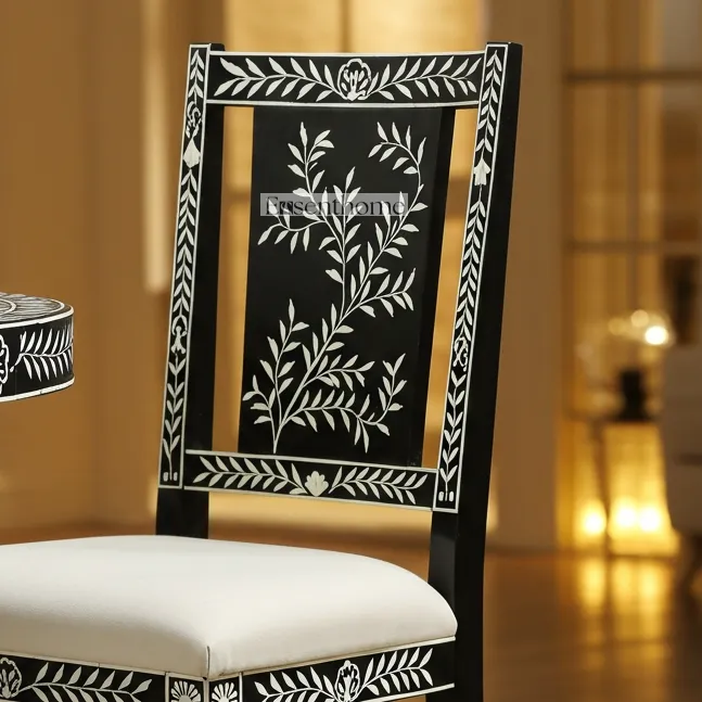 Bring timeless elegance into your home with the Handcrafted Bone Inlay Dining Chair by Essenthome. Crafted with precision by skilled artisans, this striking chair showcases a deep black resin base beautifully adorned with delicate white bone inlay floral and leaf motifs. The intricate detailing on the backrest, legs, and frame reflects centuries of traditional craftsmanship while offering a sophisticated, modern appeal.