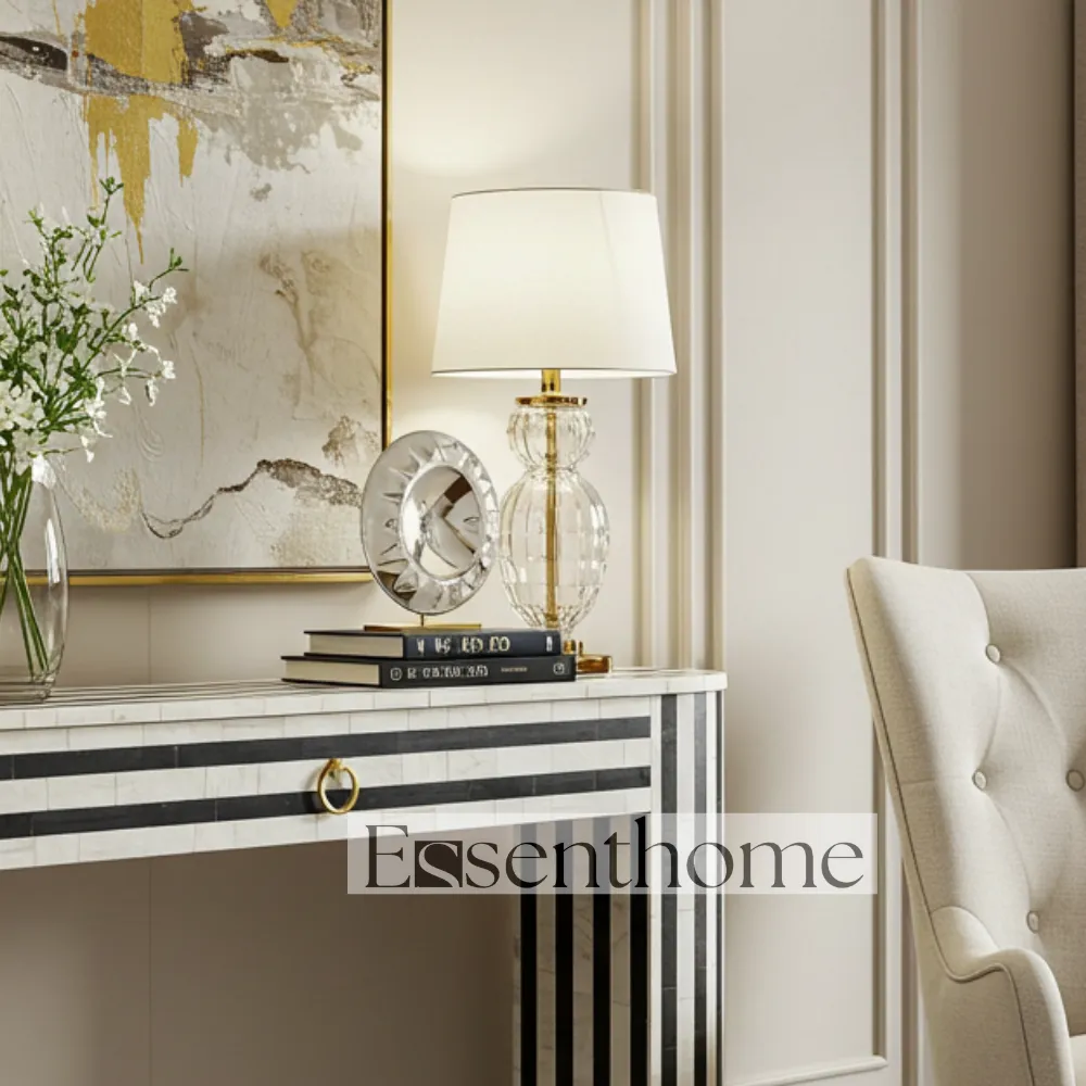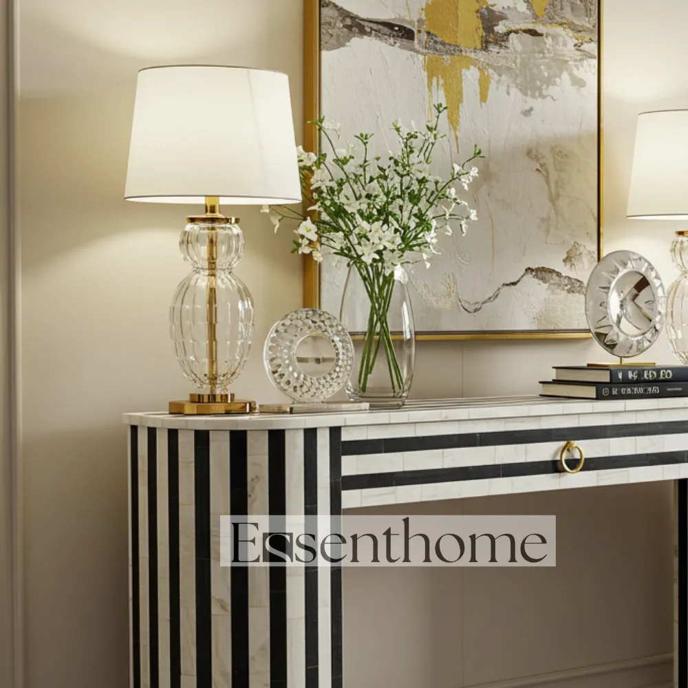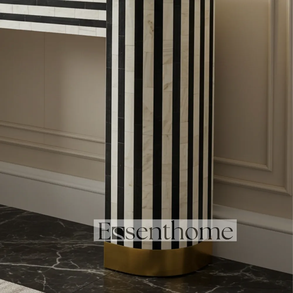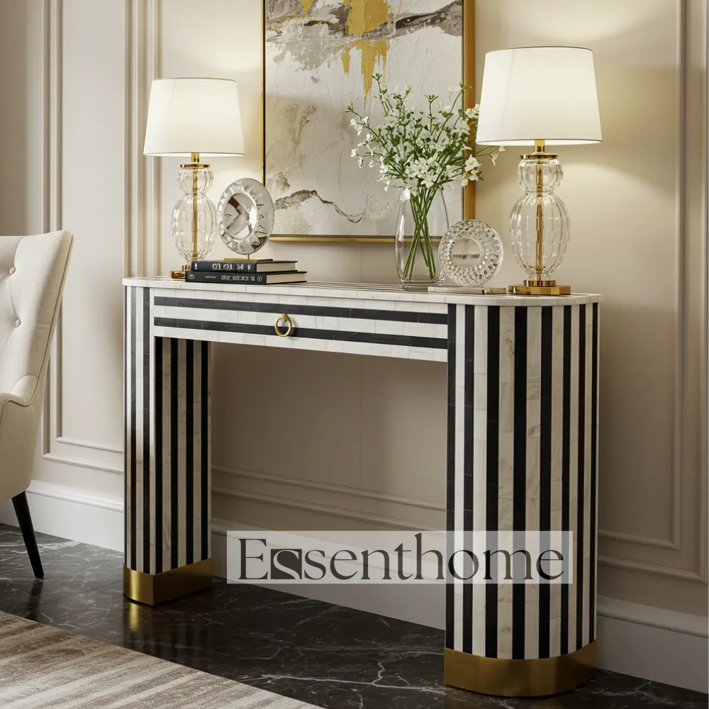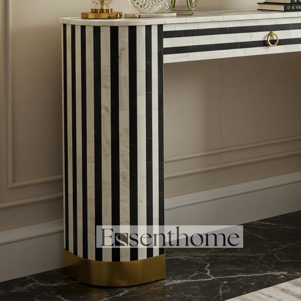 Add timeless elegance and functionality to your home with the Bone inlay console for living room by Essenthome. Carefully crafted by skilled artisans, this console table features a sturdy wooden structure enhanced with intricate bone inlay patterns, creating a striking piece of furniture that blends beauty with durability.