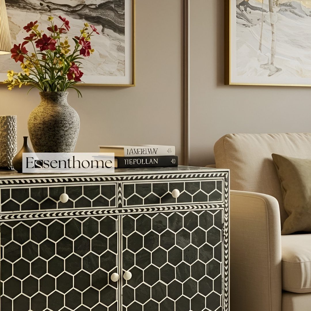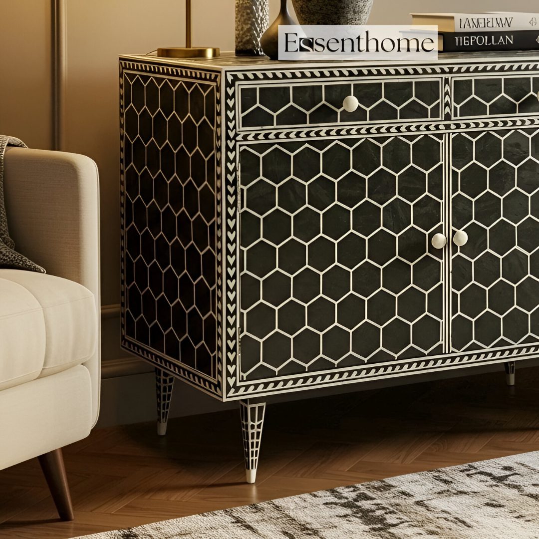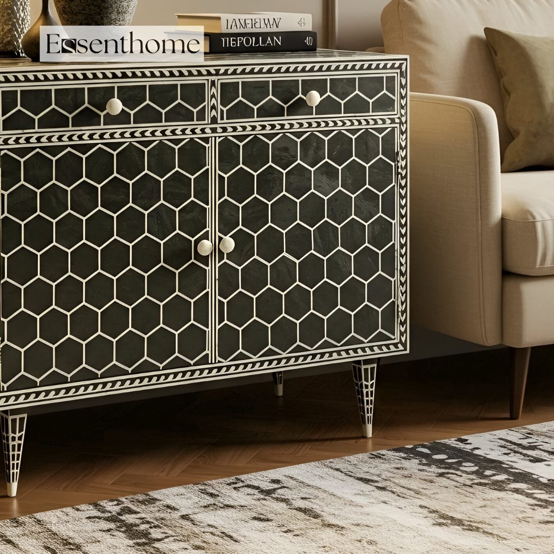 Add a sophisticated touch to your interiors with this handcrafted Bone Inlay Black and White Dresser. Inspired by timeless Indian craftsmanship, this piece is made by skilled artisans using ethically sourced camel bone, meticulously hand-carved and inlaid into a smooth black resin surface to create a striking honeycomb design.
