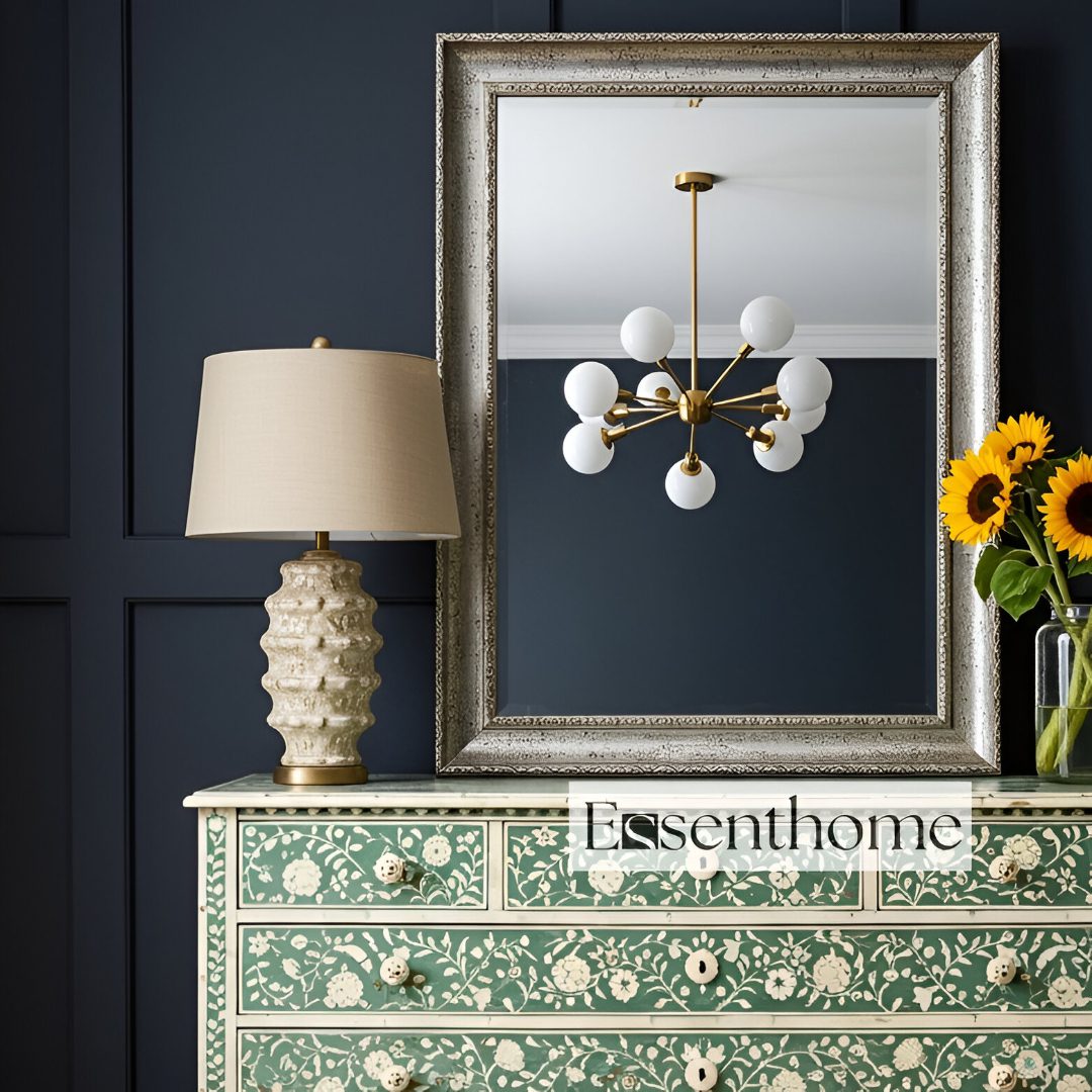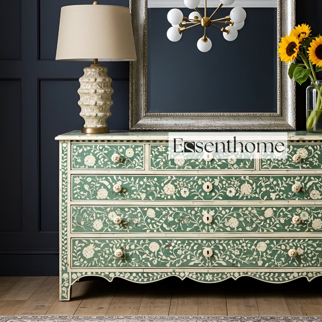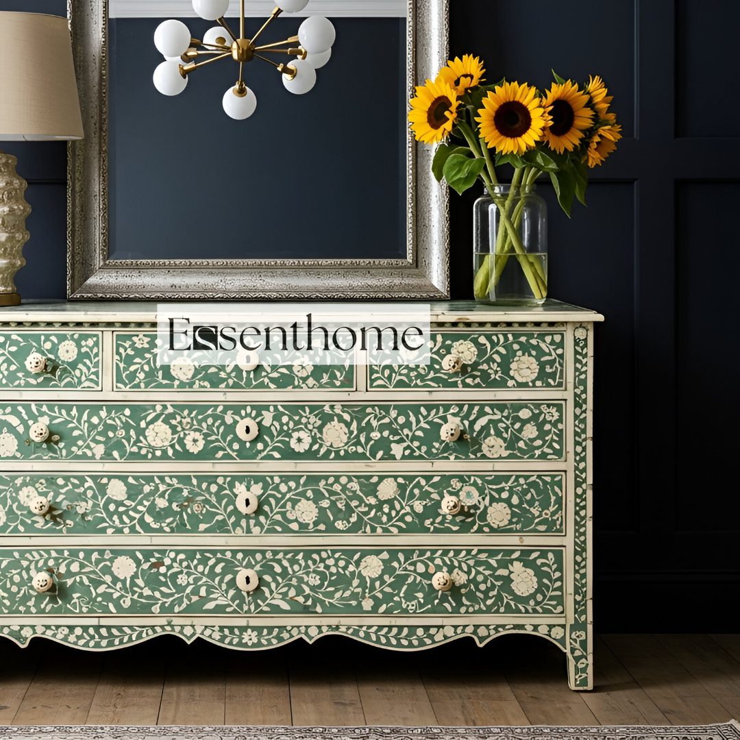 Each dresser is handcrafted by skilled Indian artisans using traditional bone inlay techniques. As they carve and arrange each floral motif, they bring generations of artistry into every detail. Consequently, the surface becomes a rich tapestry of texture and design. A solid wood frame provides strength and durability, while the intricate craftsmanship adds warmth and character to your décor.