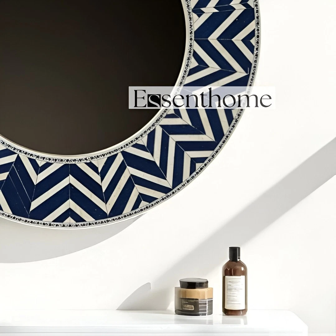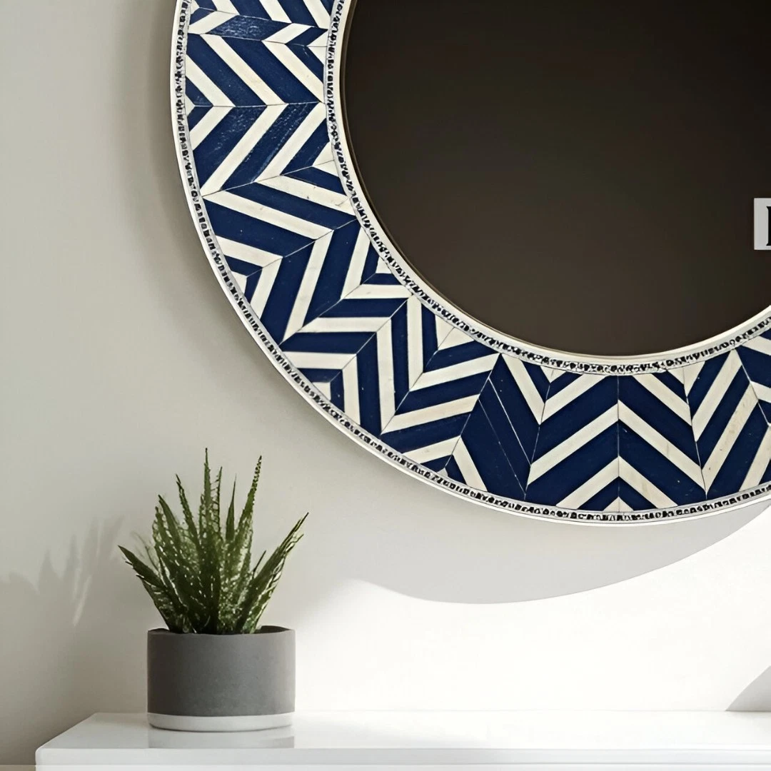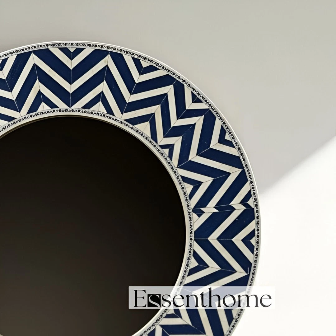 Add artistic charm and timeless craftsmanship to your space with this Handmade Round Blue Bone Inlay Mirror, showcasing a bold Chevron pattern in rich navy blue and white tones. Handcrafted by skilled artisans in India, each mirror features delicately hand-cut pieces of ethically sourced camel bone, intricately arranged into a stunning chevron design on a smooth resin surface.