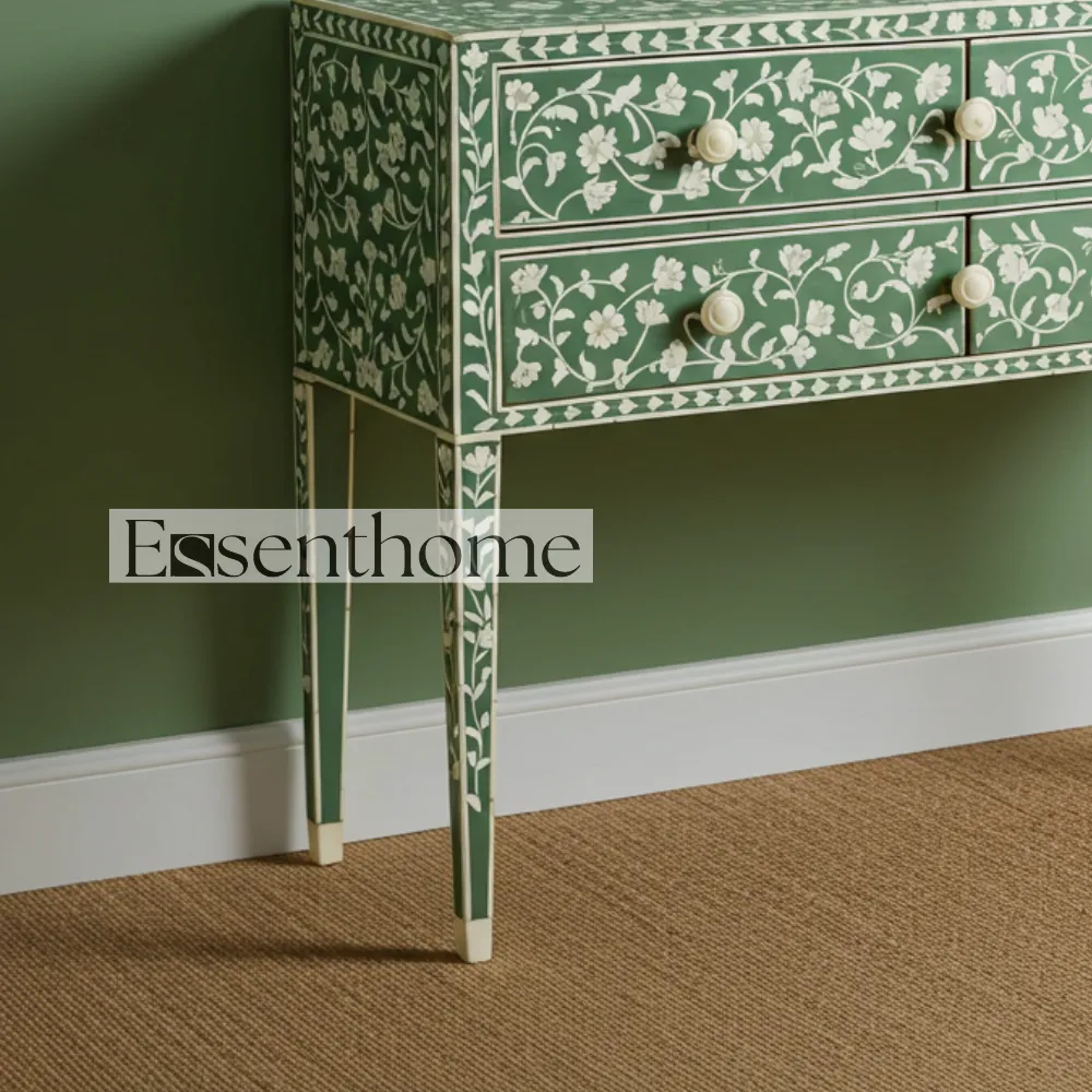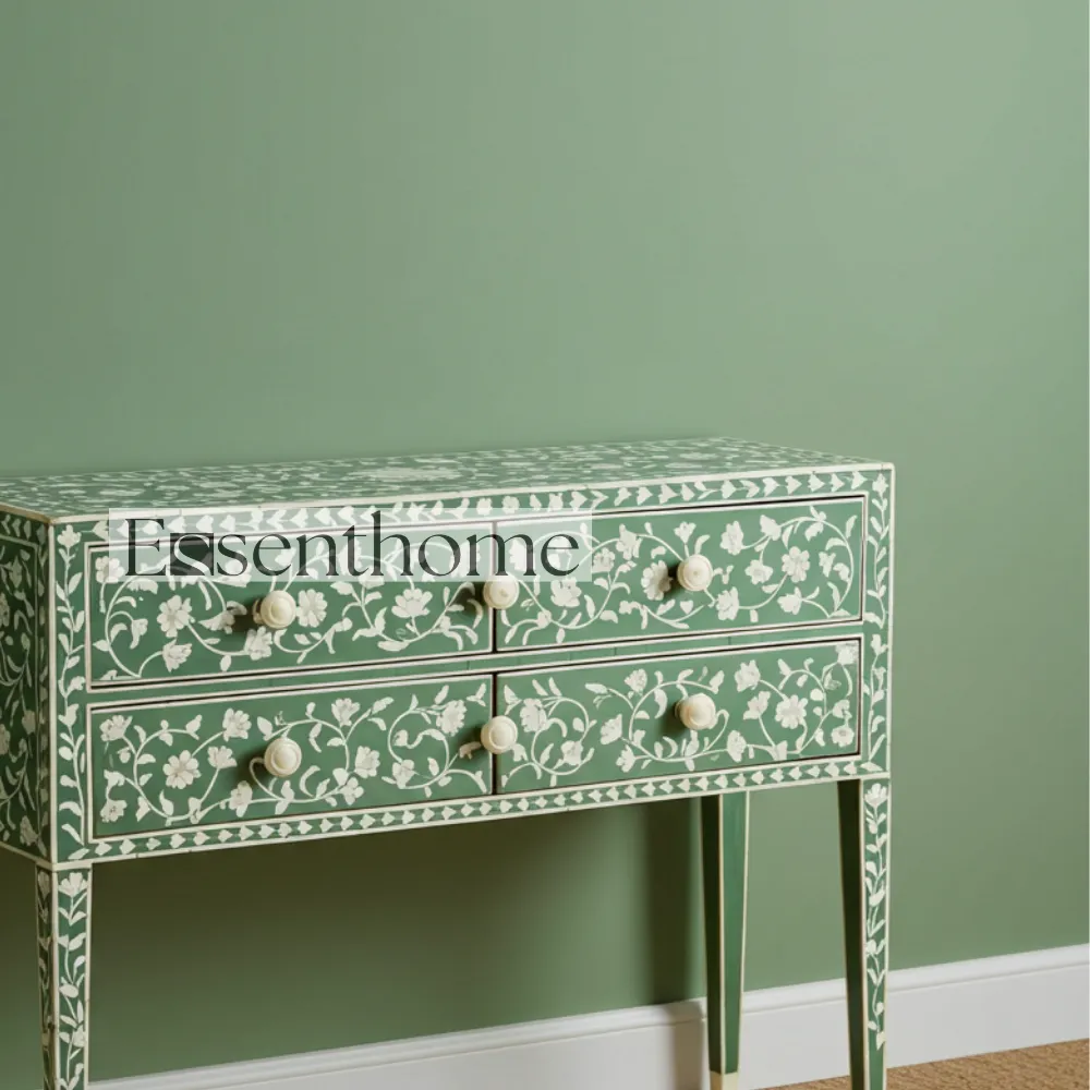 Elevate your interiors with the Luxury Handmade Bone Inlay Console Table in Green by Essenthome ? a perfect blend of artistry, tradition, and functionality. Crafted by skilled artisans, this exquisite bone inlay furniture piece showcases a timeless floral leaf design that adds sophistication and elegance to any home.