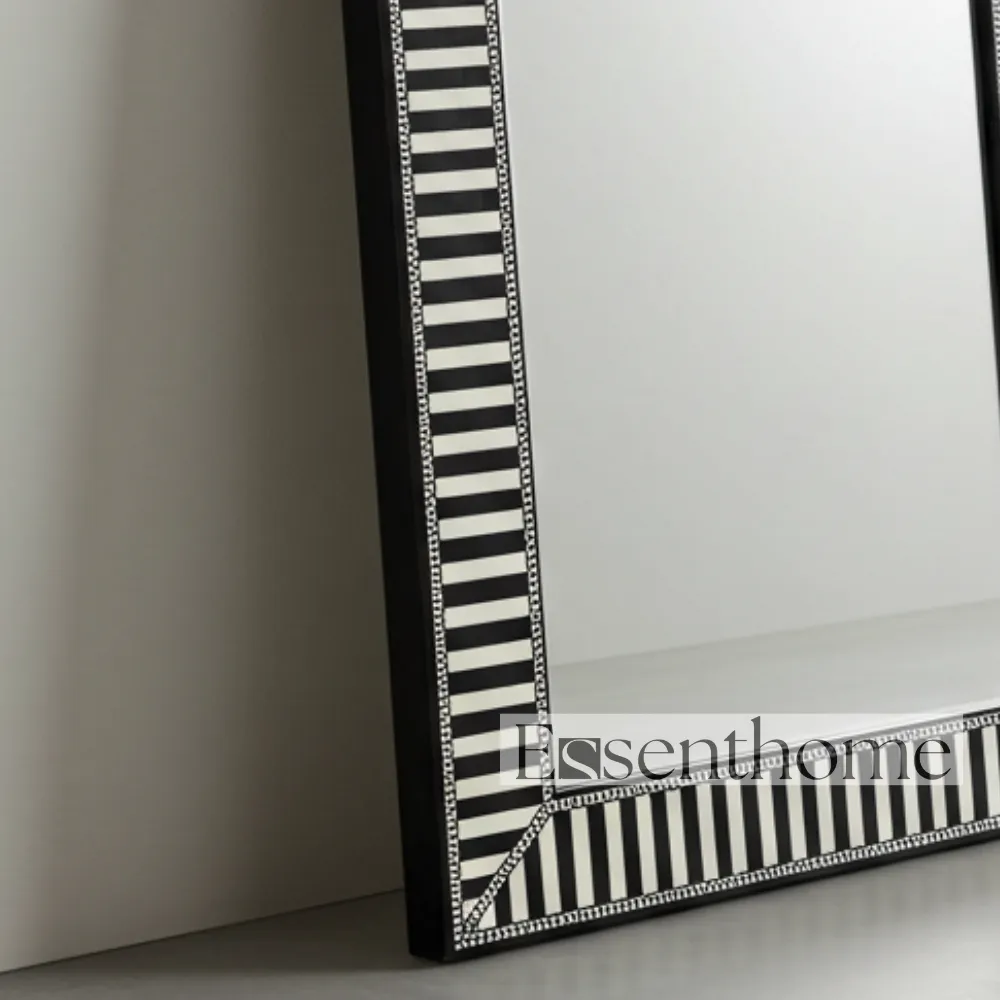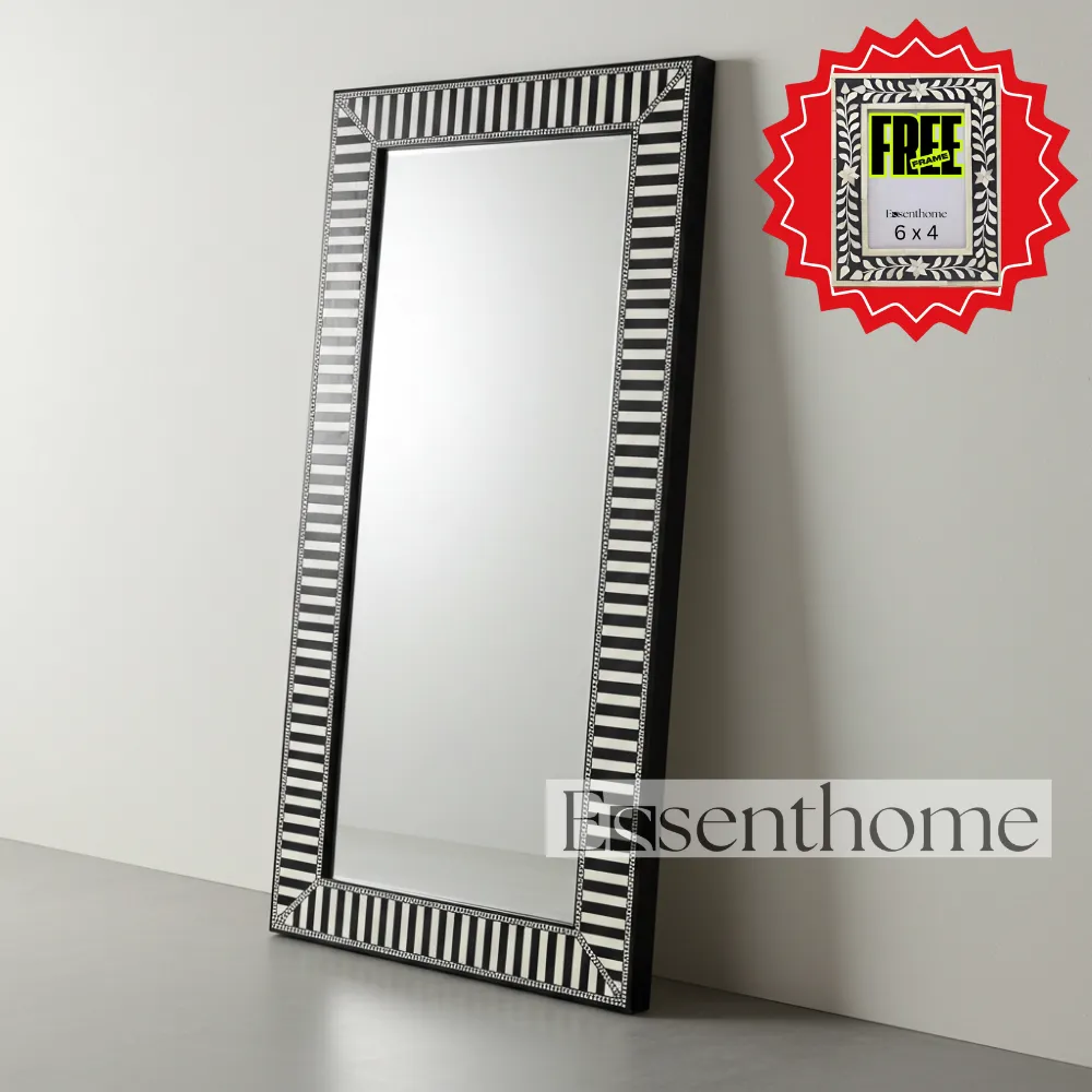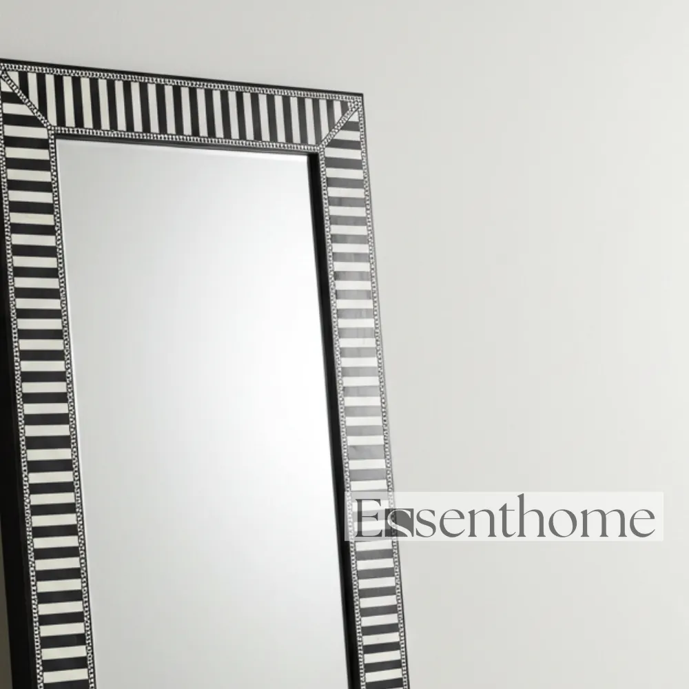 Transform your space with the Essenthome Modern Black & White Floral bone inlay mirror for bedroom , a handcrafted full-length mirror designed to bring elegance and artistry into your home. Featuring intricate floral bone inlay patterns set against a bold black base, this mirror is a stunning blend of tradition and modern style.