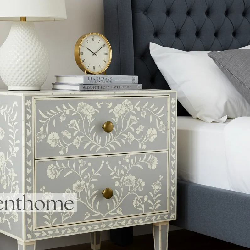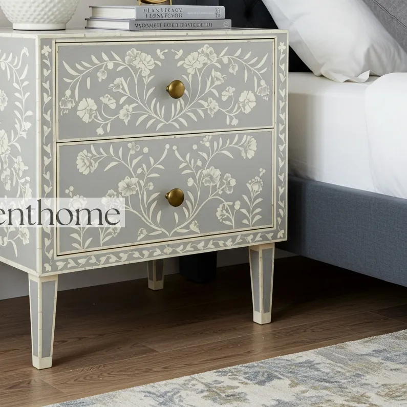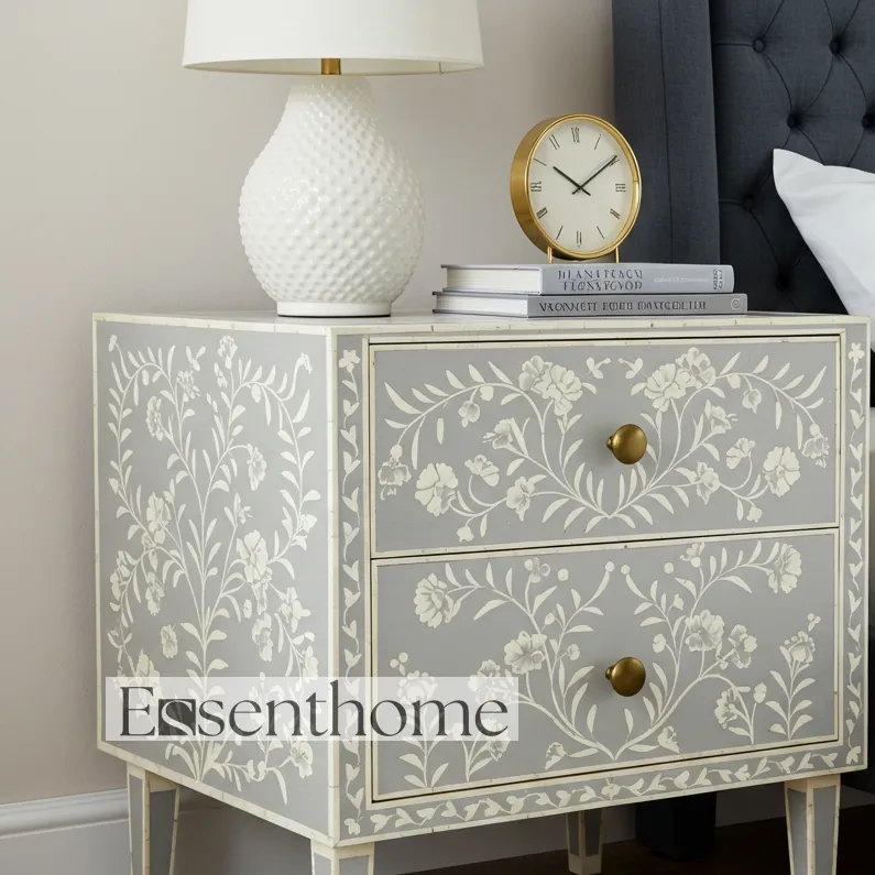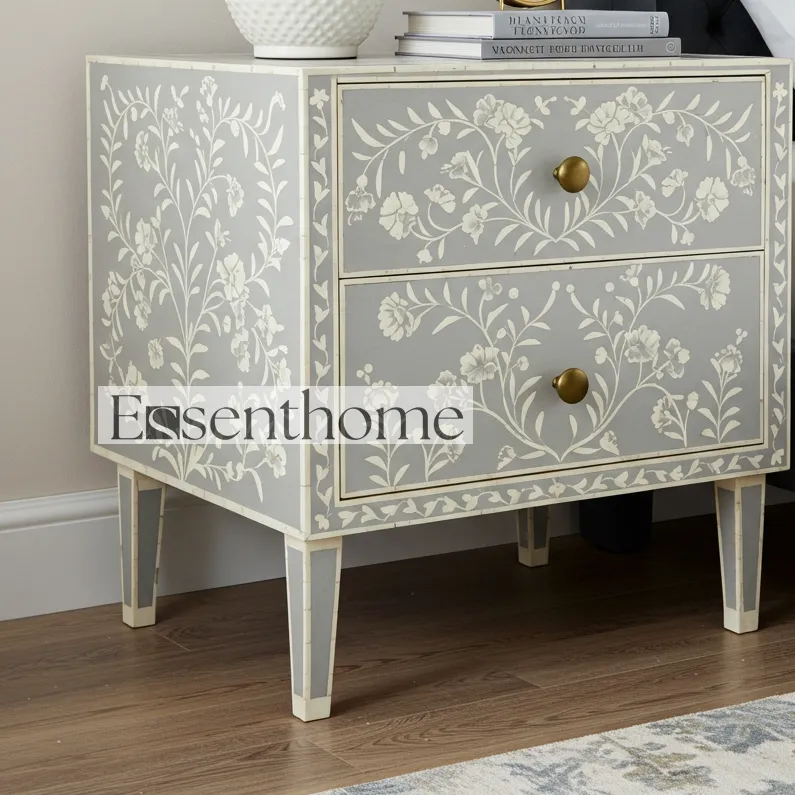 Elevate your bedroom décor with the exquisite Floral Bone Inlay Nightstand , a perfect blend of artistry, craftsmanship, and functionality. This handcrafted nightstand is made from premium-quality wood and features intricately detailed floral bone inlay designs, reflecting the skill and tradition of artisanal craftsmanship. Each Bone Inlay Nightstand is unique, making it not just a furniture piece but a statement of style and elegance for your home.
