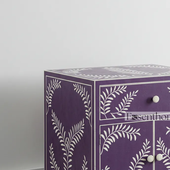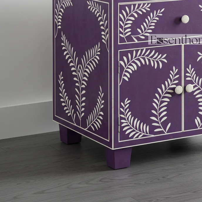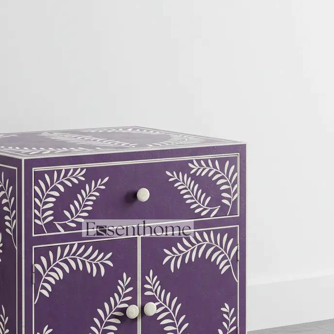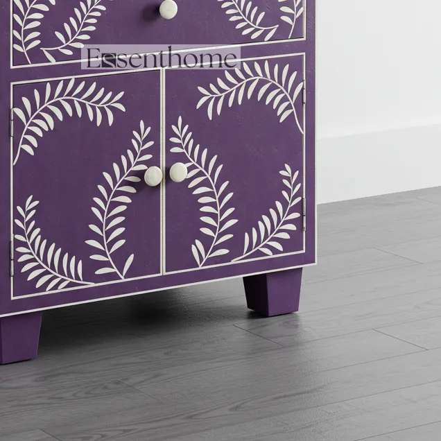 Add a touch of luxury and artistry to your bedroom with this handmade purple Decorative Bone Inlay Nightstand. Expertly crafted by skilled artisans, it features a stunning floral pattern in bone inlay, making each piece truly unique. The rich purple finish enhances its elegant design, making it a striking focal point for any bedside.