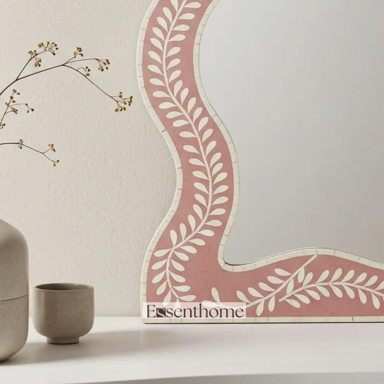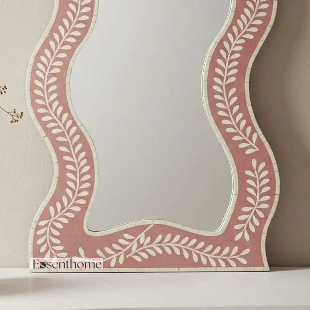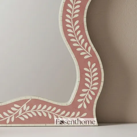 Grace your home with the soft elegance of the Decorative wall mirror – Rose Veil Pink Bone Inlay Design. This stunning mirror is handcrafted with traditional bone inlay techniques. It features a delicate floral motif set against a romantic rose pink resin background.