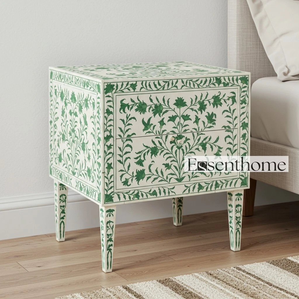 White and Green Bone Inlay Nightstand – Handmade Floral Bedside Table