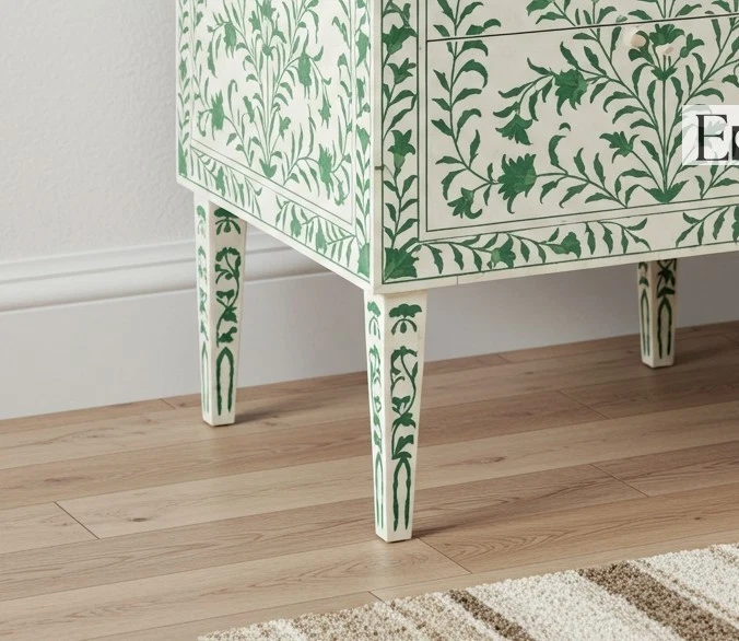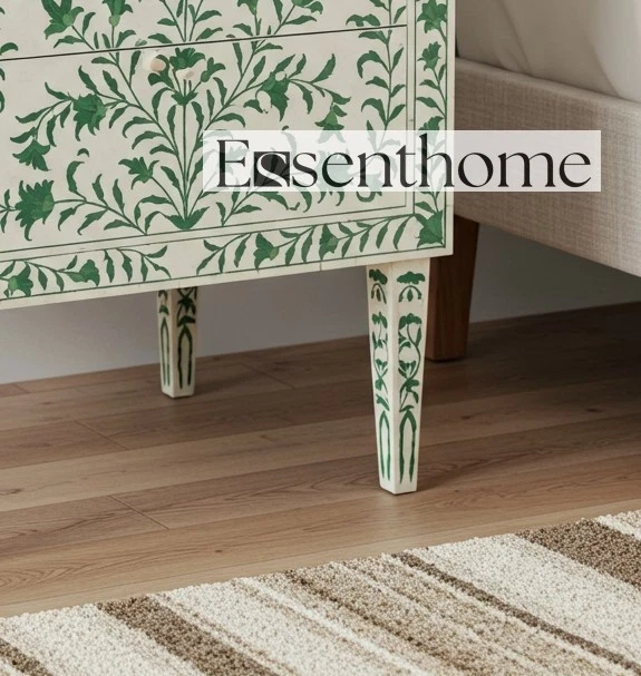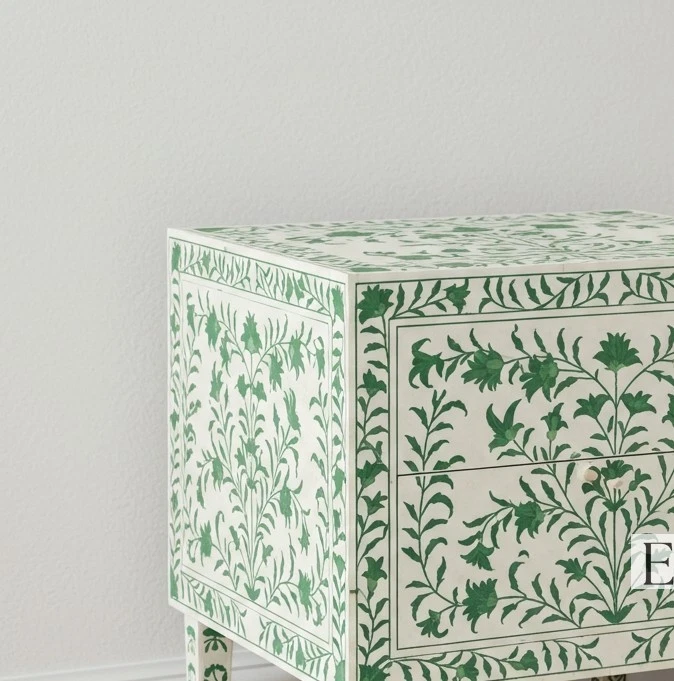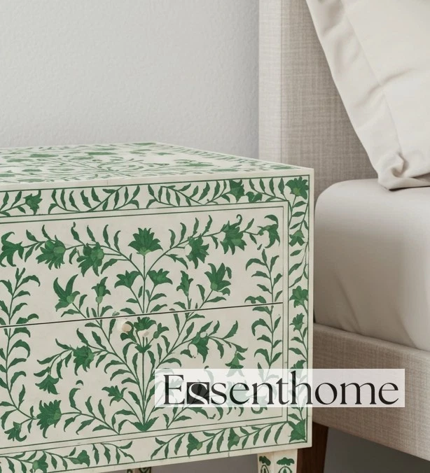 Skilled artisans from Rajasthan, India, handcraft every inch of this nightstand using traditional bone inlay techniques passed down through generations. They carefully carve each floral motif from ethically sourced camel bone and intricately set it into a smooth white resin base. The vibrant green floral patterns breathe life into the neutral background, creating an elegant and calming contrast.
