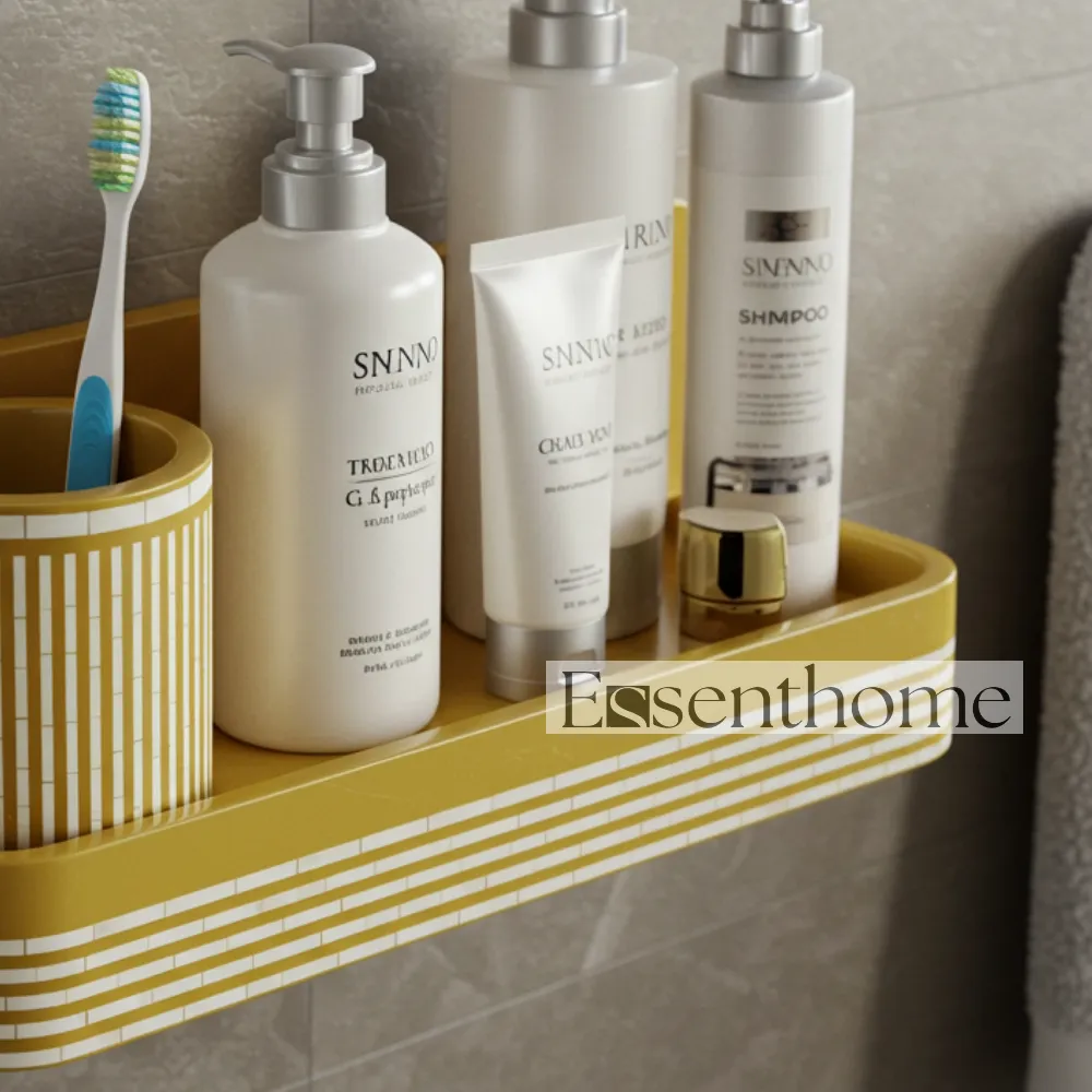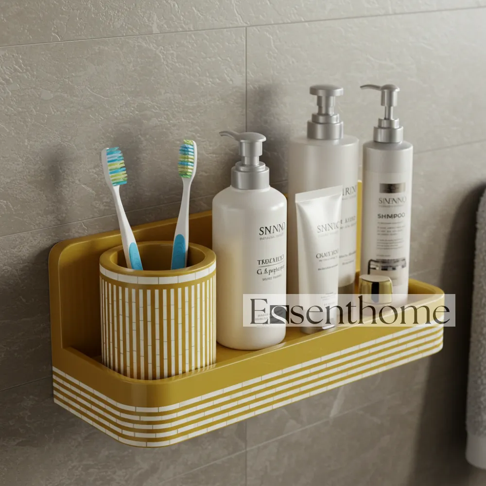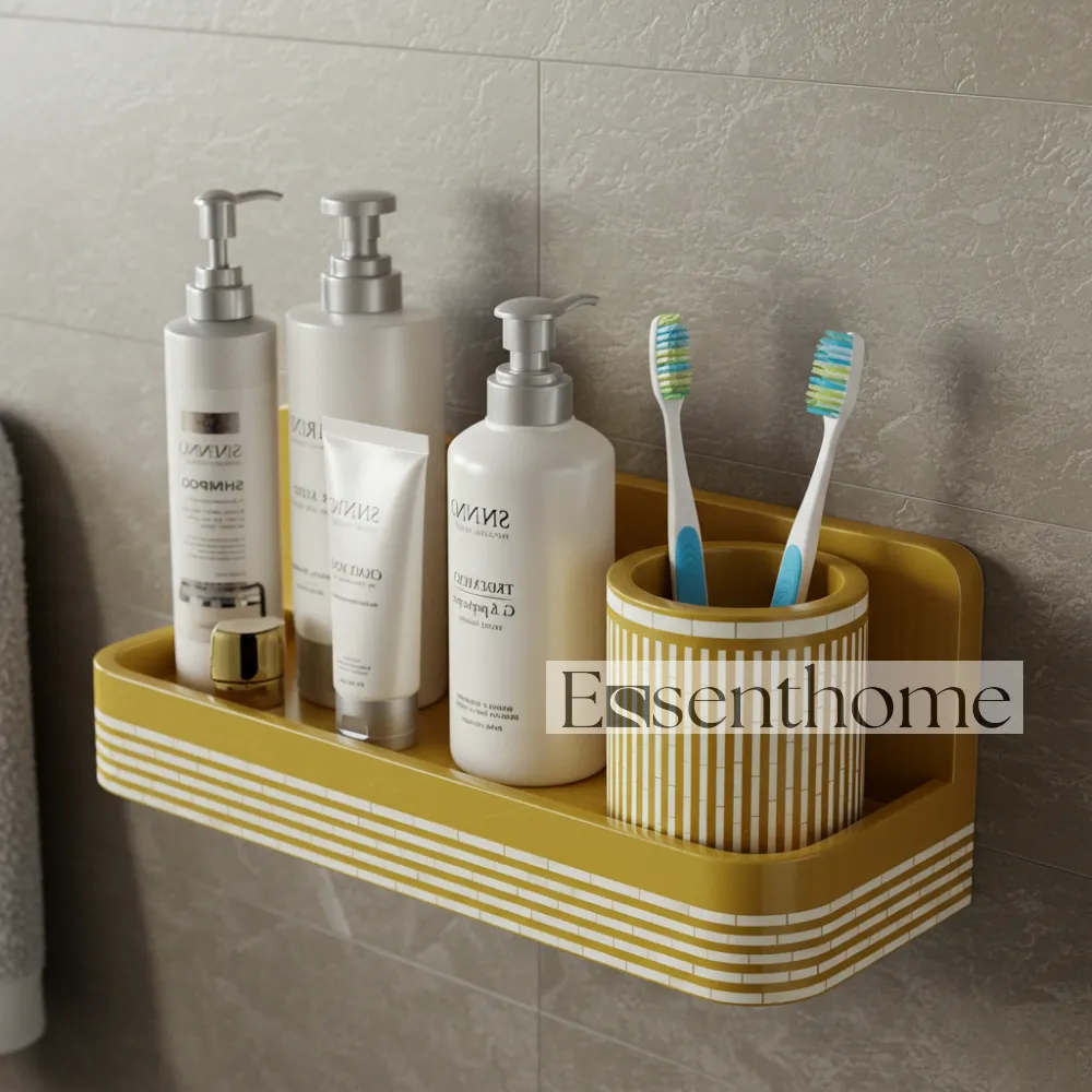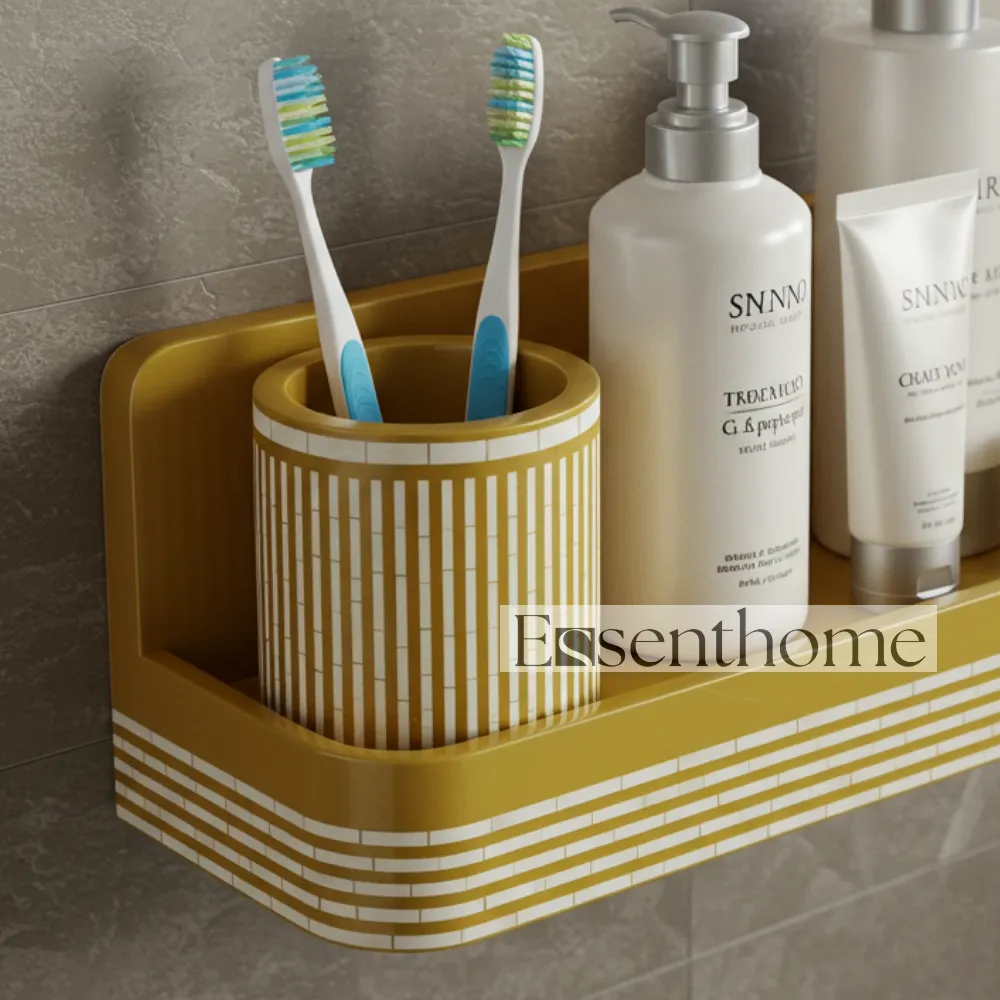 Organize your bathroom in style with this Bone Inlay Bathroom Shelf with Toothbrush Cup in a vibrant yellow finish. Handcrafted from durable solid wood, this wall-mounted shelf includes a convenient toothbrush cup, making it perfect for storing toothbrushes, toothpaste, and other small bathroom essentials.